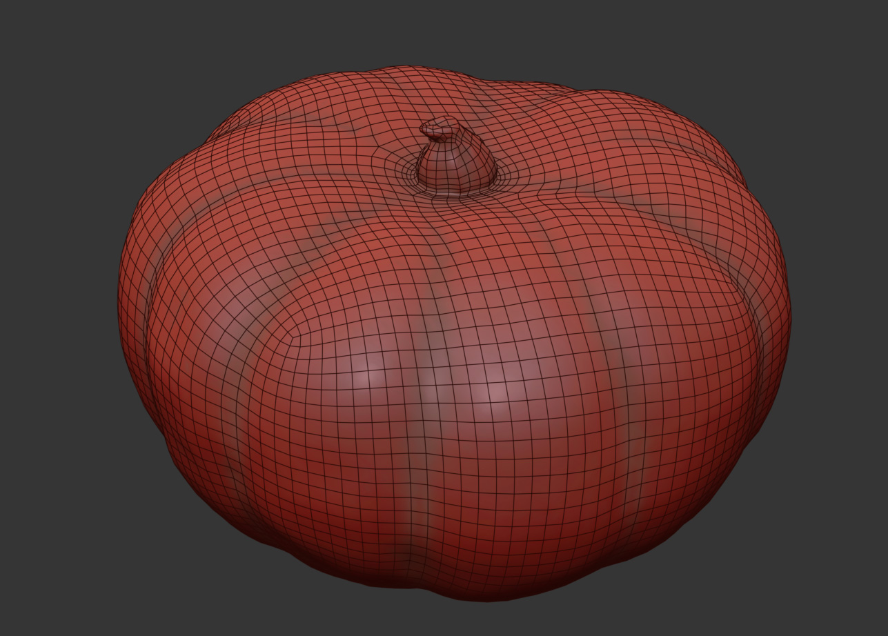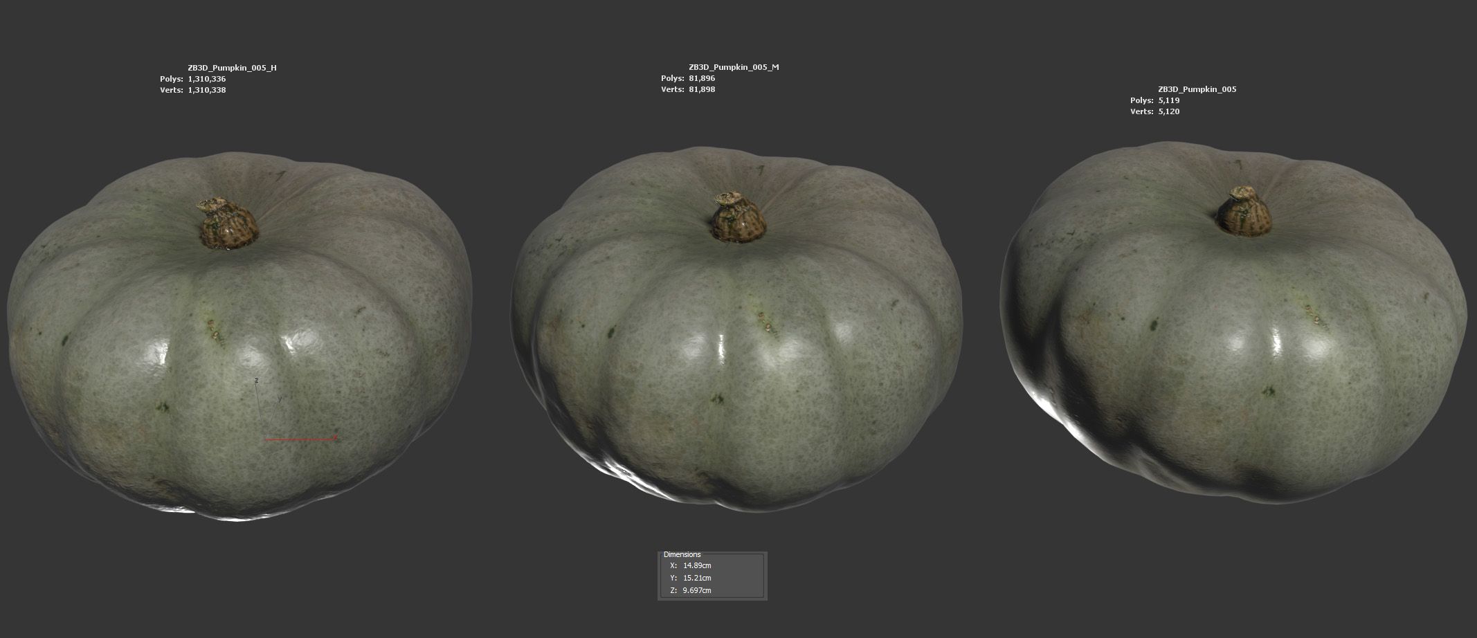 The pumpkin model is presented as a single mesh in 3 subdivision levels: low, mid, and high. Meshes are quad based. The polycounts are 5K, 81K, and 1310K. The high-detail model is included in .max, .fbx, and .obj formats.