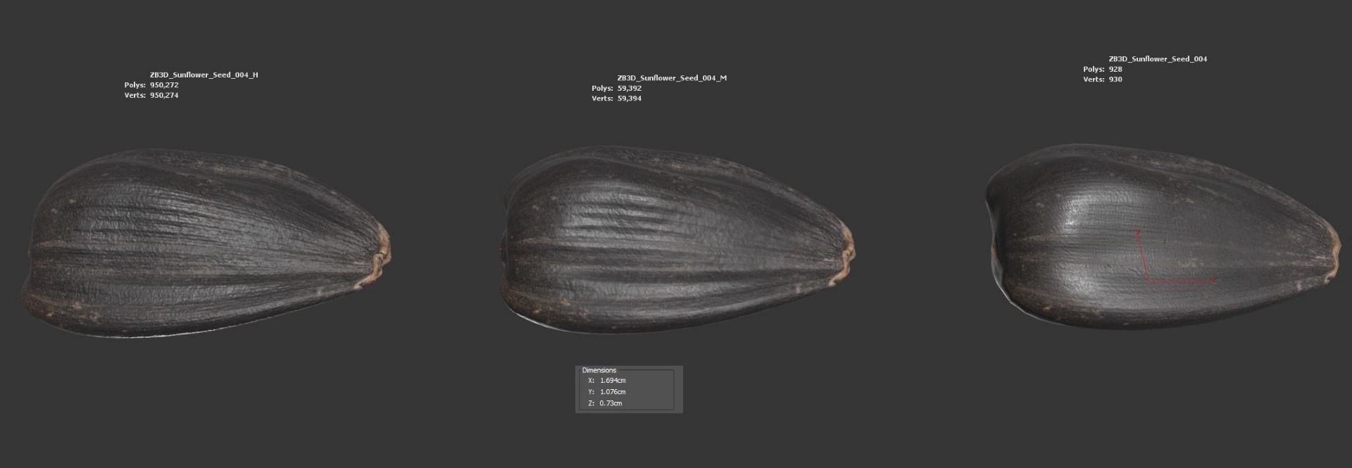 Enhance your visualizations, product designs, or still-life projects with this ultra-realistic 3D sunflower seed model. Meticulously photogrammetry scanned and textured, it boasts multiple levels of detail (928, 59K, and 950K polycounts) for close-ups and broader scenes.