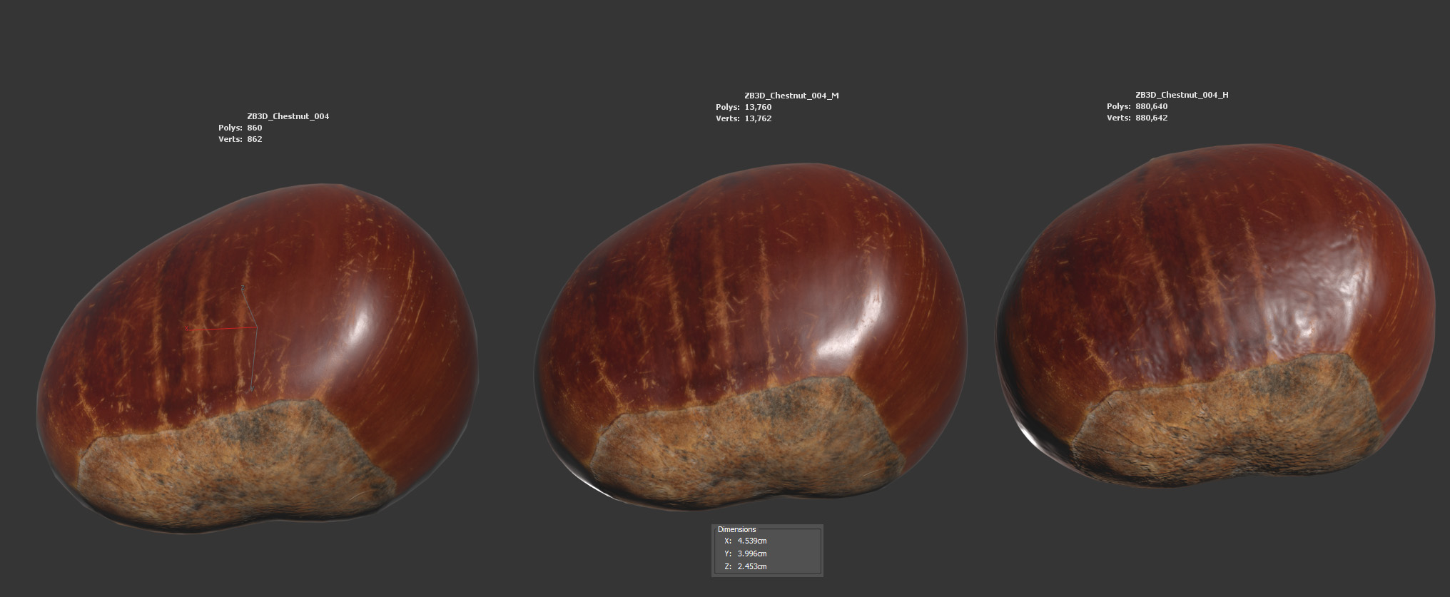The chestnut model is presented as a single mesh in 3 subdivision levels: low, mid, and high. Meshes are quad based. The polycounts are 860, 13K, and 880K. The high-detail model is included in .max, .fbx, and .obj formats.