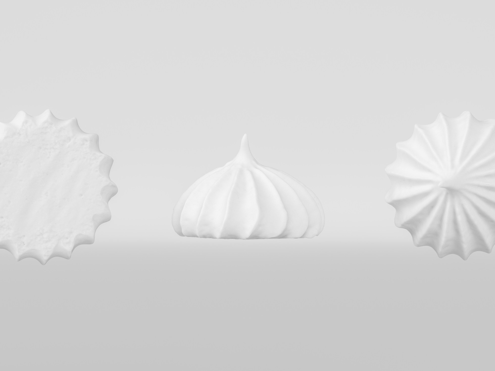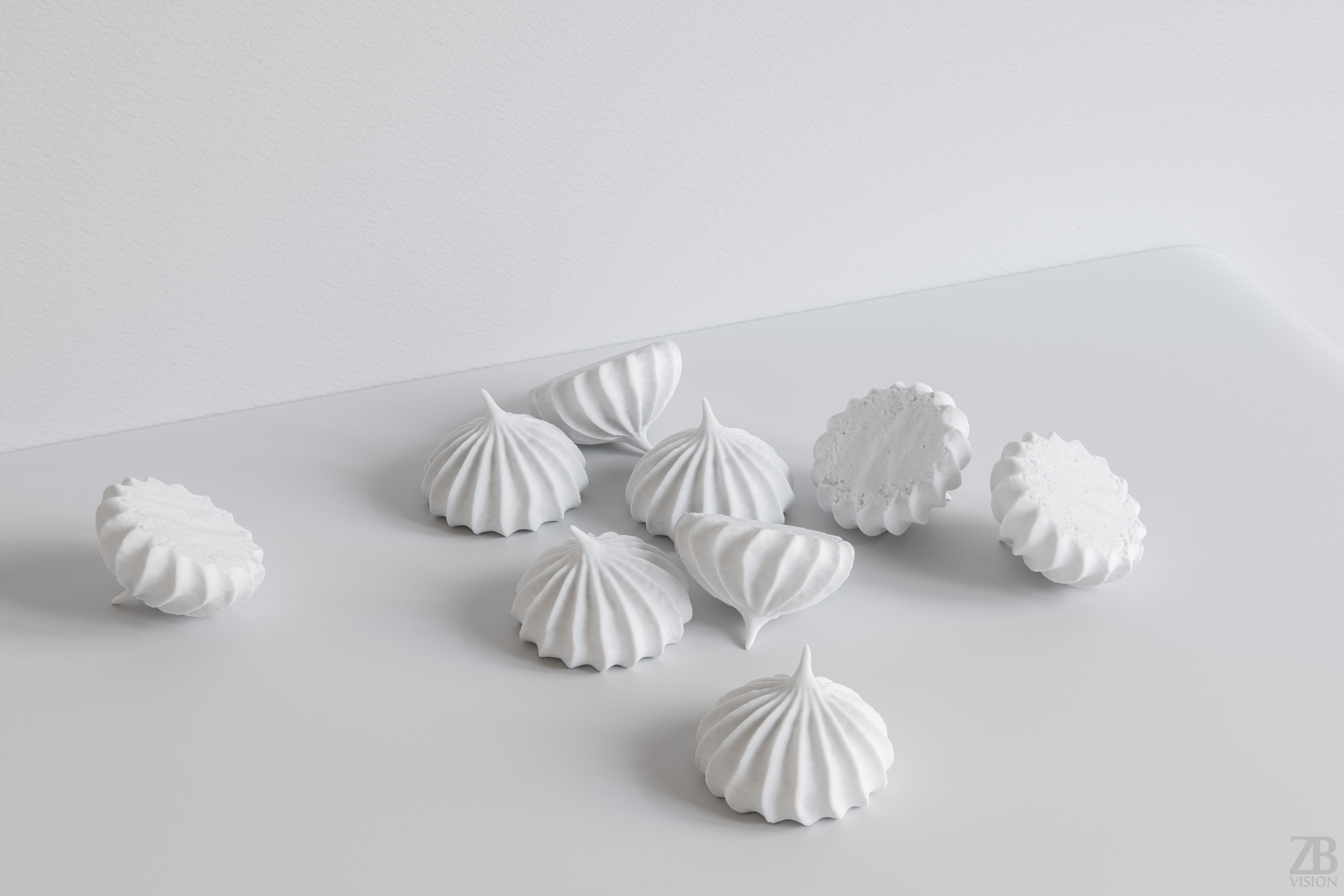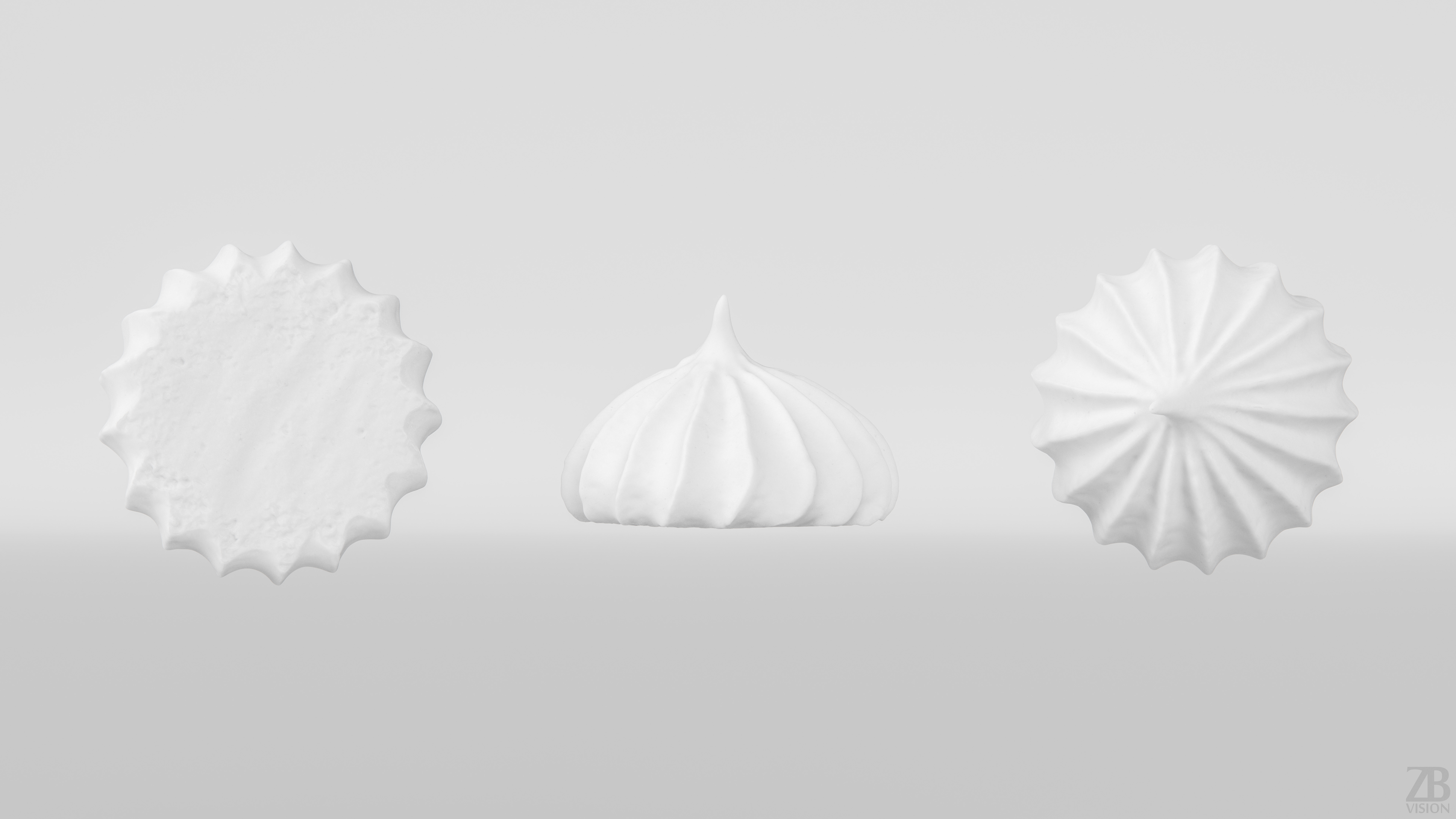 The meringue model is presented as a single mesh in 3 subdivision levels: low, mid, and high. Meshes are quad based. The polycounts are 10K, 171K, and 2736K. The high-detail model is included in .max, .fbx, and .obj formats.