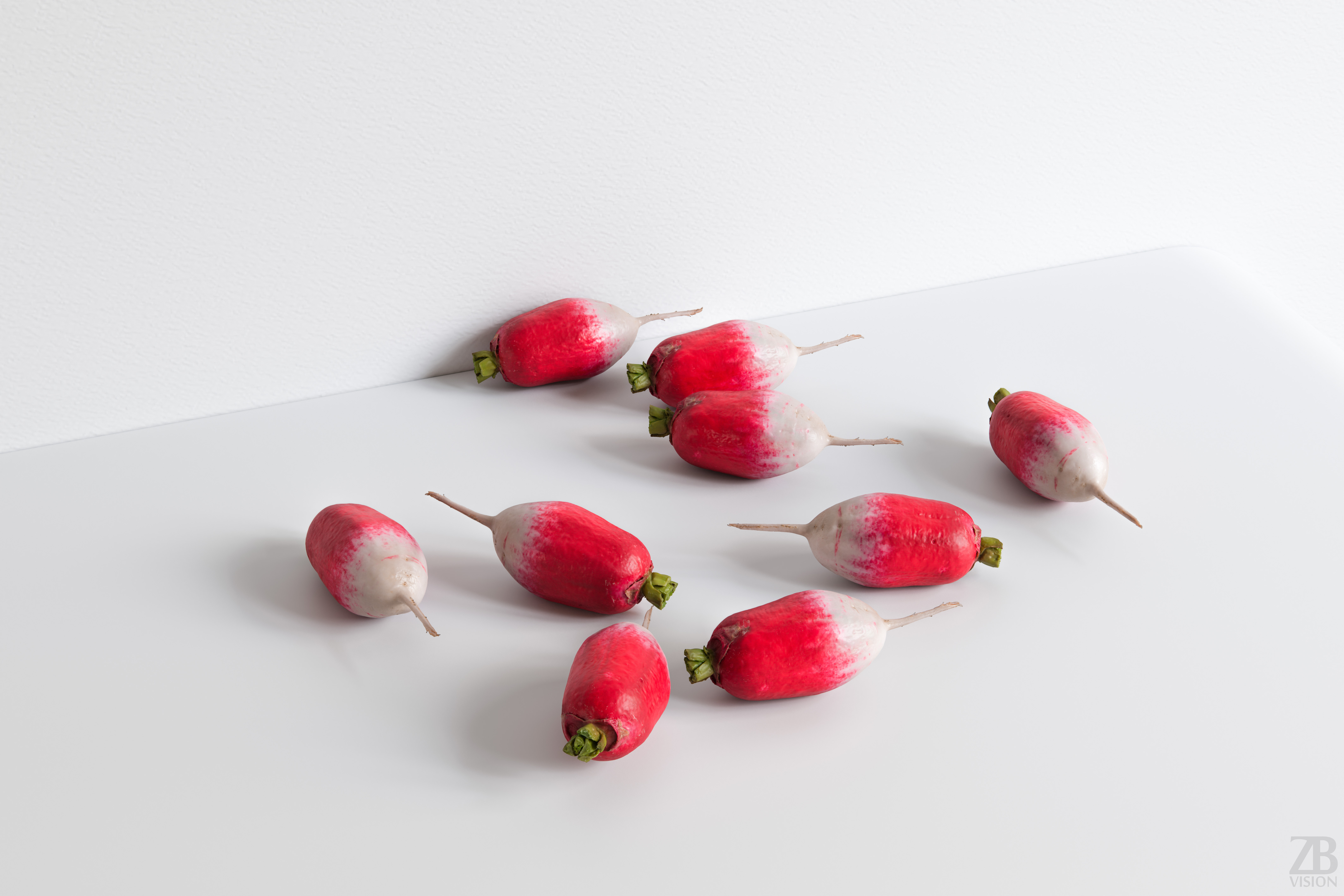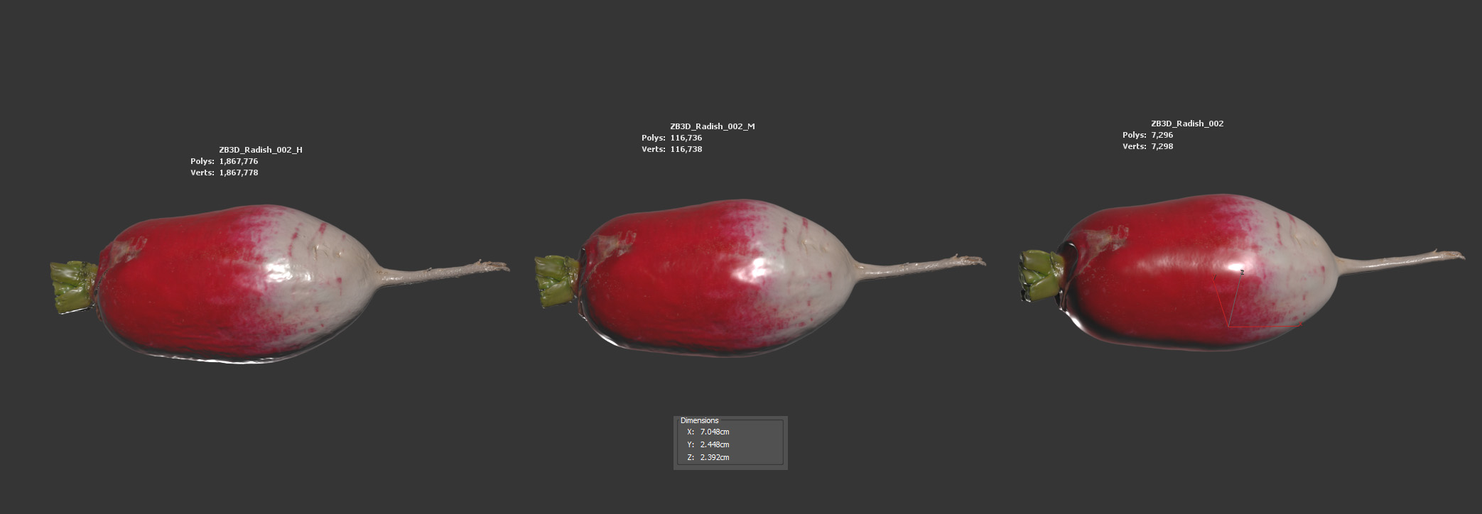 The radish model is presented as a single mesh in 3 subdivision levels: low, mid, and high. Meshes are quad based. The polycounts are 7K, 116K, and 1867K. The high-detail model is included in .max, .fbx, and .obj formats.
