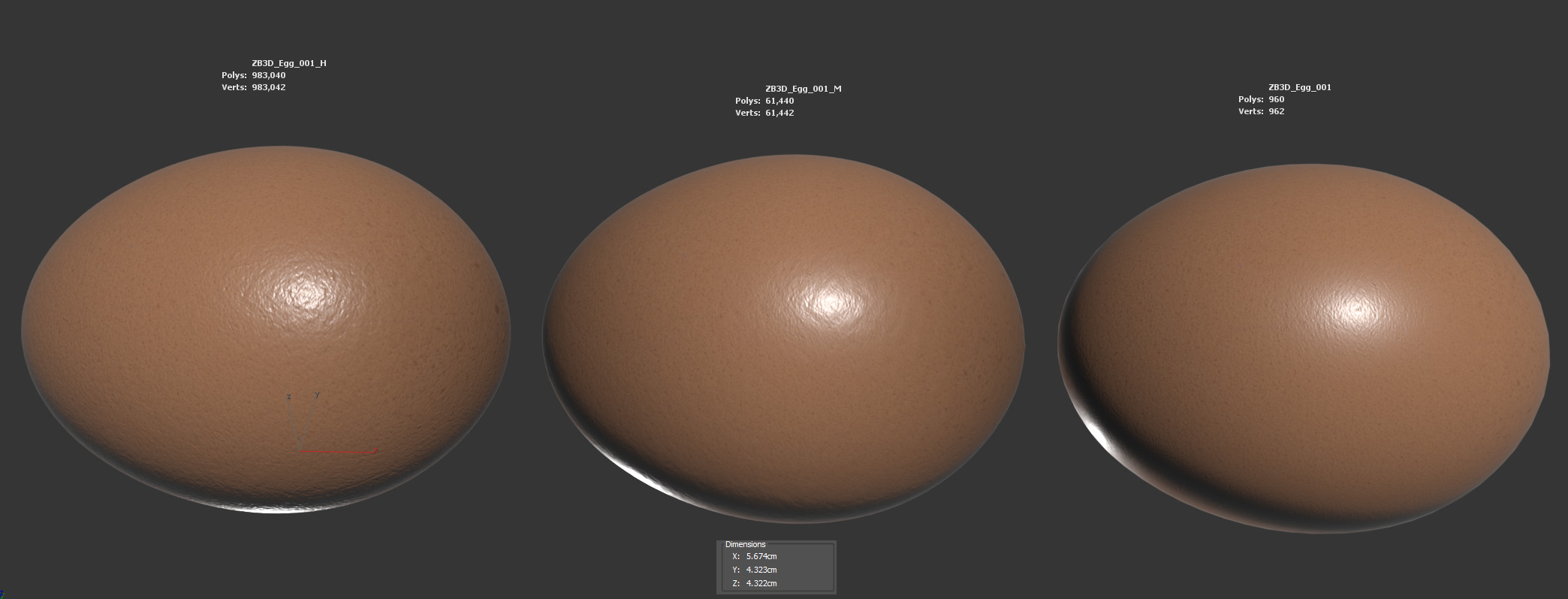 The egg model is presented as a single mesh in 3 subdivision levels: low, mid, and high. Meshes are quad based. The polycounts are 960, 61K, and 983K. The high-detail model is included in .max, .fbx, and .obj formats.