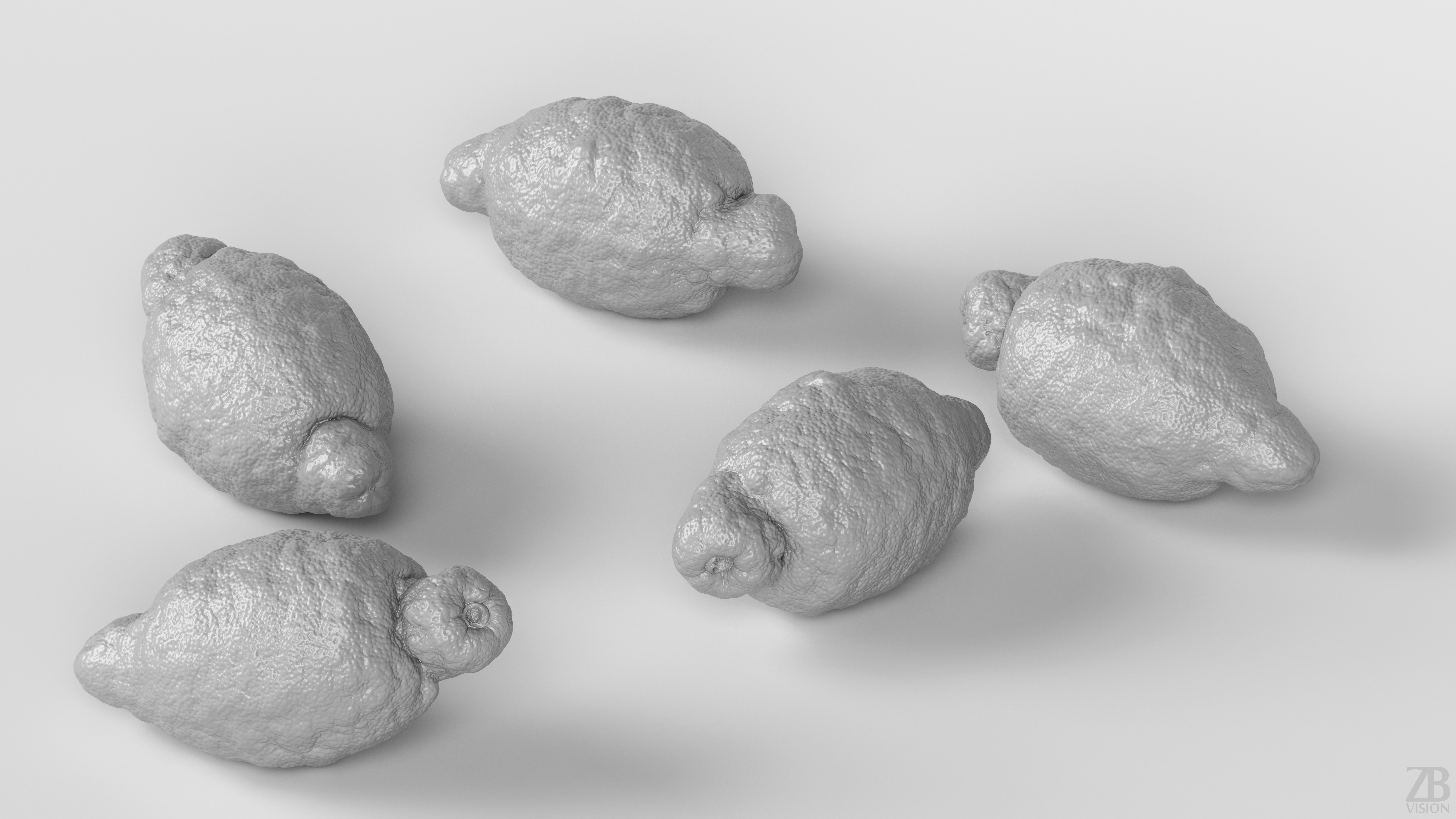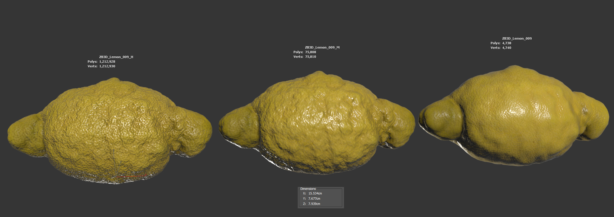 The lemon model is presented as a single mesh in 3 subdivision levels: low, mid, and high. Meshes are quad based. The polycounts are 4K,75K, and 1212K. The high-detail model is included in .max, .fbx, and .obj formats.