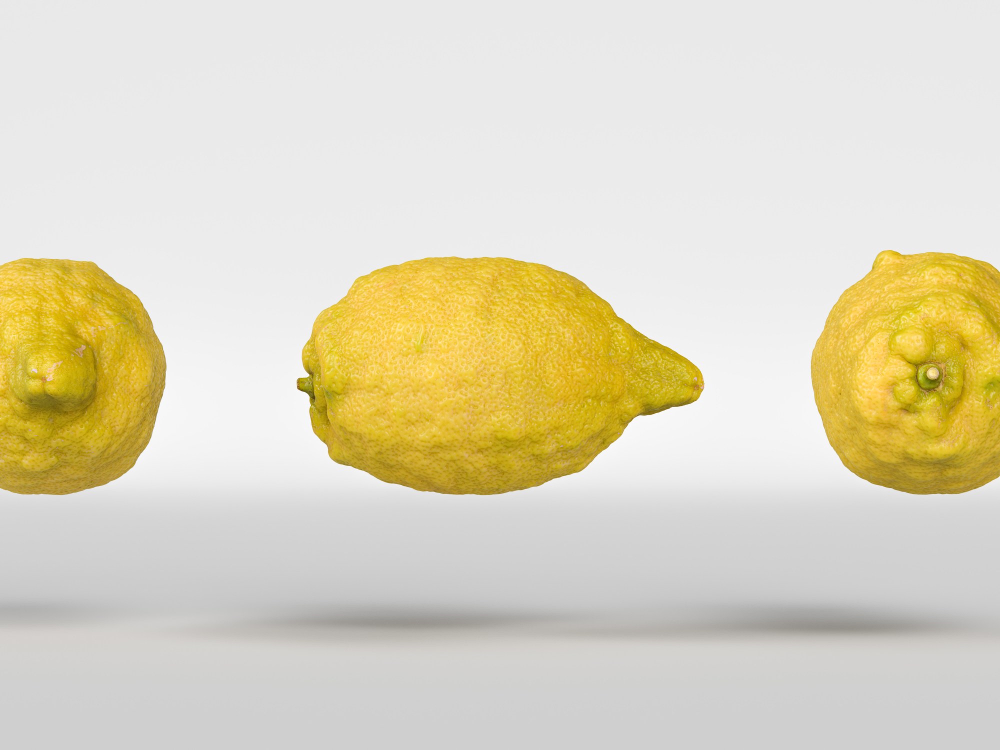 The lemon model is presented as a single mesh in 3 subdivision levels: low, mid, and high. Meshes are quad based. The polycounts are 3K, 62K, and 992K. The high-detail model is included in .max, .fbx, and .obj formats.