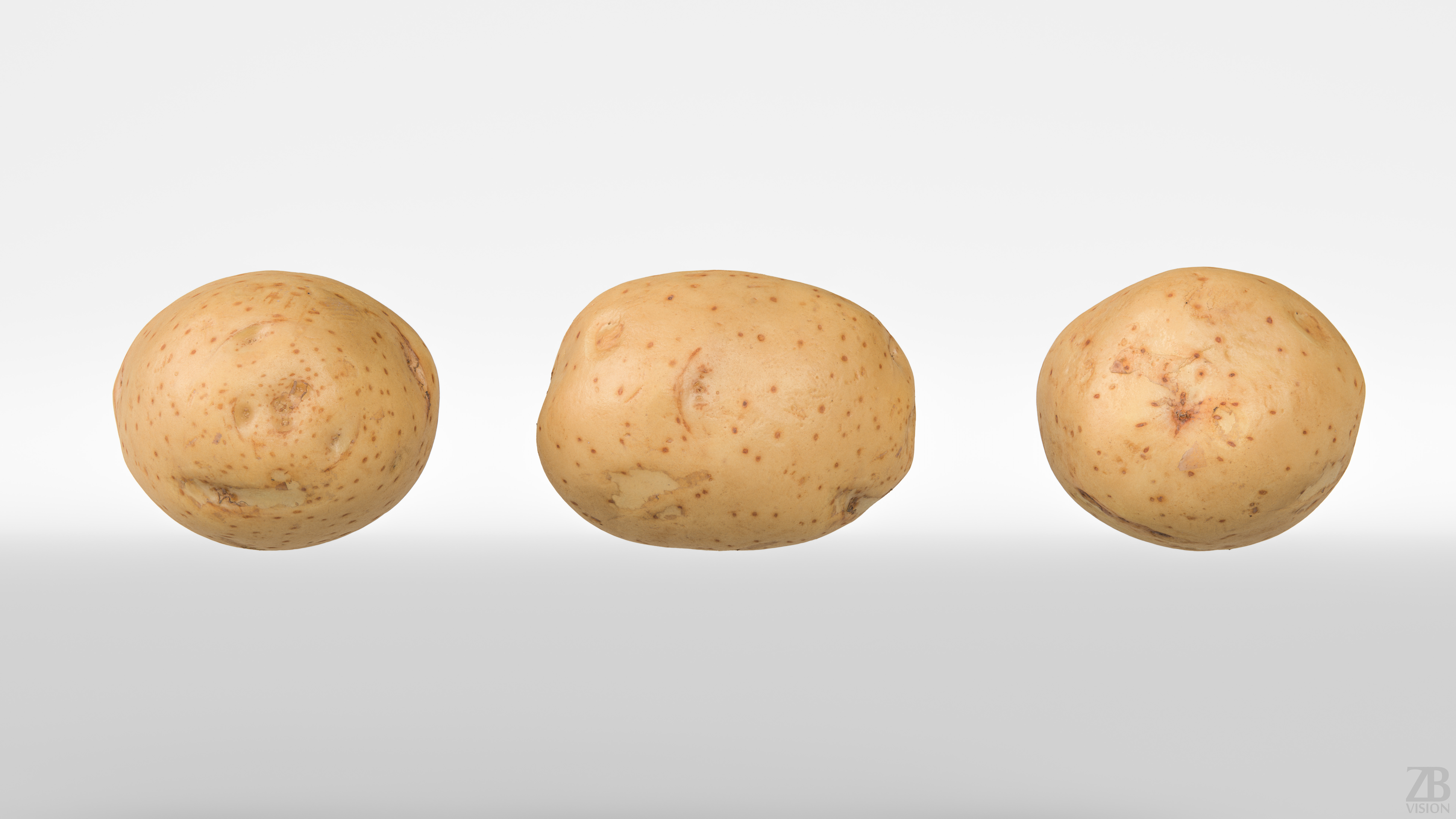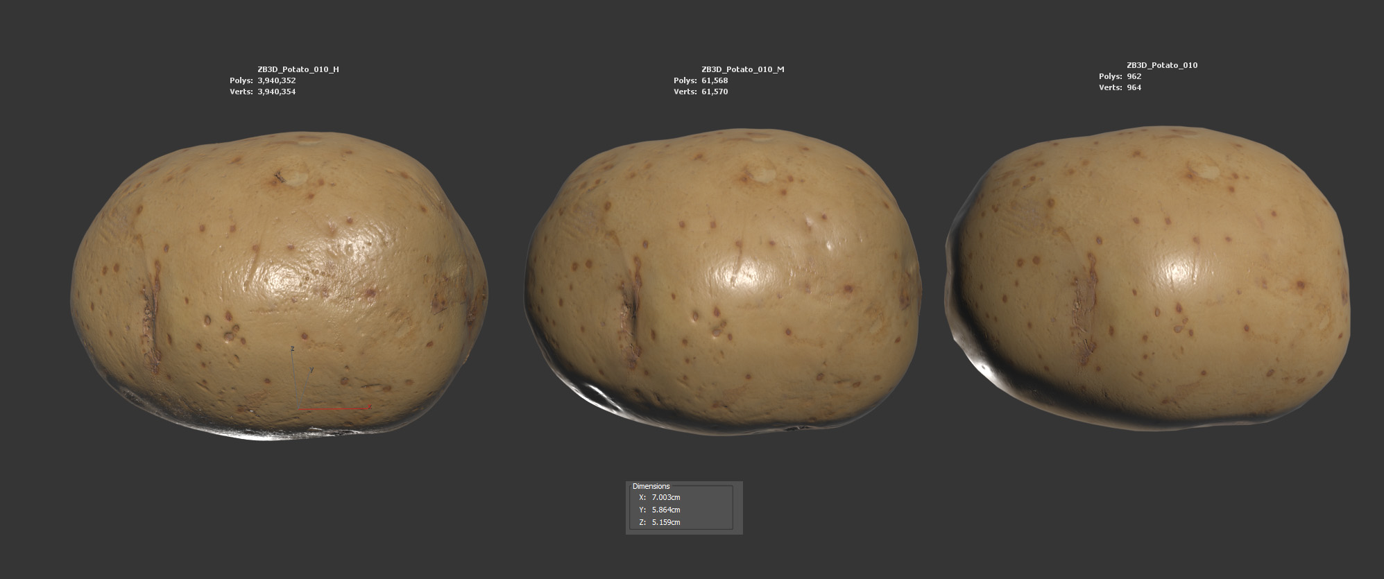 The potato model is presented as a single mesh in 3 subdivision levels: low, mid, and high. Meshes are quad based. The polycounts are 962, 61K, and 3940K. The high-detail model is included in .max, .fbx, and .obj formats.