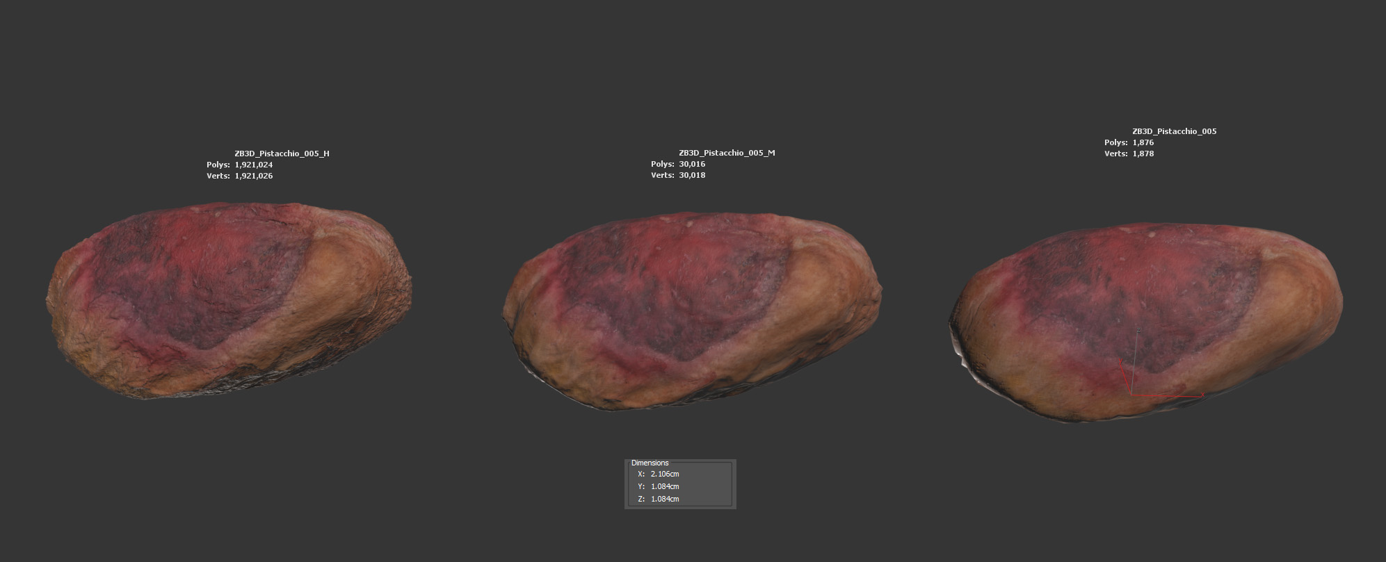 The pistachio model is presented as a single mesh in 3 subdivision levels: low, mid, and high. Meshes are quad based. The polycounts are 1K, 30K, and 1921K. The high-detail model is included in .max, .fbx, and .obj formats.