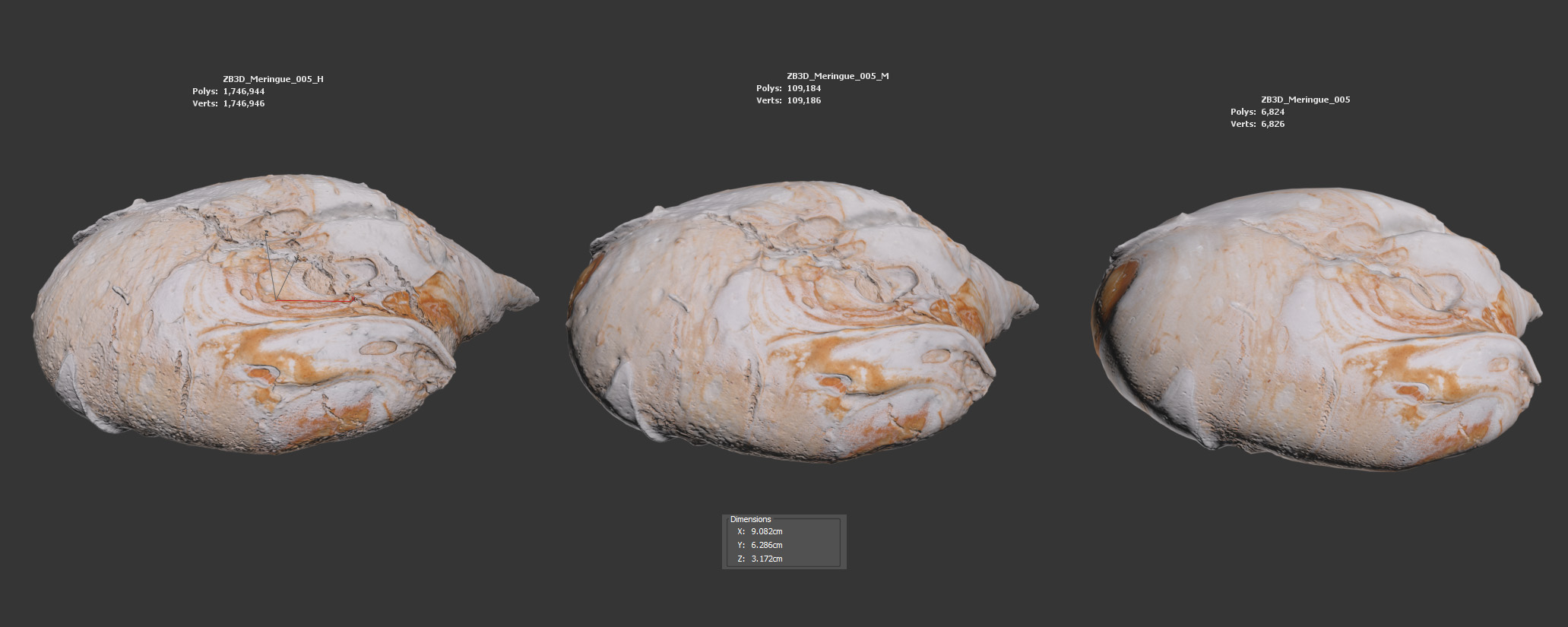 The meringue model is presented as a single mesh in 3 subdivision levels: low, mid, and high. Meshes are quad based. The polycounts are 6K, 109K, and 1746K. The high-detail model is included in .max, .fbx, and .obj formats.