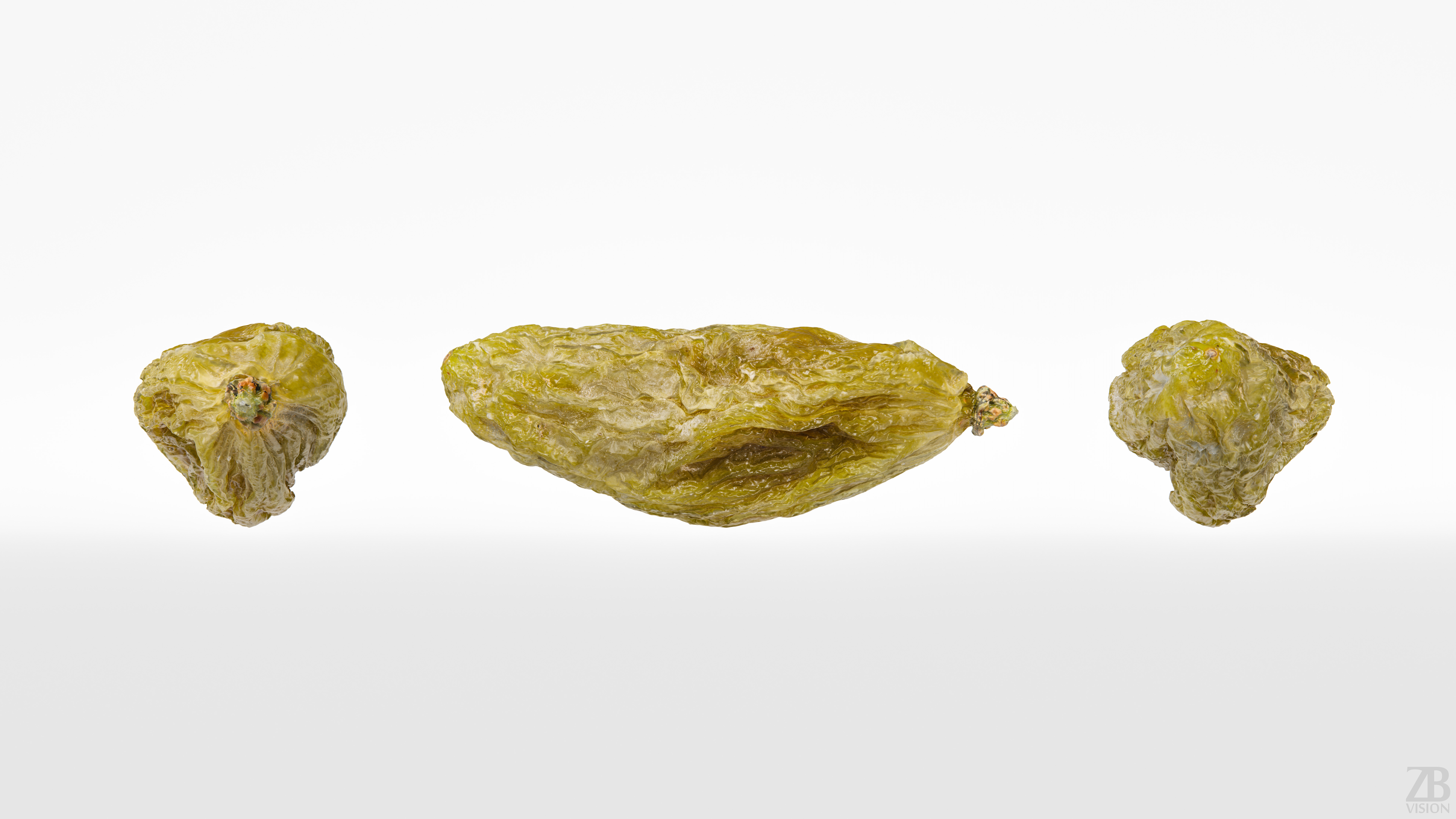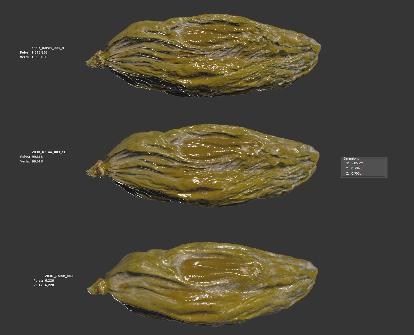The raisin model is presented as a single mesh in 3 subdivision levels: low, mid, and high. Meshes are quad based. The polycounts are 6K, 99K, and 1593K. The high-detail model is included in .max, .fbx, and .obj formats.