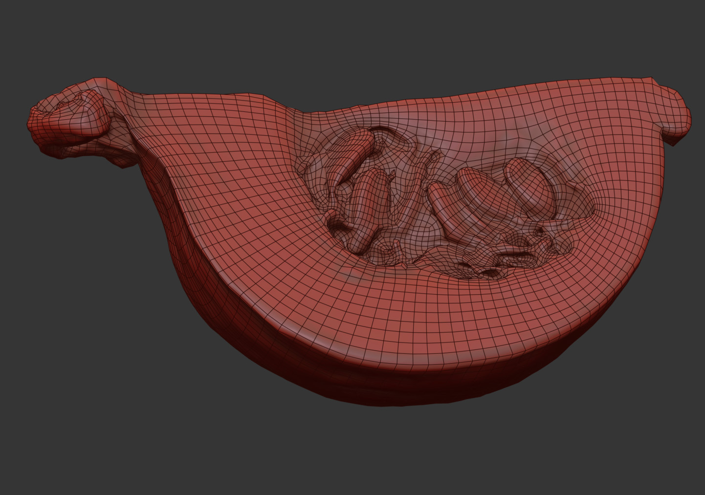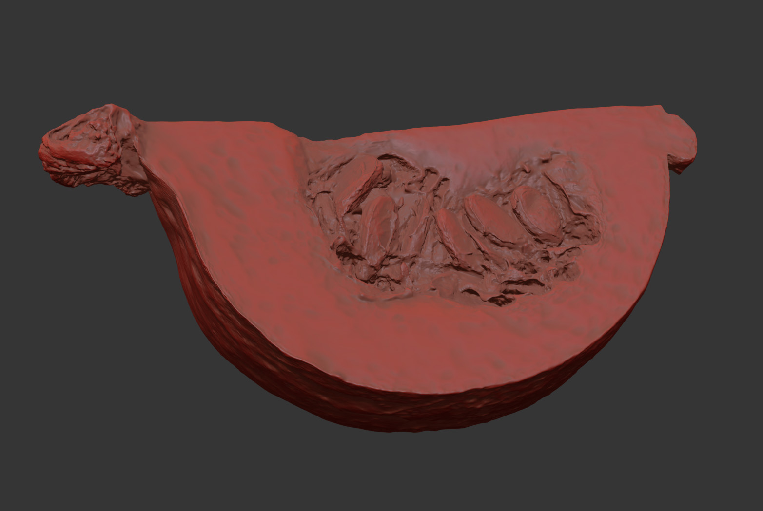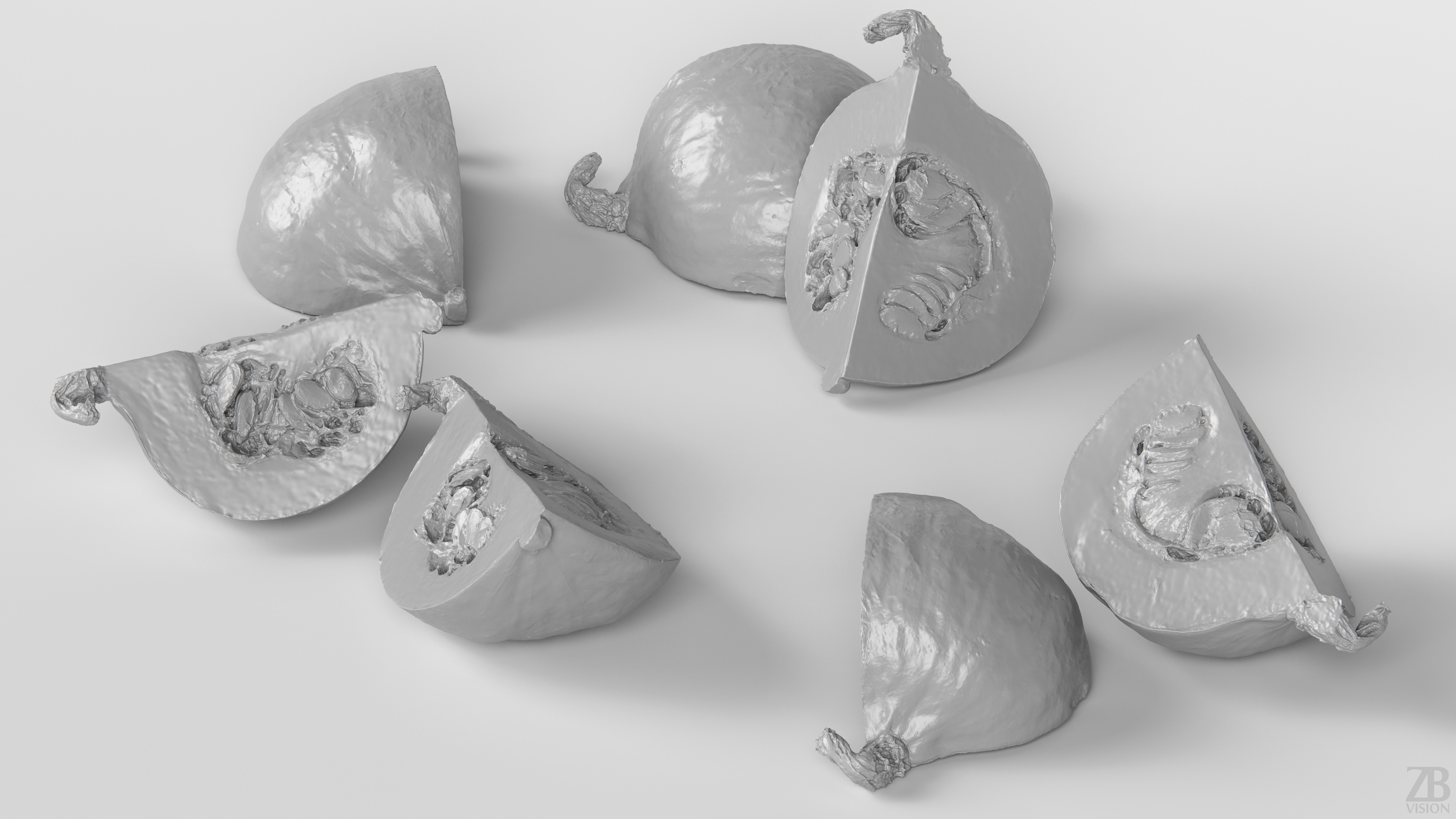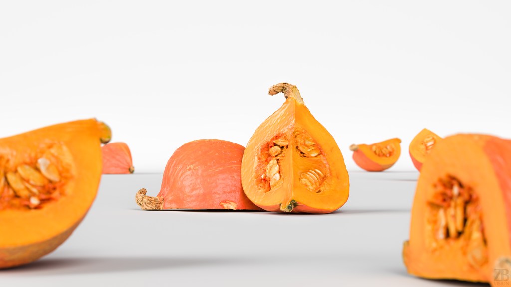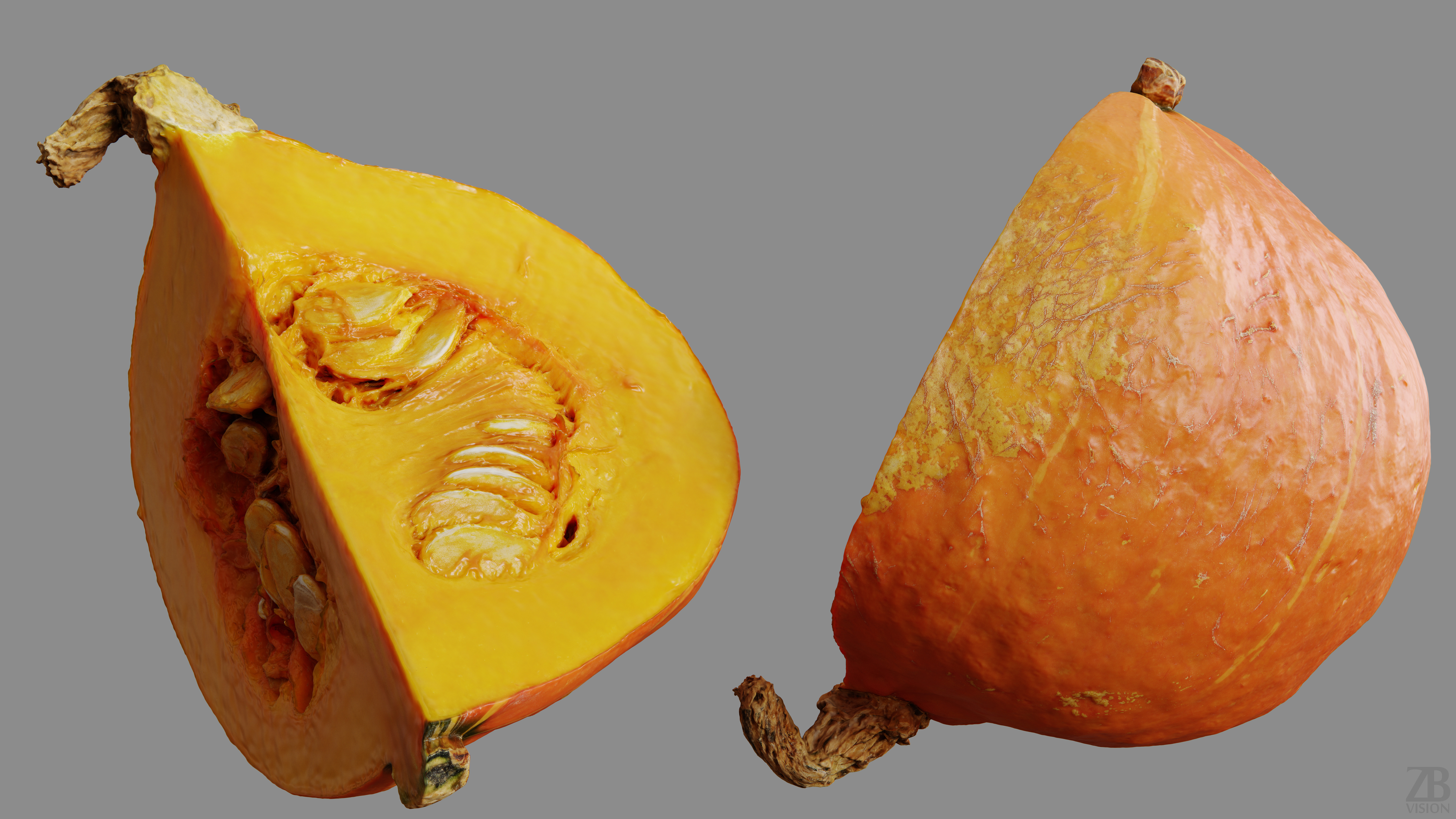 This is a 3d model of a quarter pumpkin cut, Hokkaido variety. It was scanned and prepared for photorealistic renderings, close-ups, stills, and animation. The pumpkin model is ready to be inserted into your scene out of the box.