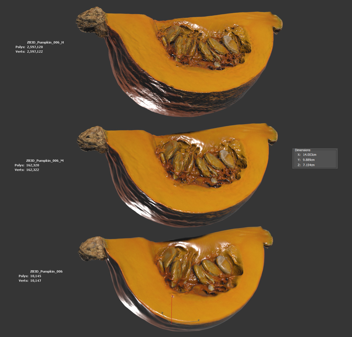 The pumpkin model is presented as a single mesh in 3 subdivision levels: low, mid, and high. Meshes are quad based. The polycounts are 10K, 162K, and 2597K. The high-detail model is included in .max, .fbx, and .obj formats.