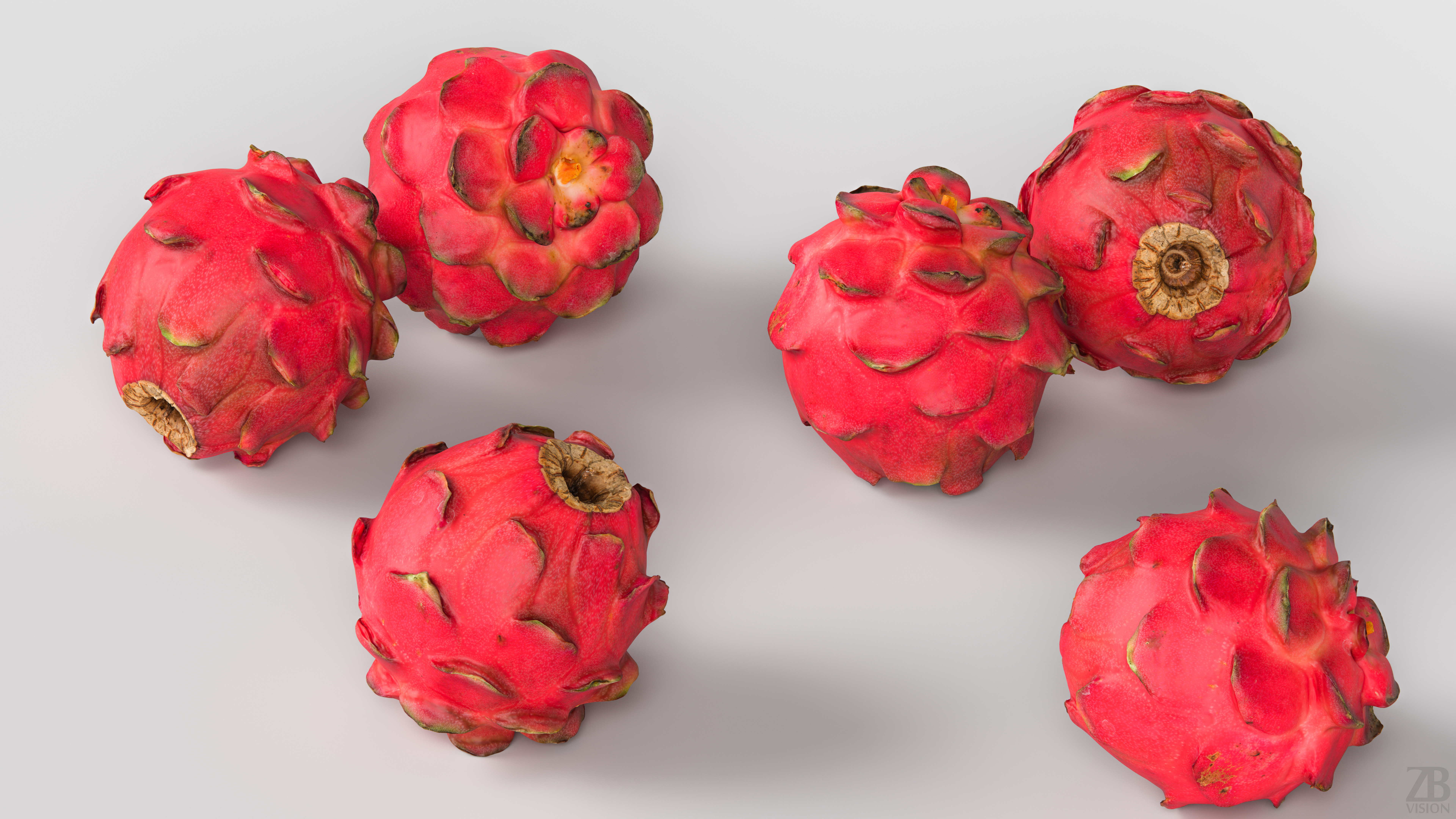 The pitaya model is presented as a single mesh in 3 subdivision levels: low, mid, and high. Meshes are quad based. The polycounts are 9K, 158K, and 2538K. The high-detail model is included in .max, .fbx, and .obj formats.