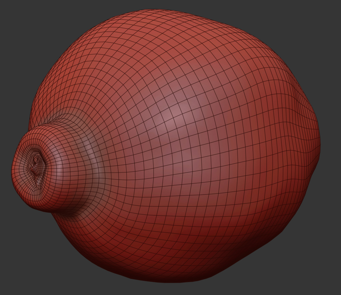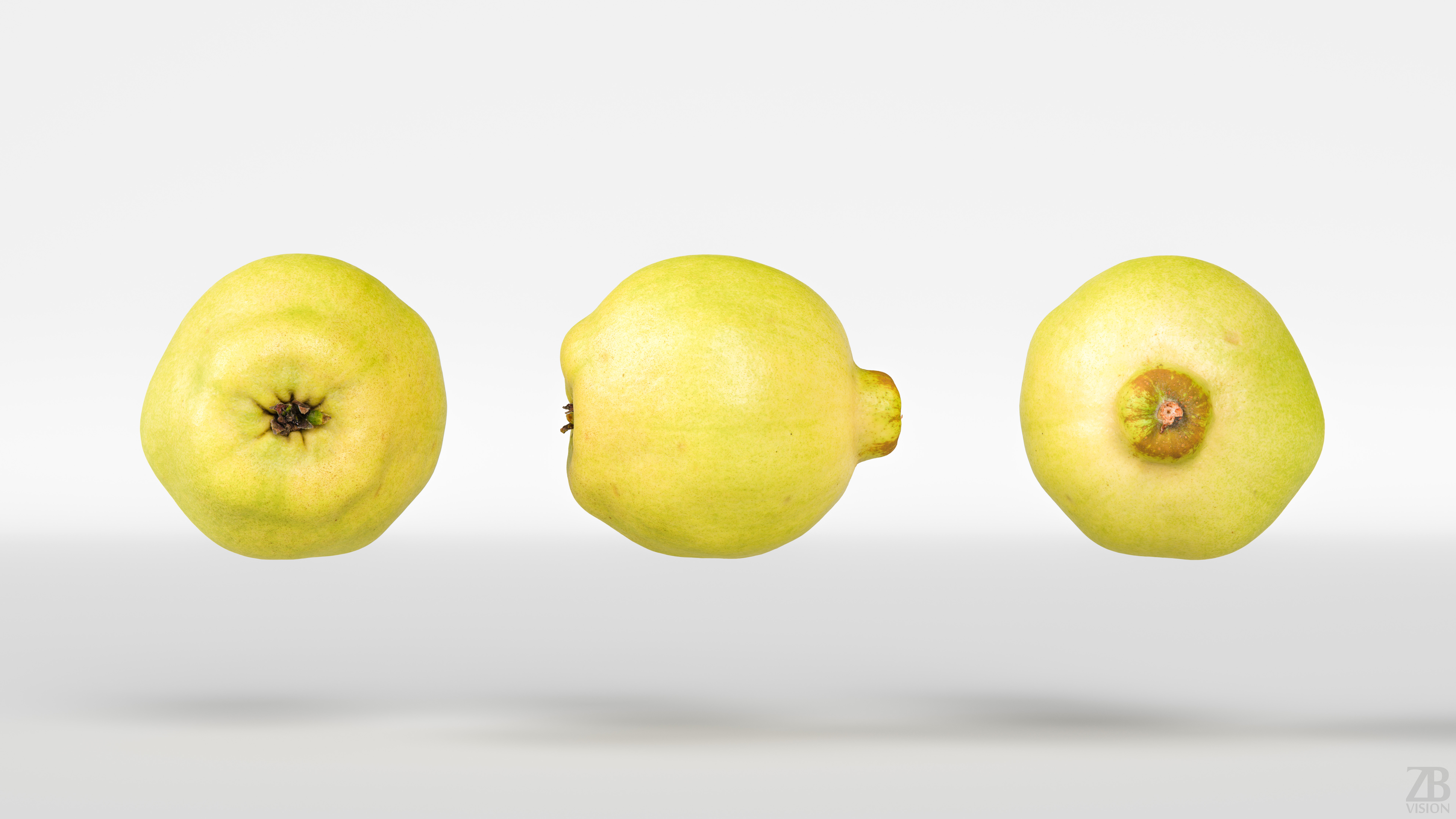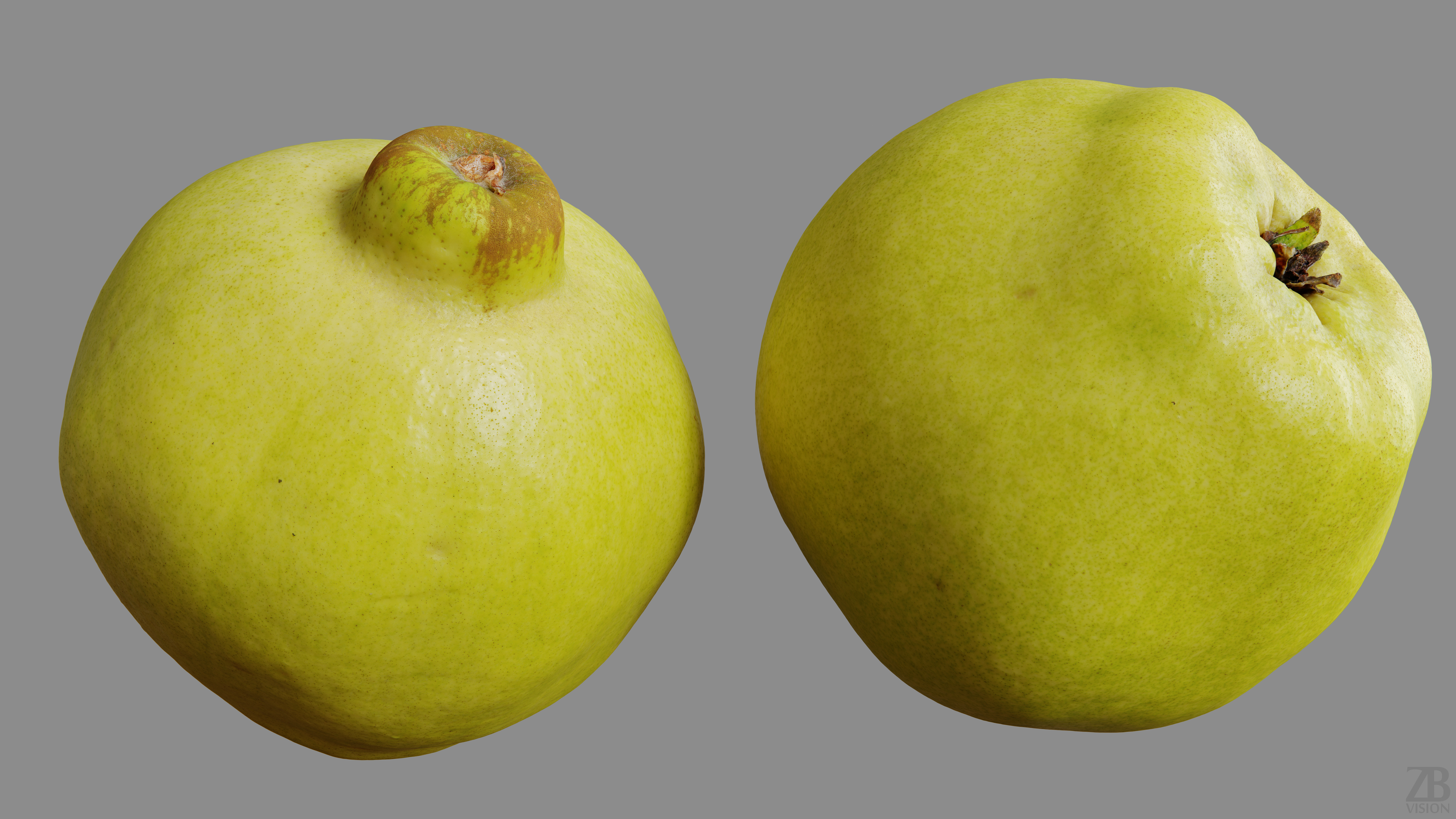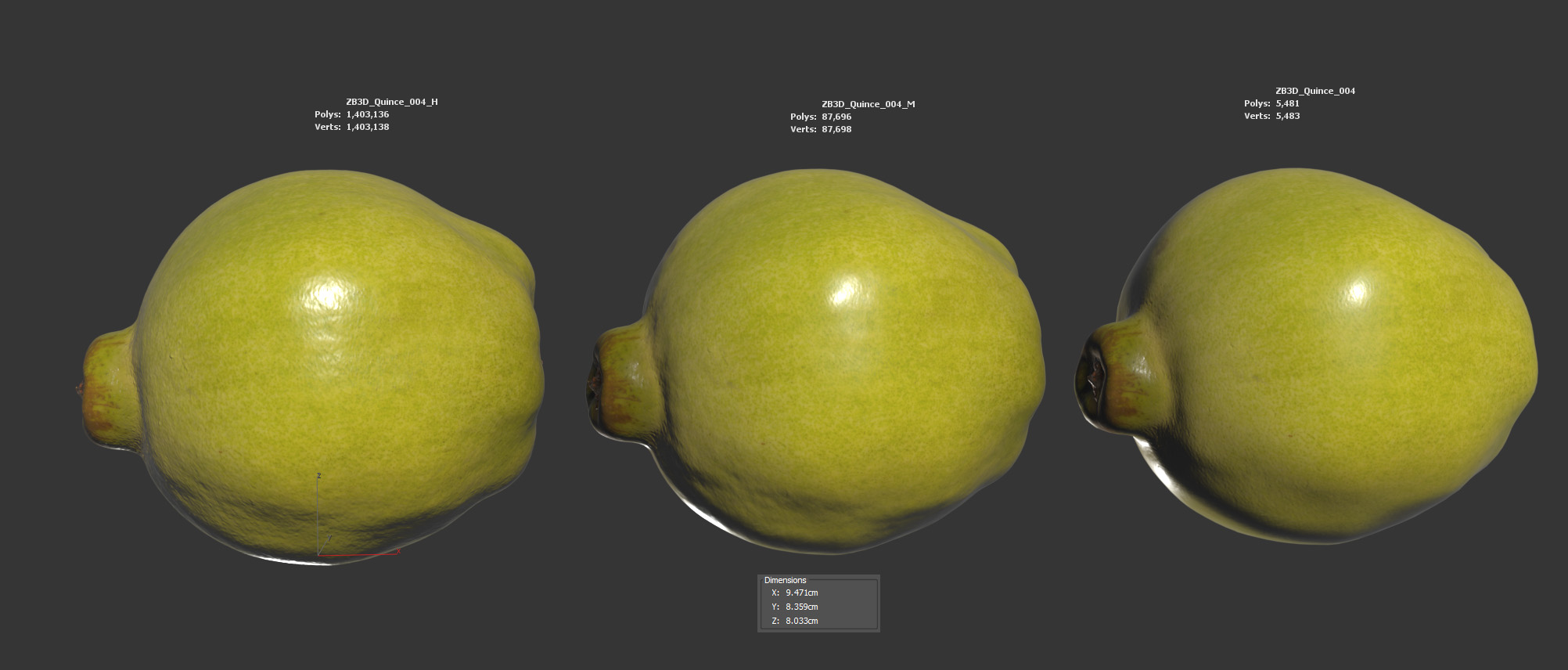 The quince model is presented as a single mesh in 3 subdivision levels: low, mid, and high. Meshes are quad based. The polycounts are 5K, 87K, and 1403K. The high-detail model is included in .max, .fbx, and .obj formats.