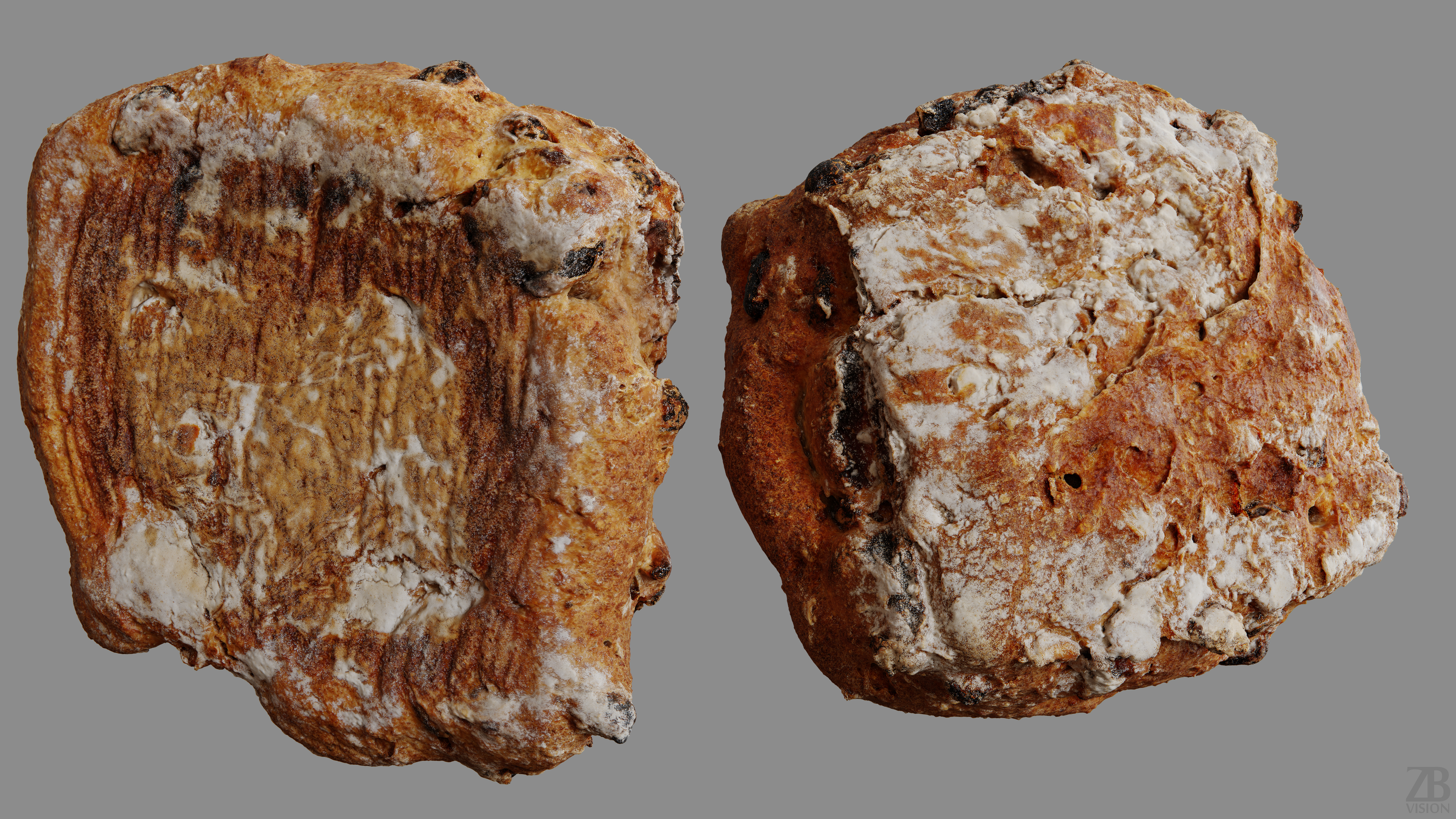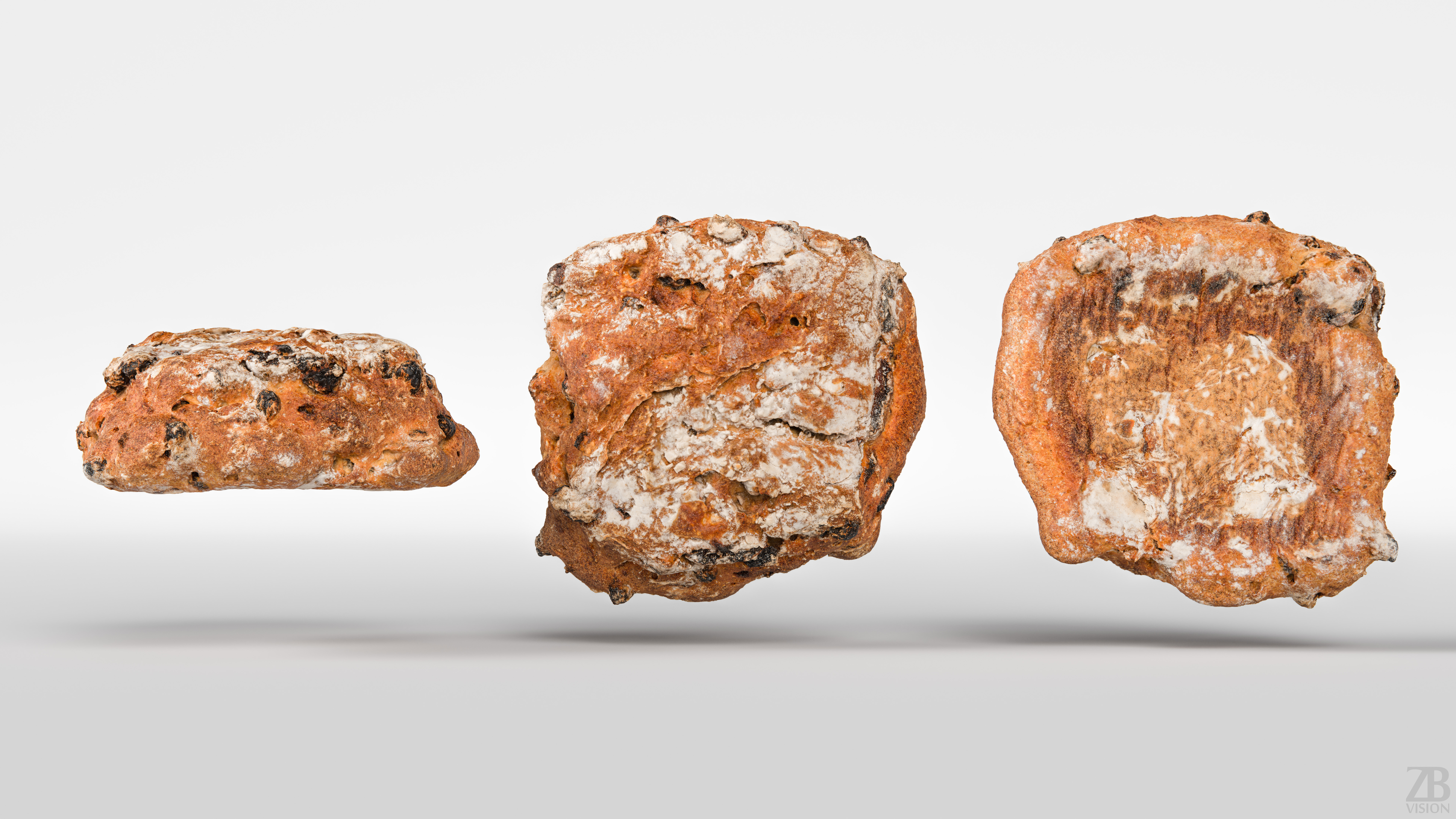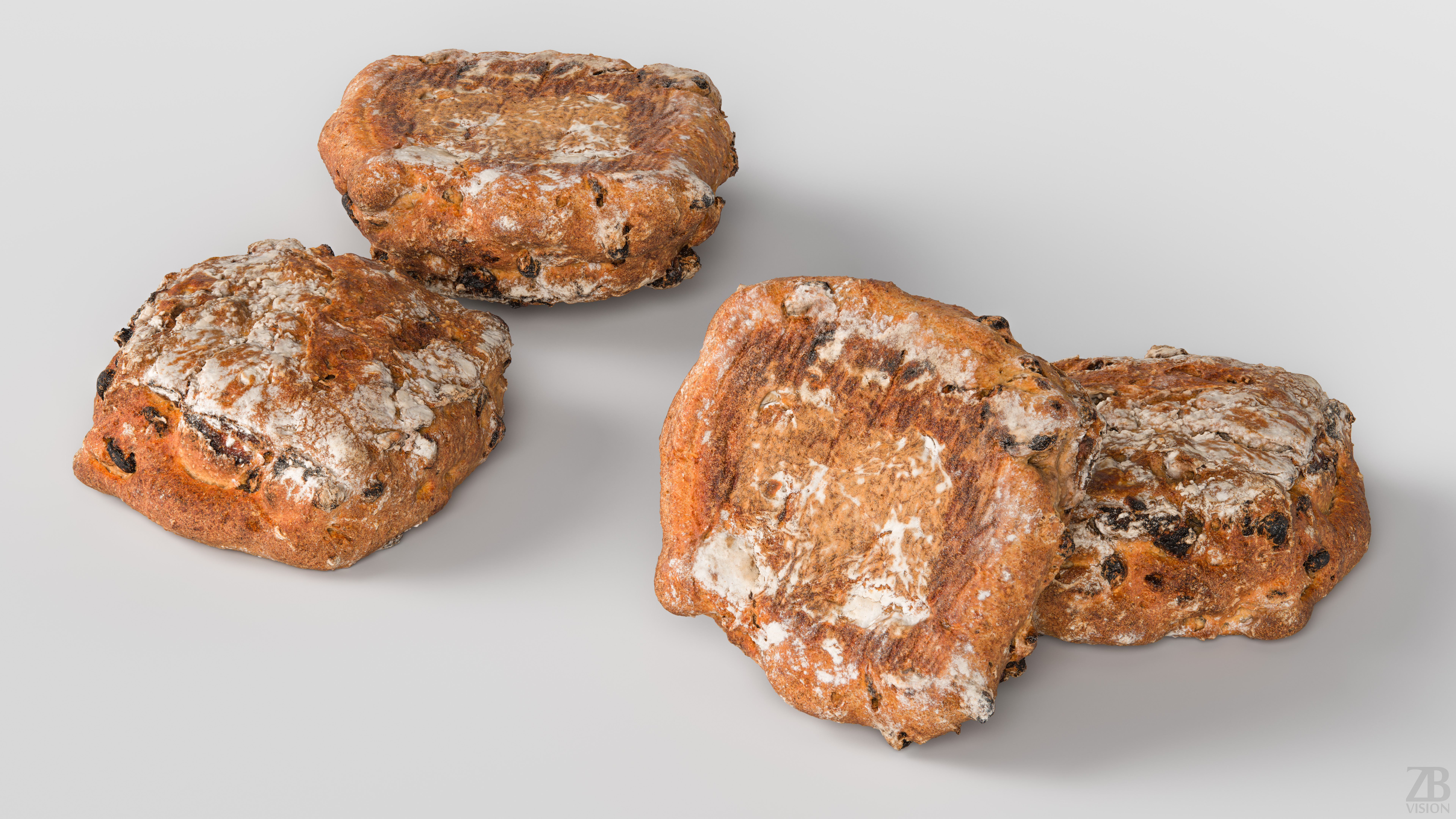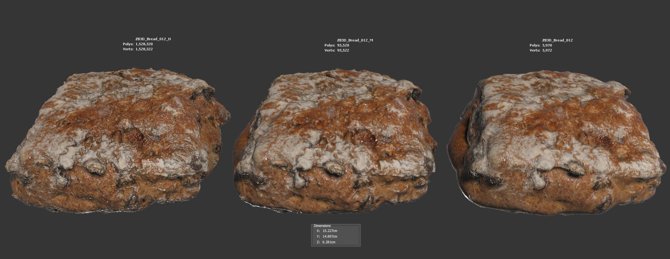 The bread model is presented as a single mesh in 3 subdivision levels: low, mid, and high. Meshes are quad based. The polycounts are 5K, 95K, and 1528K. The high-detail model is included in .max, .fbx, and .obj formats.