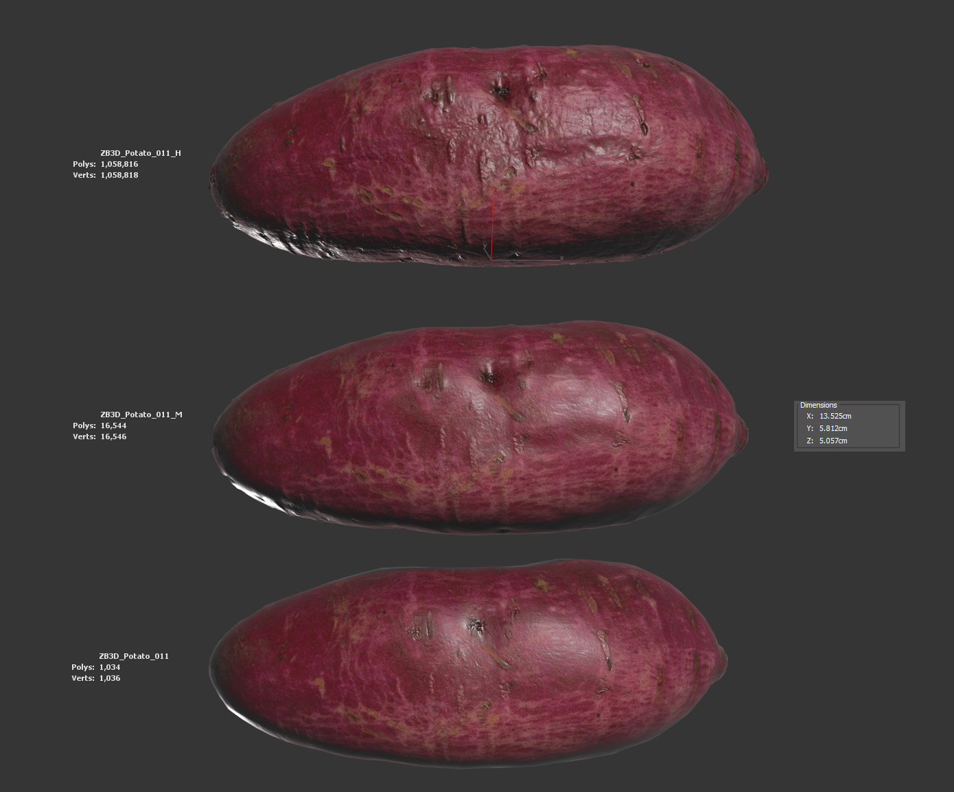 The potato model is presented as a single mesh in 3 subdivision levels: low, mid, and high. Meshes are quad based. The polycounts are 1K, 16K, and 1058K. The high-detail model is included in .max, .fbx, and .obj formats.