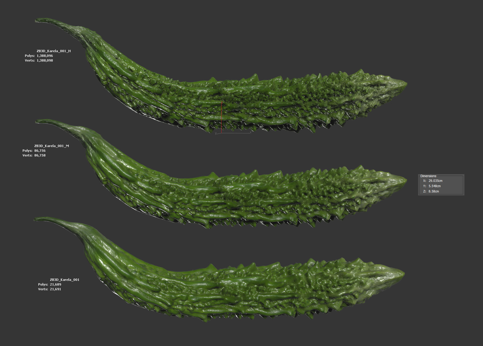 The karela model is presented as a single mesh in 3 subdivision levels: low, mid, and high. Meshes are quad based. The polycounts are 21K, 86K, and 1388K. The high-detail model is included in .max, .fbx, and .obj formats.