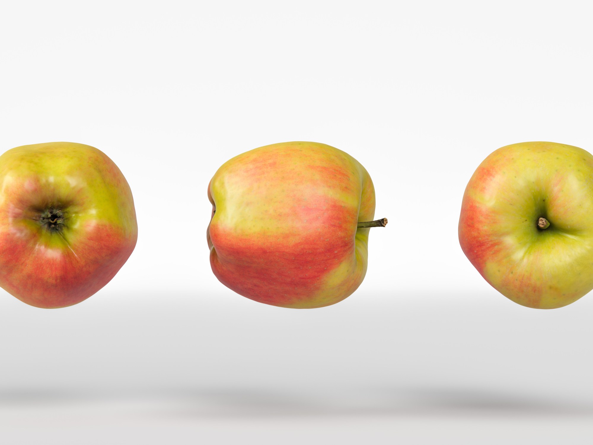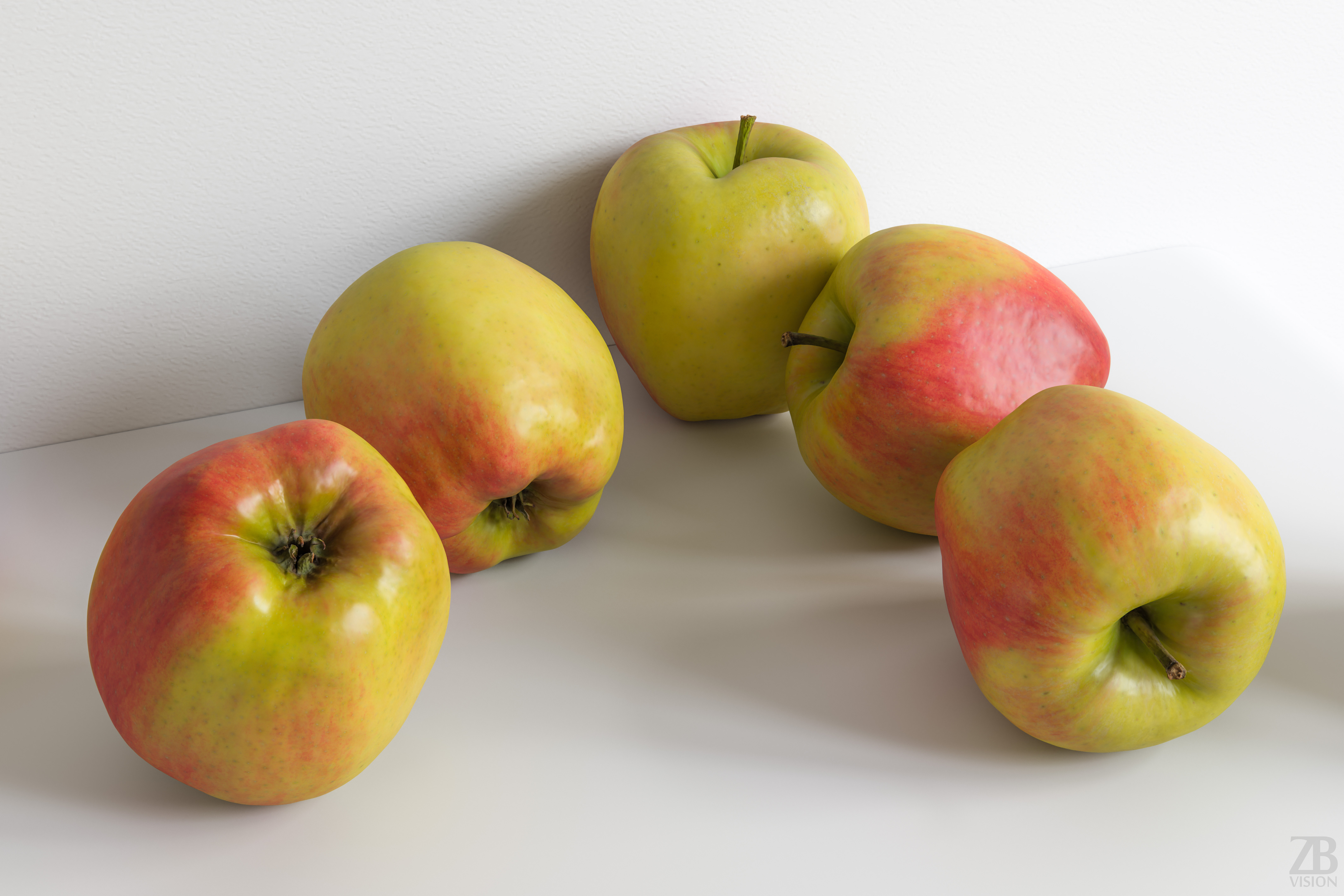 The apple model is presented as a single mesh in 3 subdivision levels: low, mid, and high. Meshes are quad based. The polycounts are 8K, 130K, and 2088K. The high-detail model is included in .max, .fbx, and .obj formats.