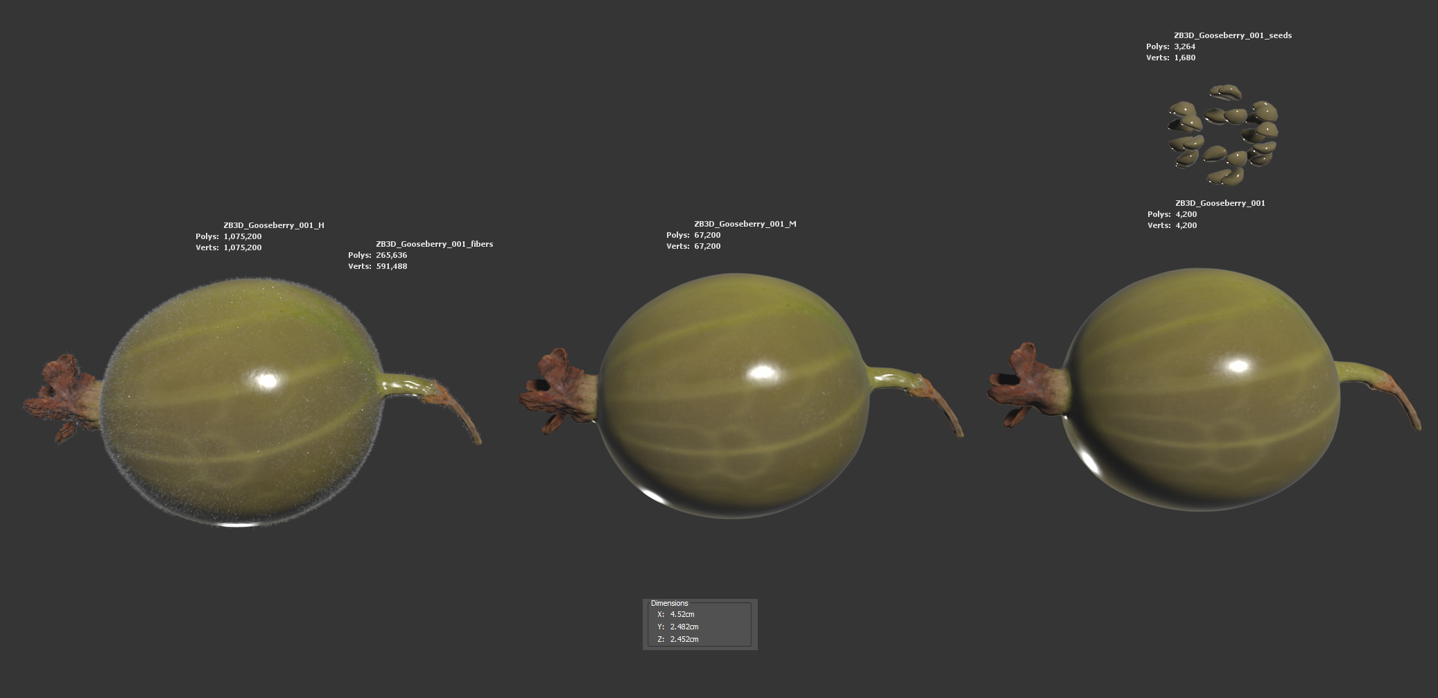 The gooseberry model is presented as a single mesh in 3 subdivision levels: low, mid, and high. Meshes are quad based. The polycounts are 4K, 67K, and 1075K. The high-detail model is included in .max, .fbx, and .obj formats. Seeds are tris-based geometry with basic material, high detail model contains also the small fuzz as tris-based mesh.