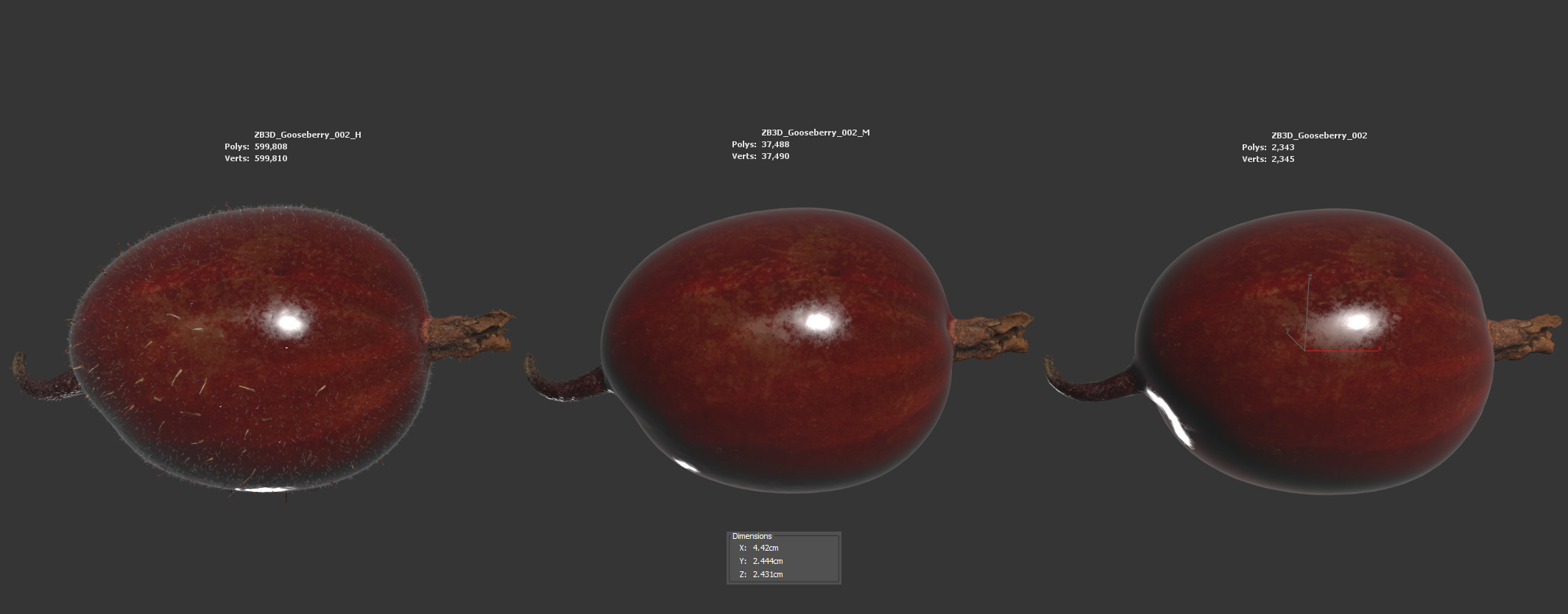 The gooseberry model is presented as a single mesh in 3 subdivision levels: low, mid, and high. Meshes are quad based. The polycounts are 2K, 37K, and 599K. The high-detail model is included in .max, .fbx, and .obj formats.