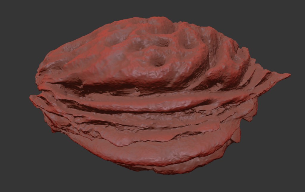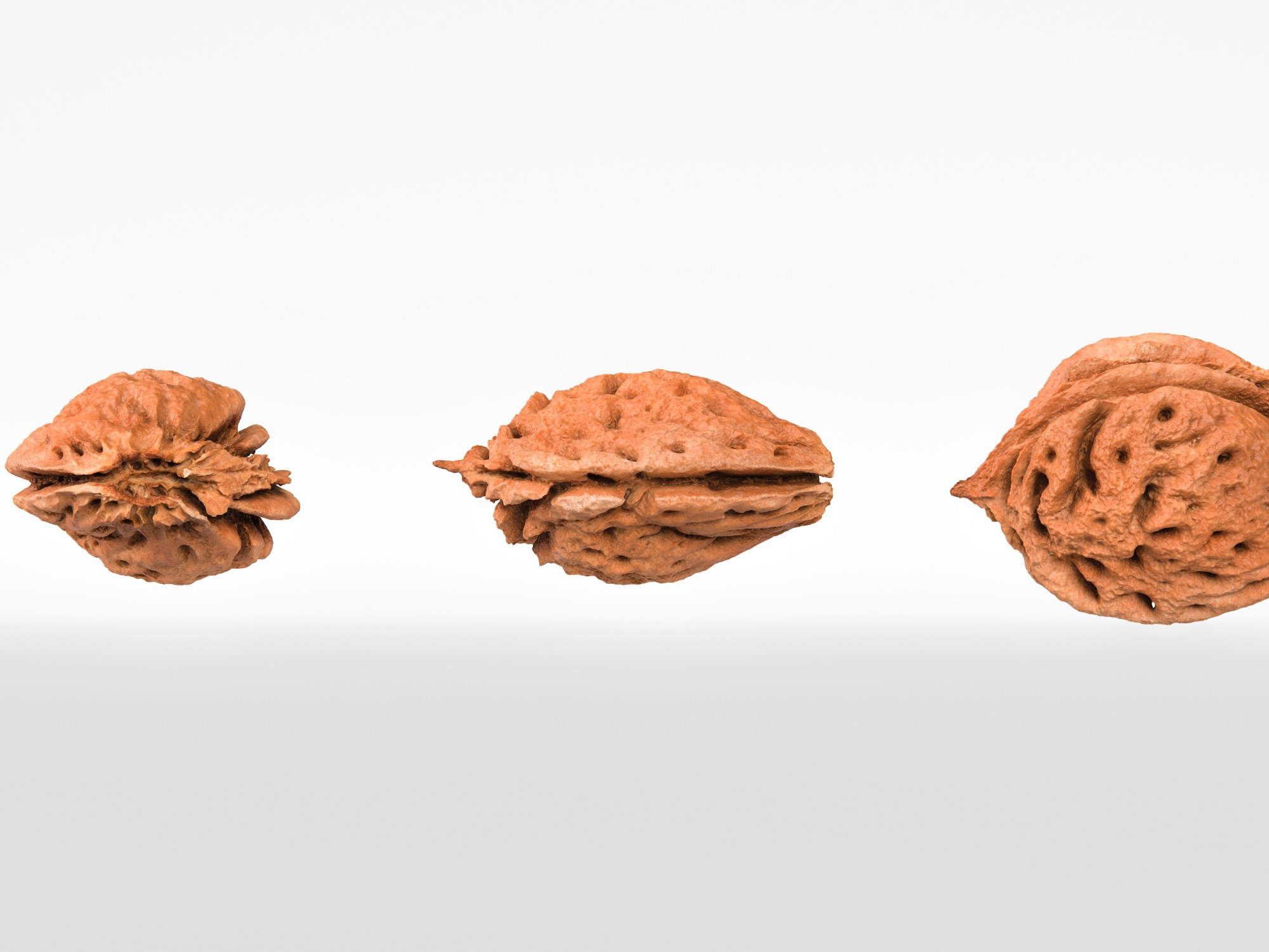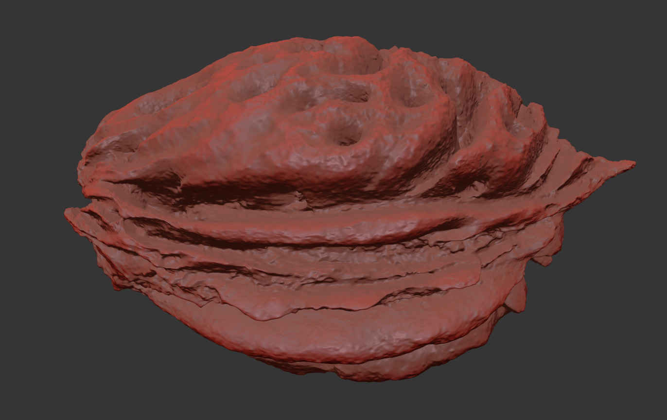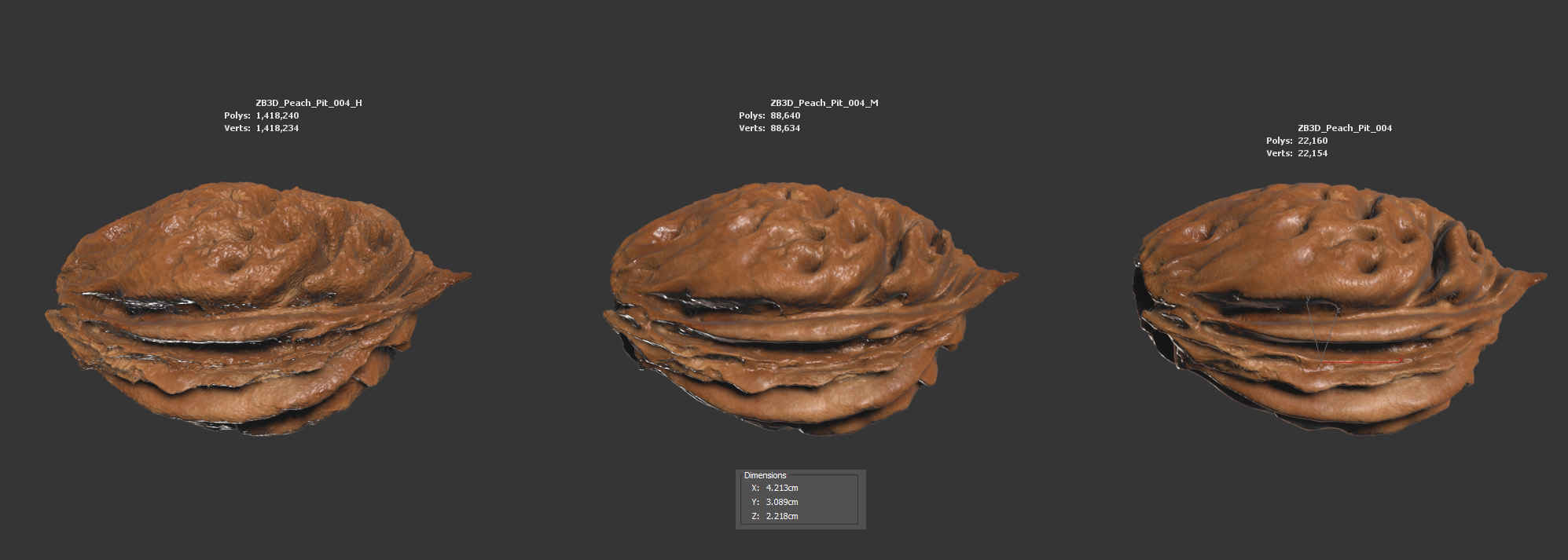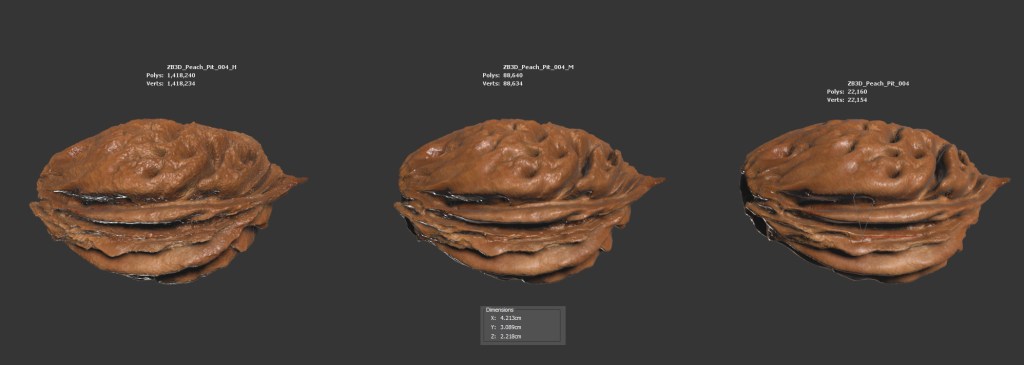 The peach pit model is presented as a single mesh in 3 subdivision levels: low, mid, and high. Meshes are quad based. The polycounts are 22K, 88K, and 1418K. The high-detail model is included in .max, .fbx, and .obj formats. The raw scan is also included in .obj format.