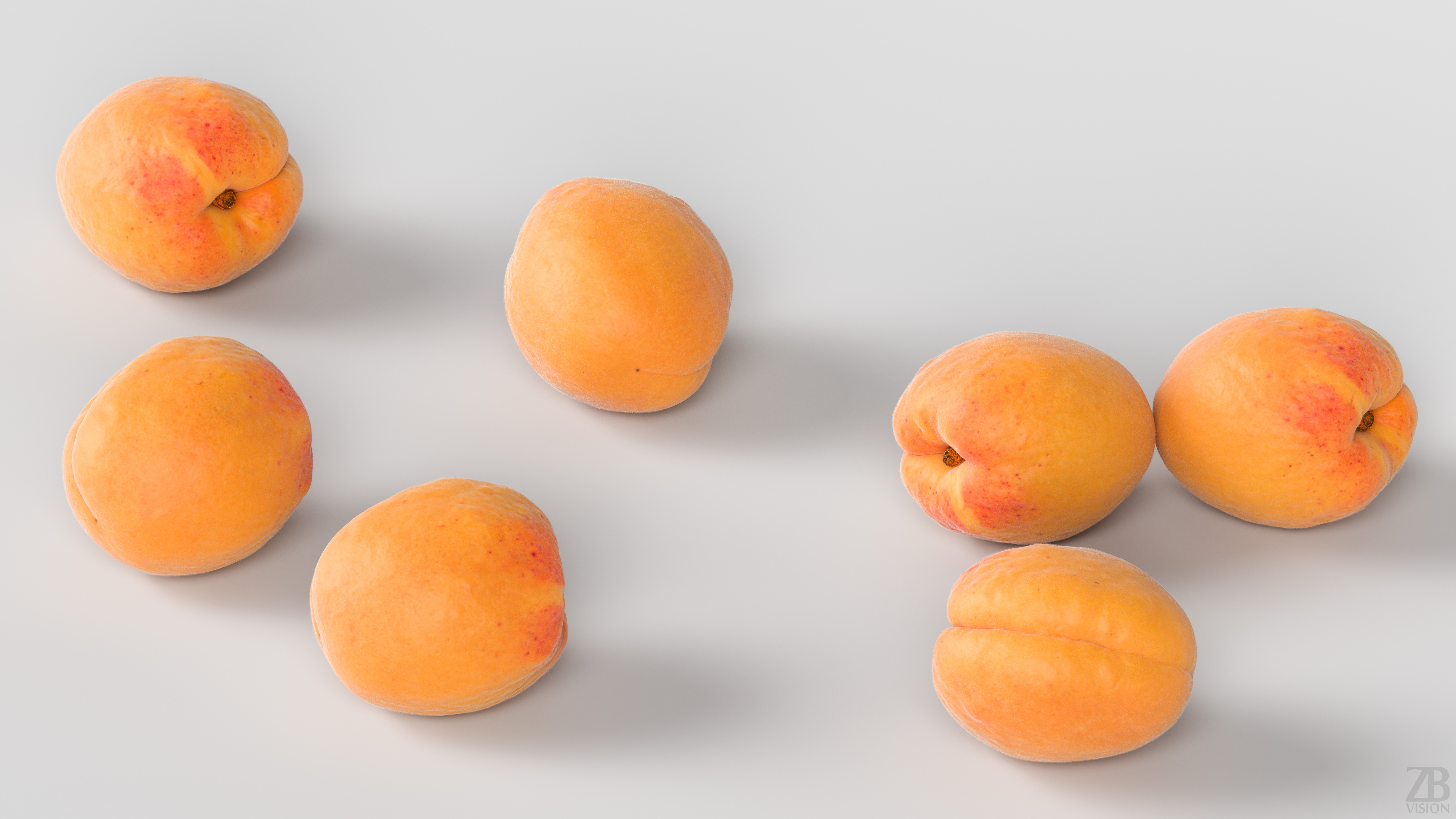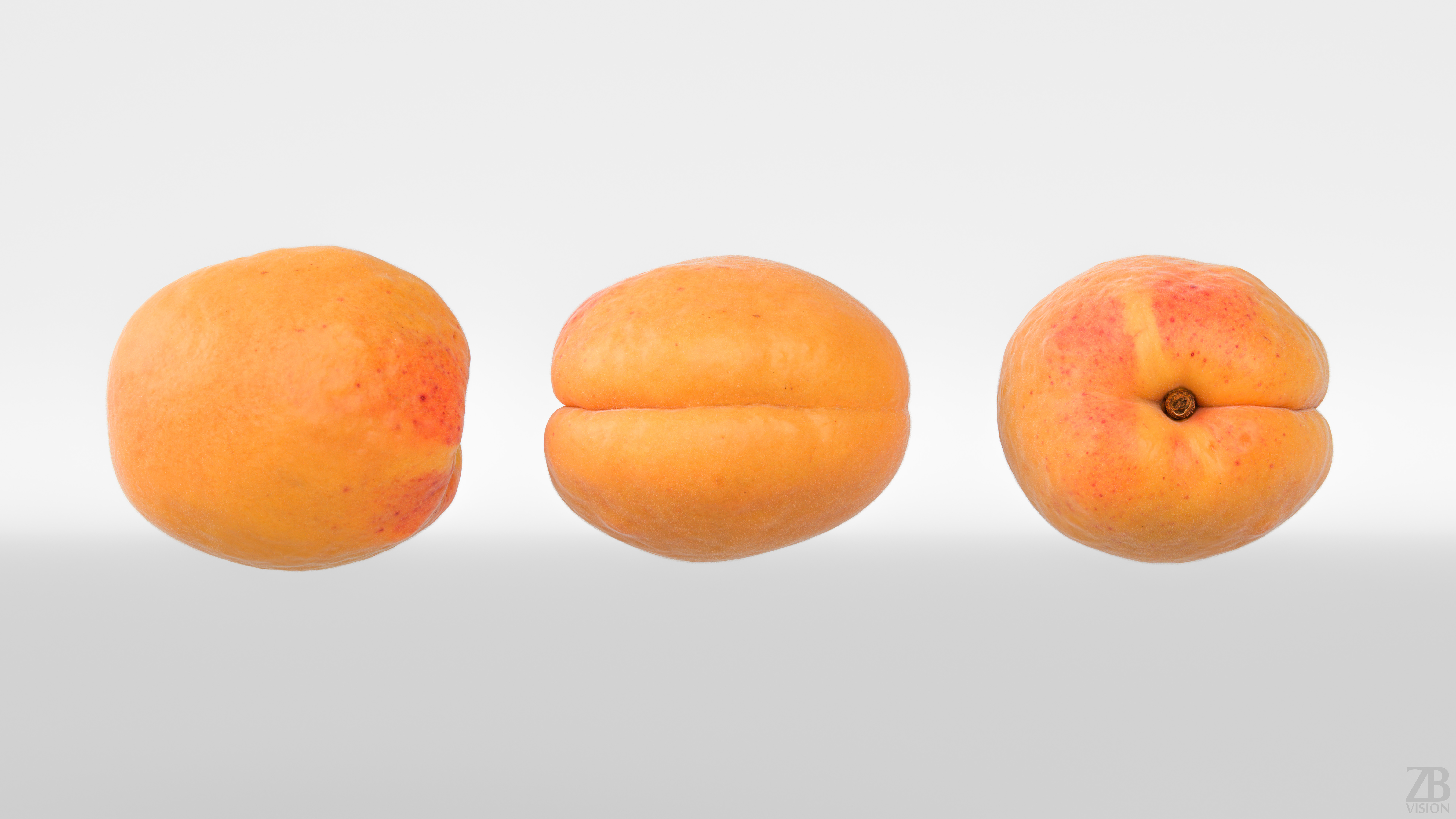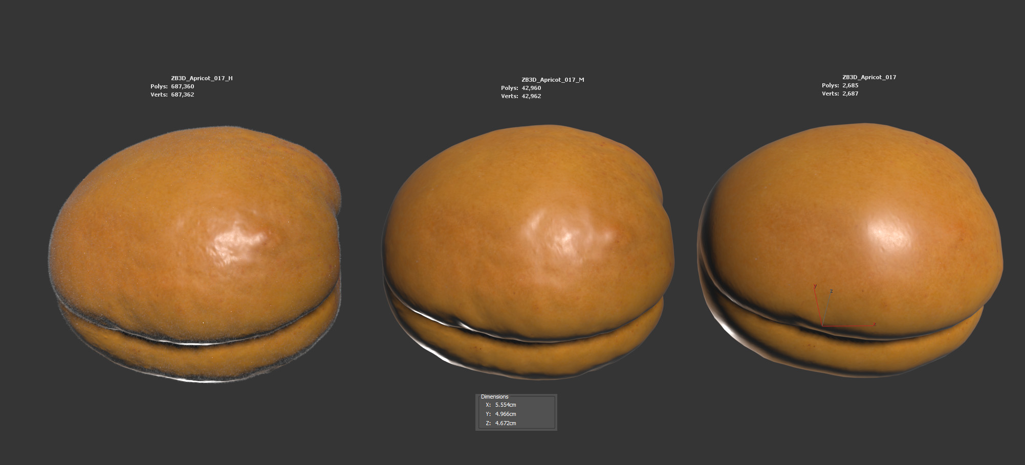The apricot model is presented as a single mesh in 3 subdivision levels: low, mid, and high. Meshes are quad based. The polycounts are 2K, 42K, and 687K. The high-detail model is included in .max, .fbx, and .obj formats.