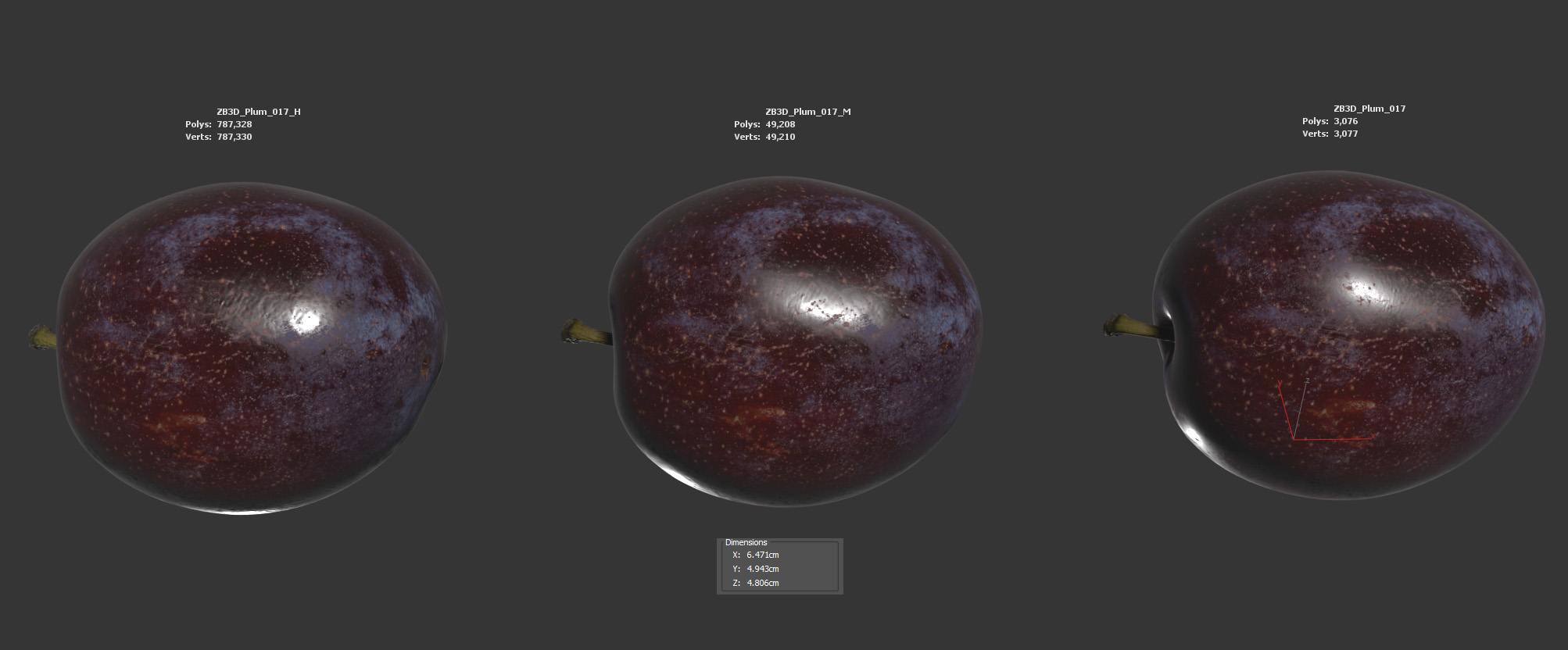 The plum model is presented as a single mesh in 3 subdivision levels: low, mid, and high. Meshes are quad based. The polycounts are 3K, 49K, and 787K. The high-detail model is included in .max, .fbx, and .obj formats.