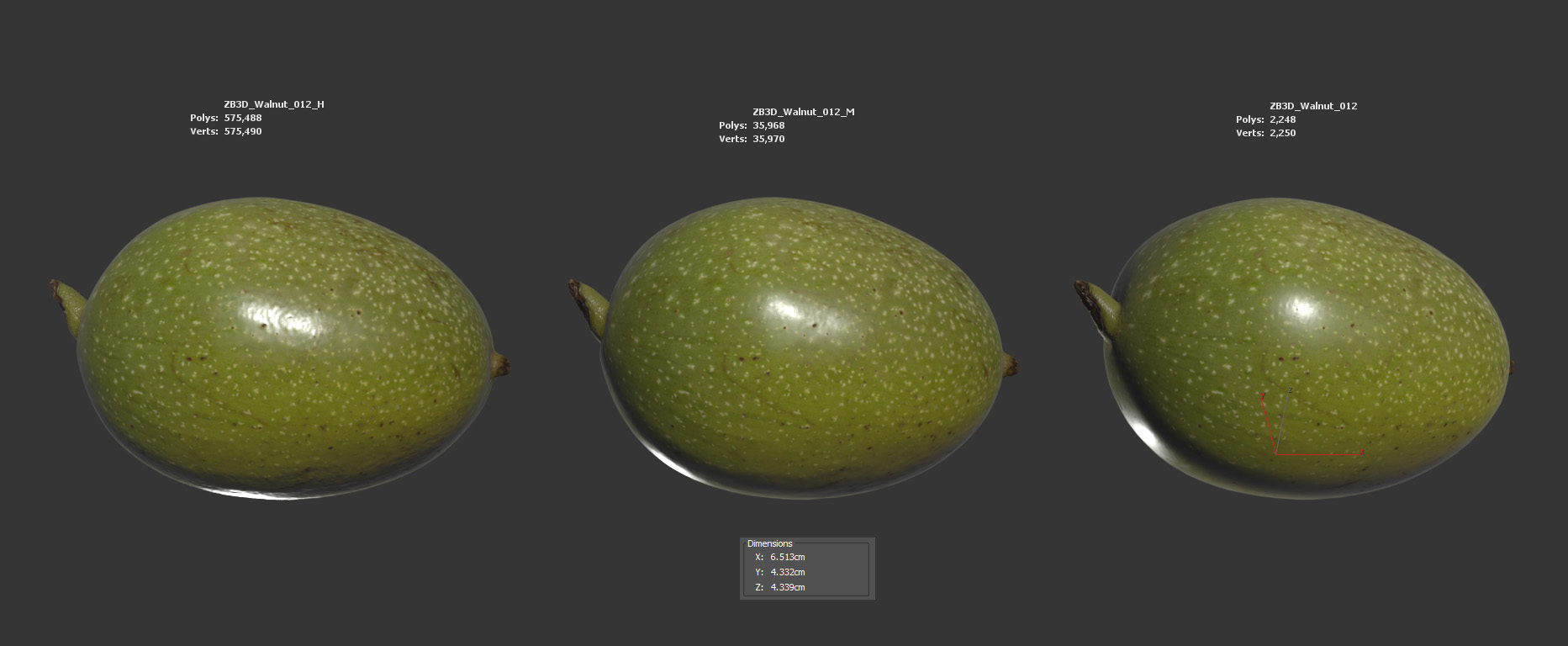 The walnut model is presented as a single mesh in 3 subdivision levels: low, mid, and high. Meshes are quad based. The polycounts are 2K, 35K, and 575K. The high-detail model is included in .max, .fbx, and .obj formats.