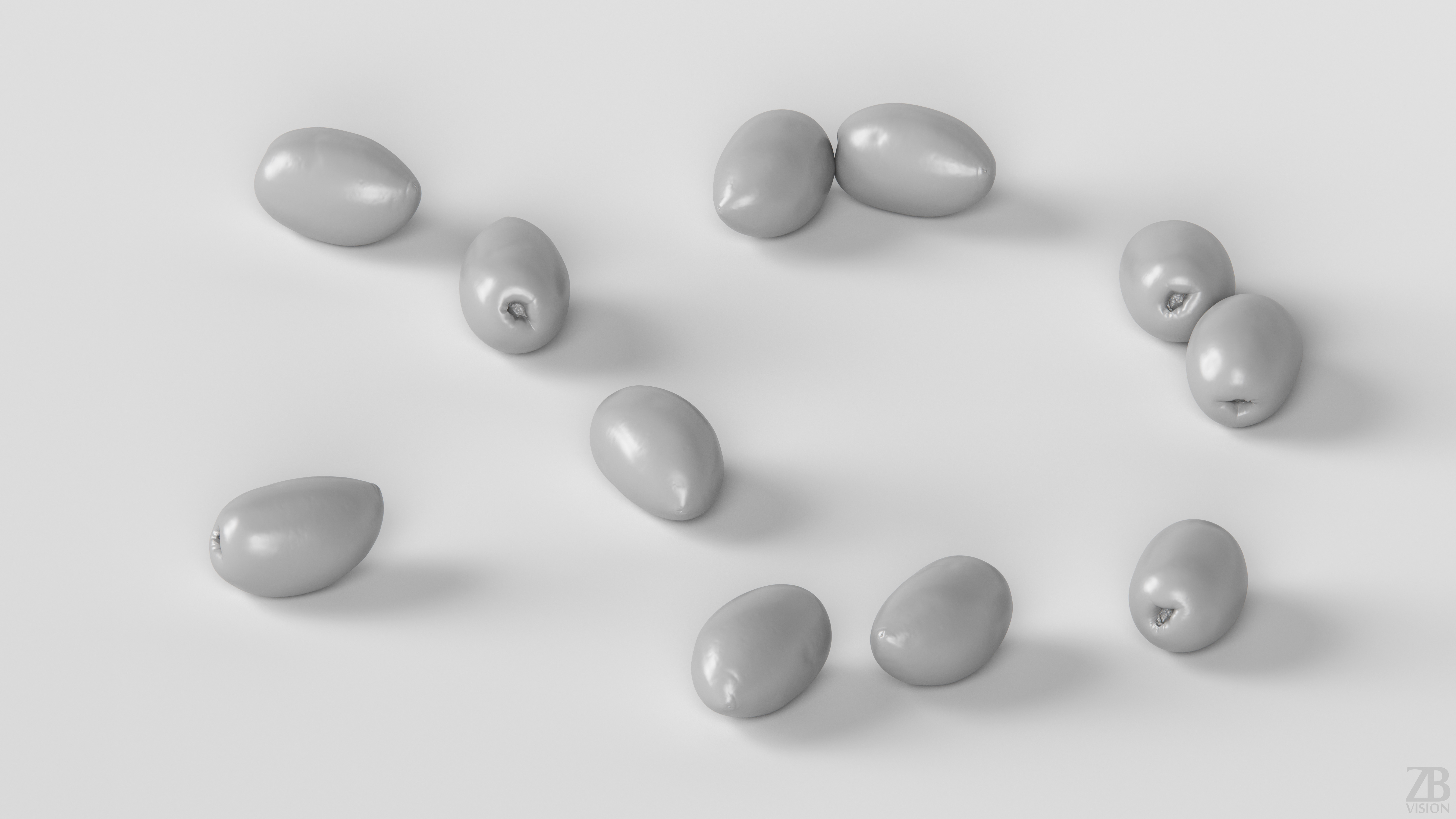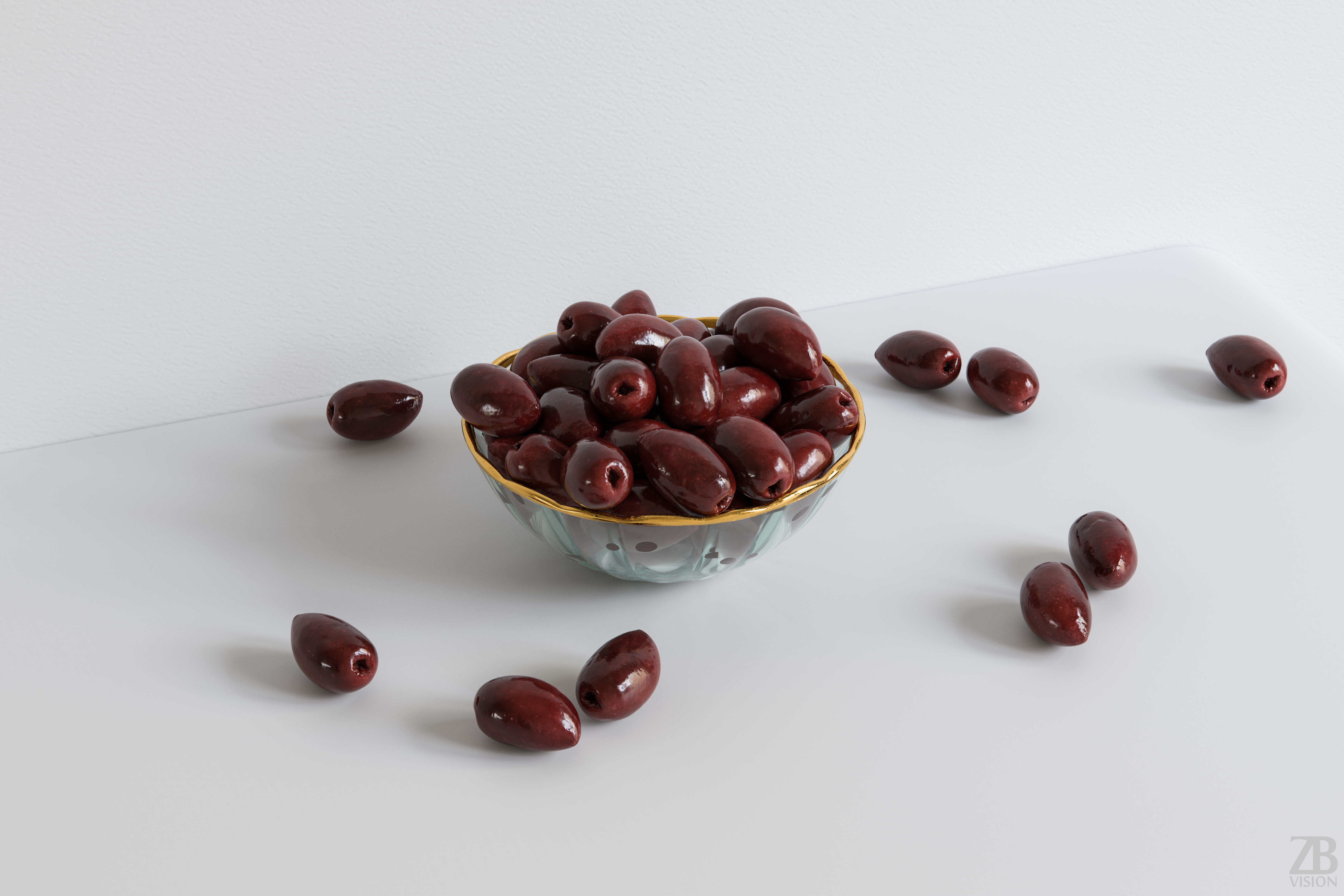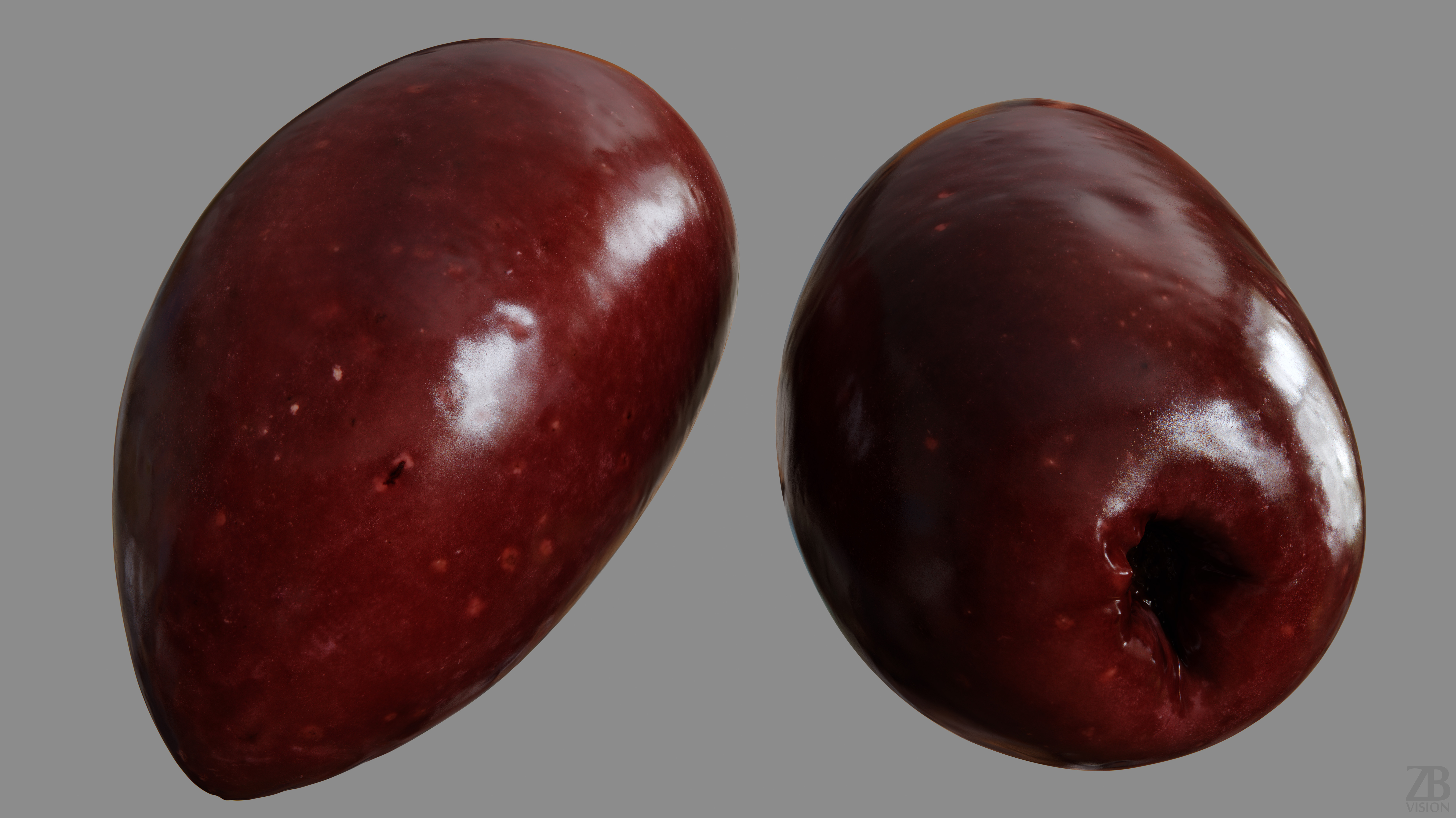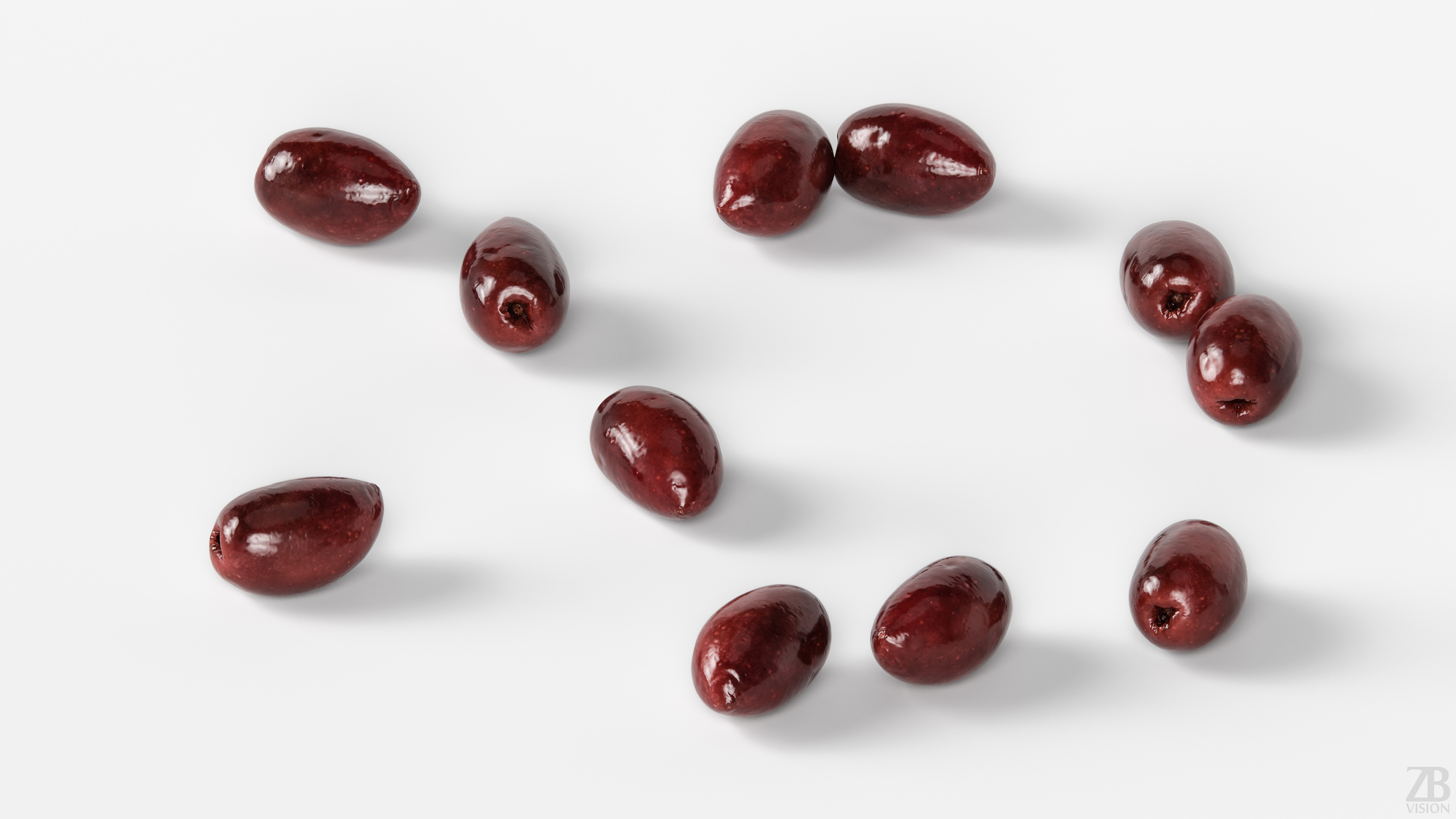 This is a 3d model of an olive, kalamata variety. It was scanned and prepared for photorealistic renderings, close-ups, stills, and animation. The olive model is ready to be inserted into your scene out of the box.