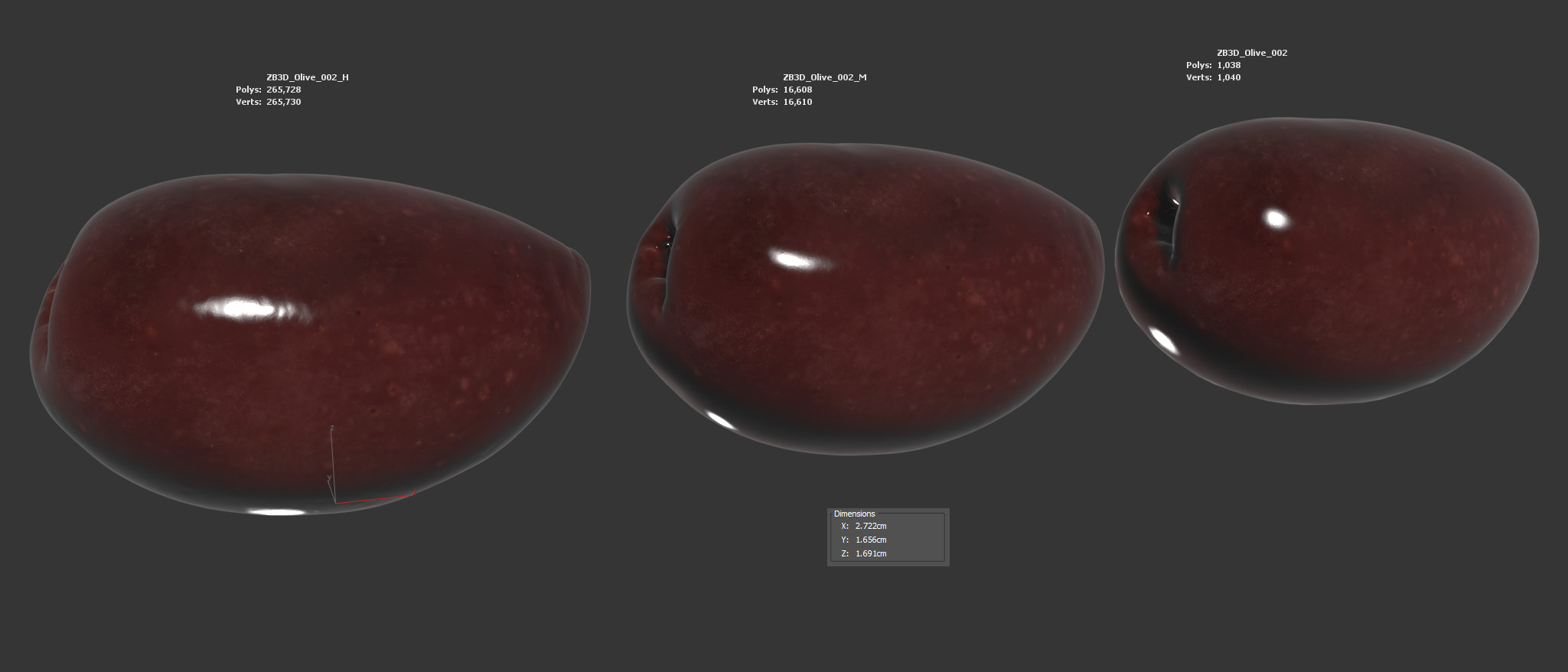 The olive model is presented as a single mesh in 3 subdivision levels: low, mid, and high. Meshes are quad based. The polycounts are 1K, 16K, and 265K. The high-detail model is included in .max, .fbx, and .obj formats.