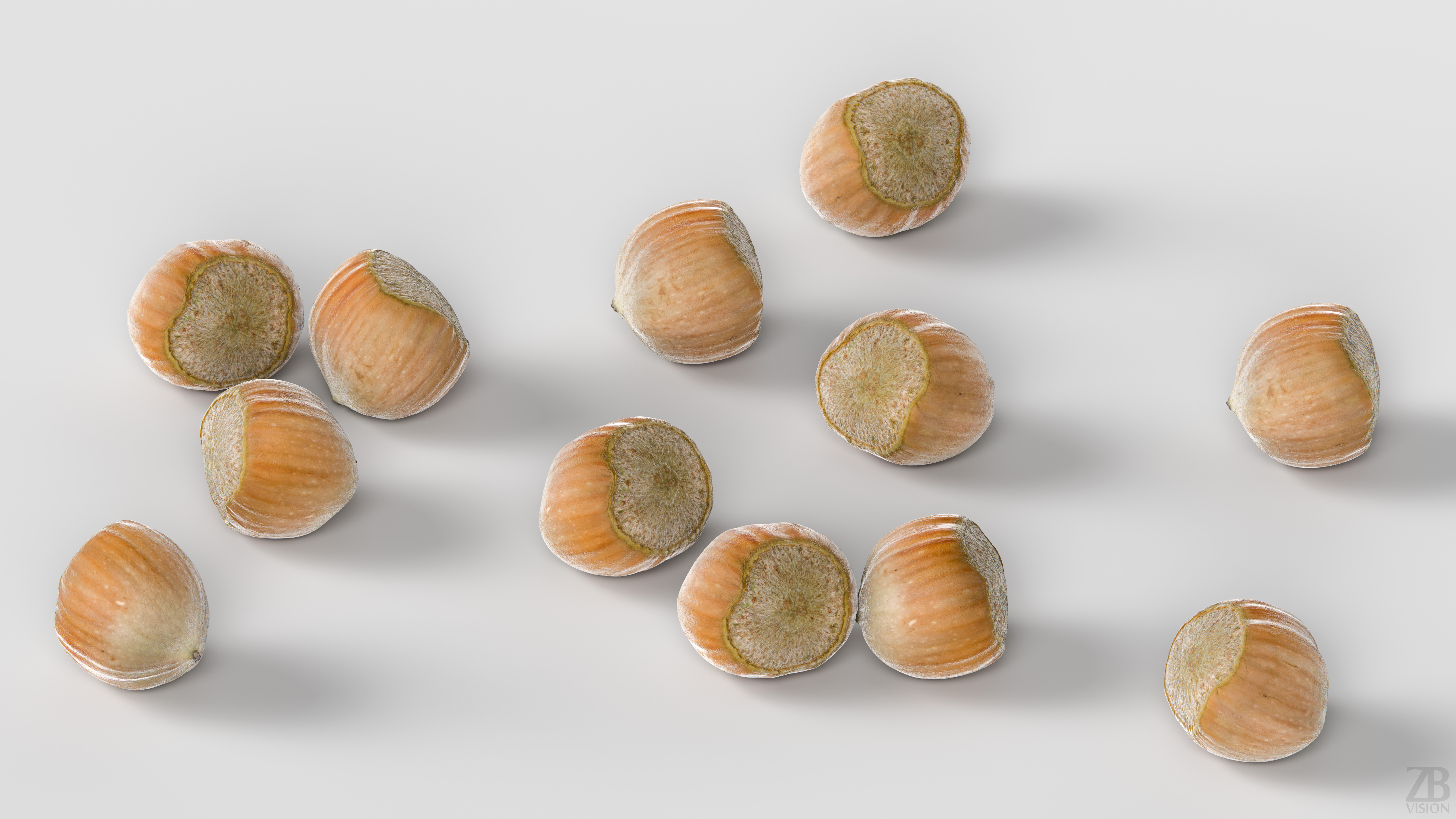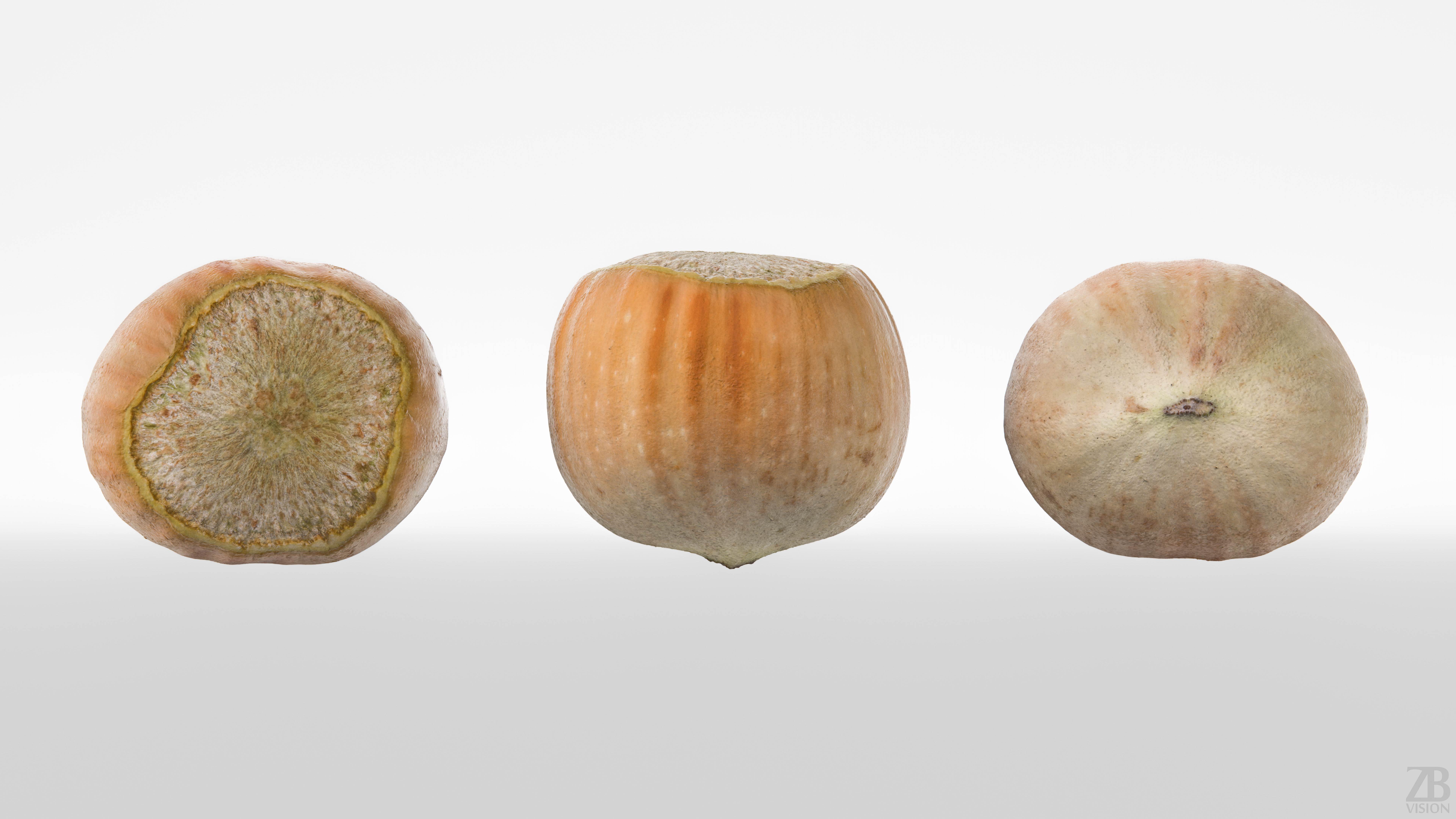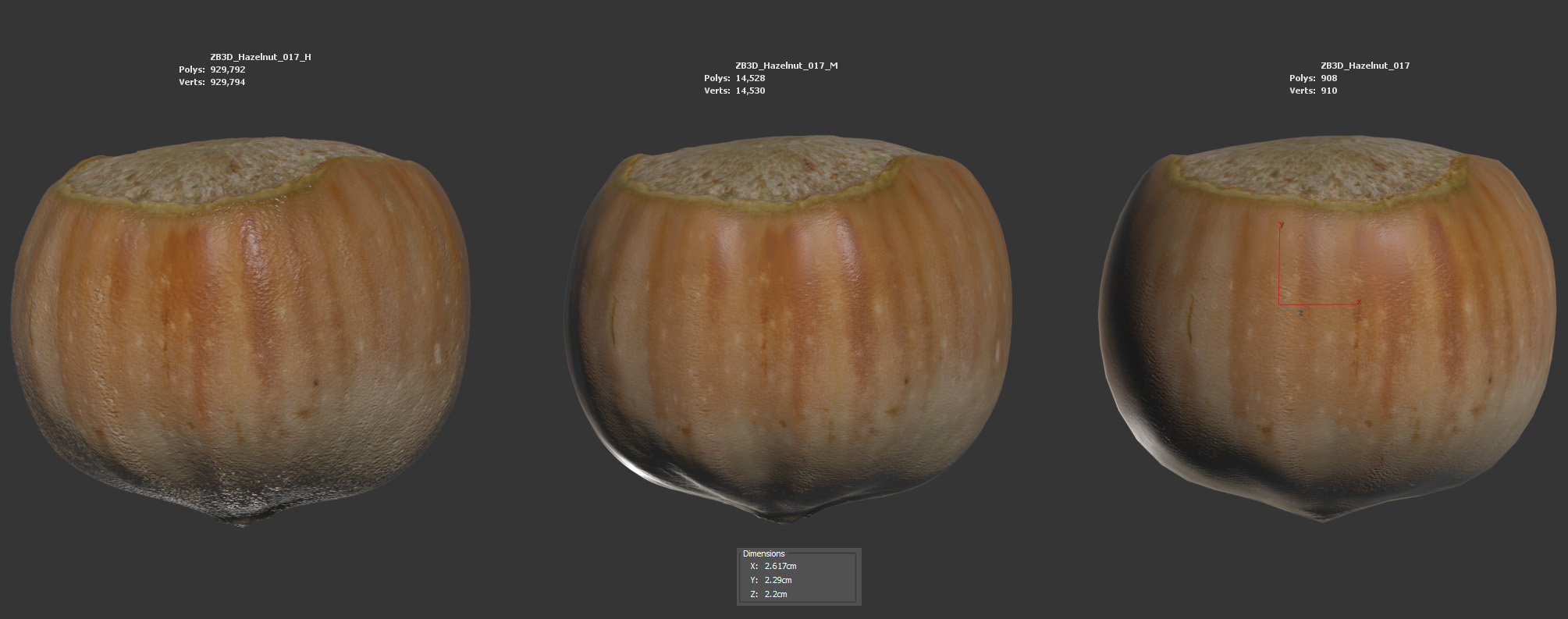 The hazelnut model is presented as a single mesh in 3 subdivision levels: low, mid, and high. Meshes are quad-based. The polycounts are 908, 14K, and 929K. The high-detail model is included in .max, .fbx, and .obj formats.