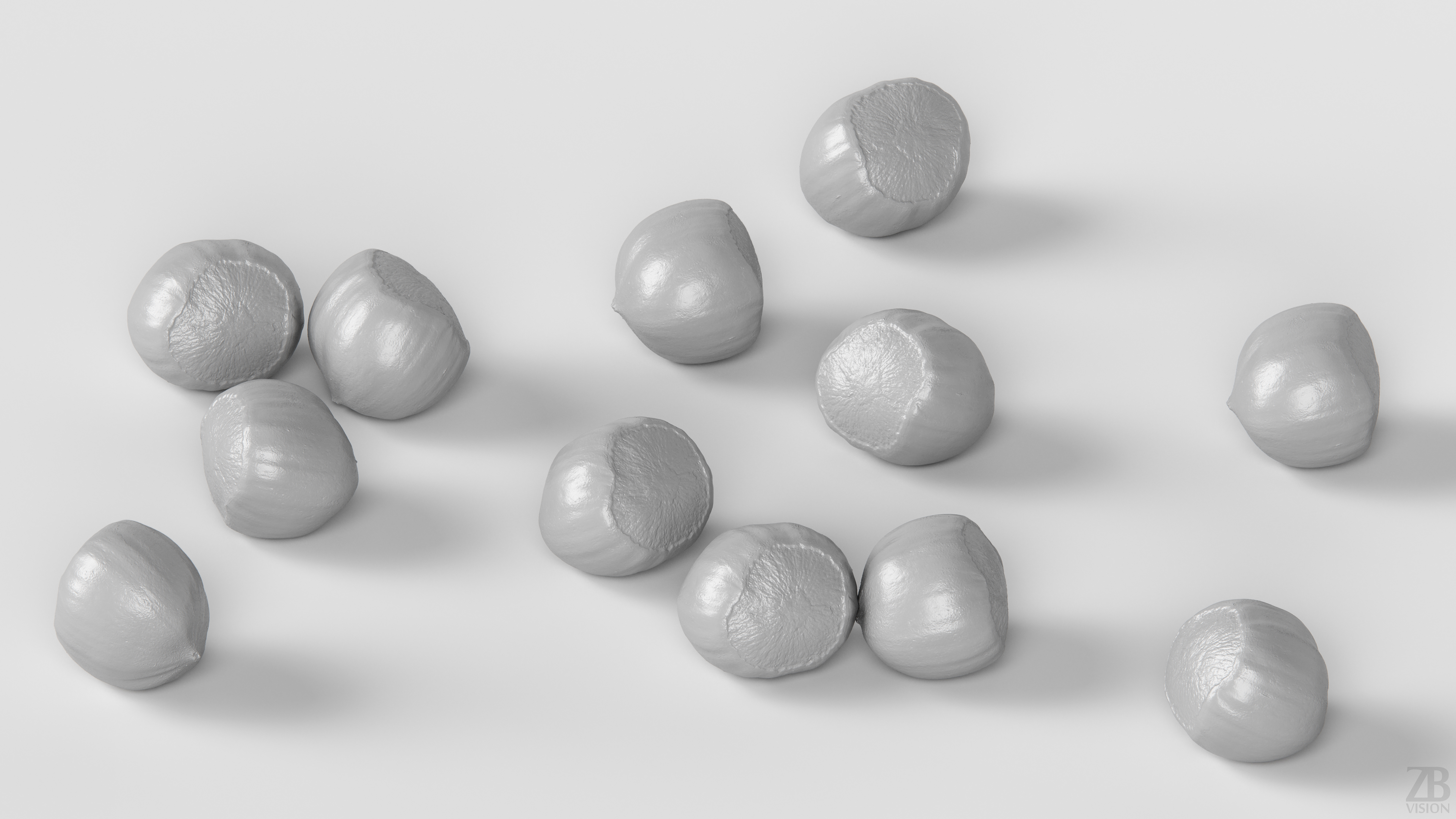 6 maps are supplied with this model. Textures supplied are in JPG format and are in 2K, 4K, and 8K resolution. The texture maps include ao, diffuse, glossiness, roughness, normal, and displacement(tif). The hazelnut model is uvw unwrapped. 16K diffuse included.