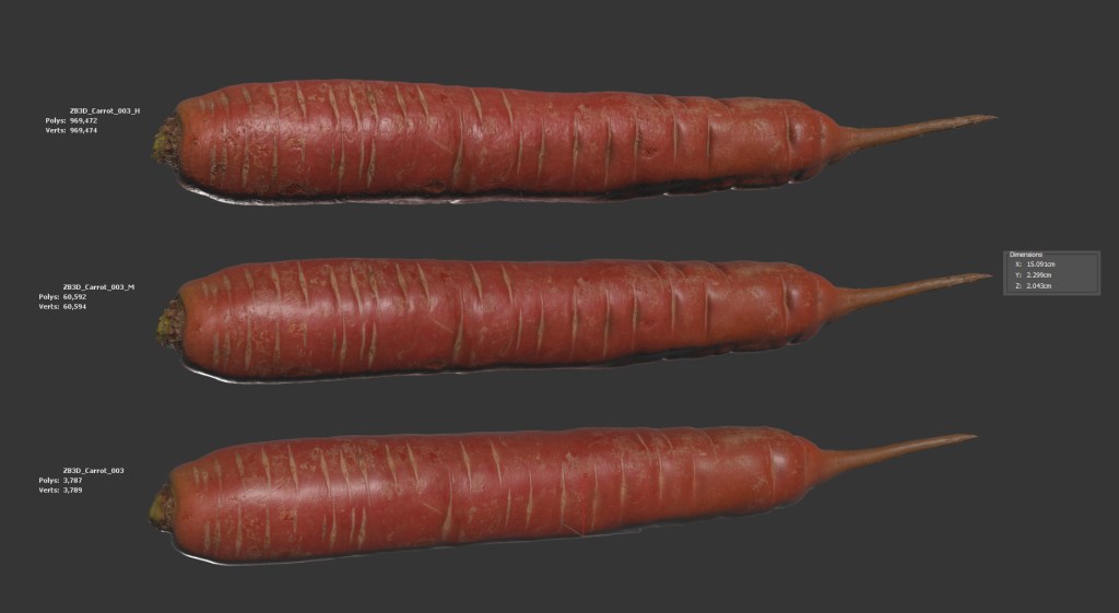 The carrot model is presented as a single mesh in 3 subdivision levels: low, mid, and high. Meshes are quad-based. The polycounts are 3K, 60K, and 969K. The high-detail model is included in .max, .fbx, and .obj formats.