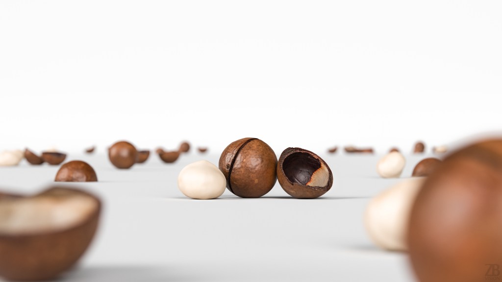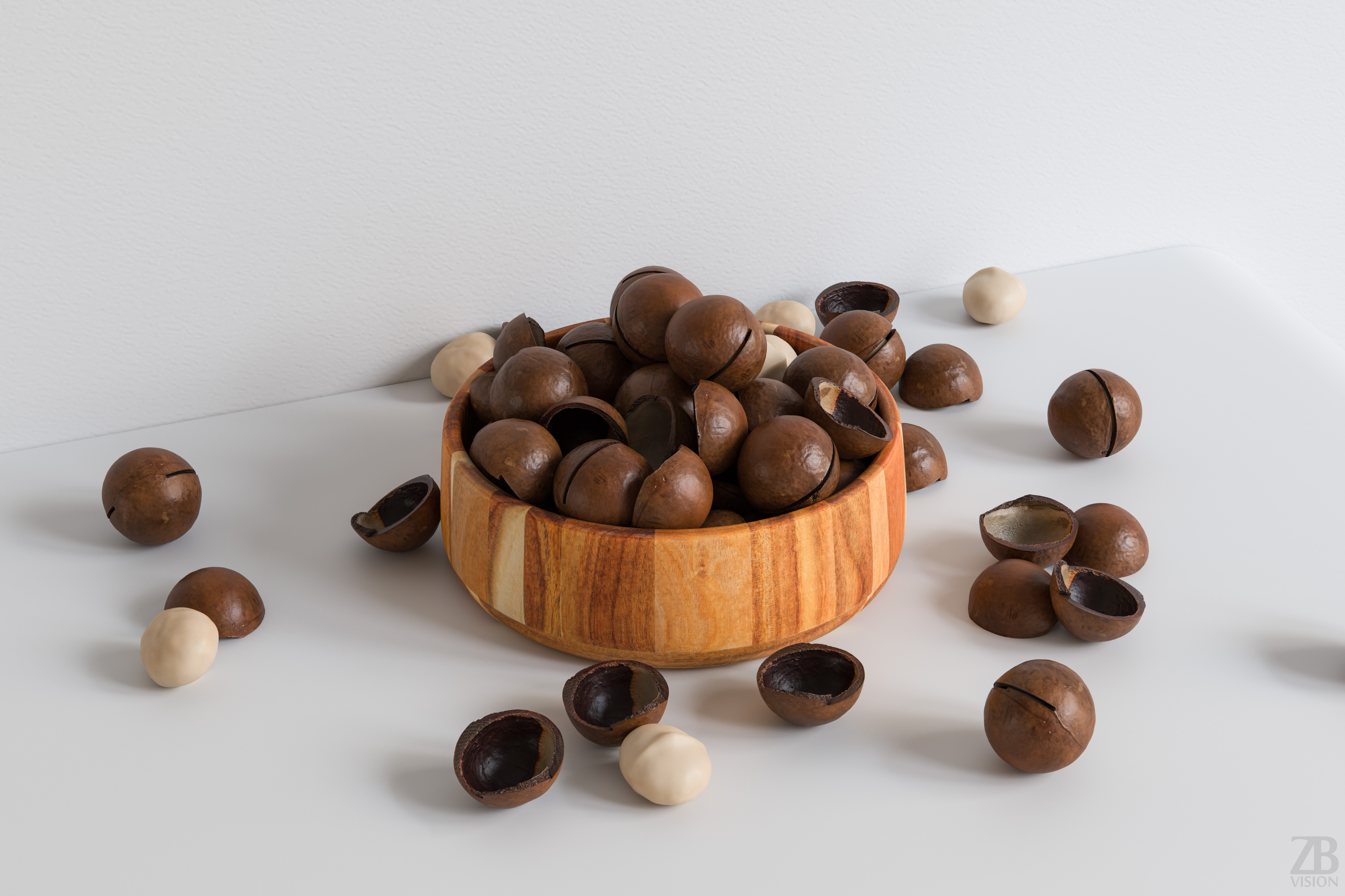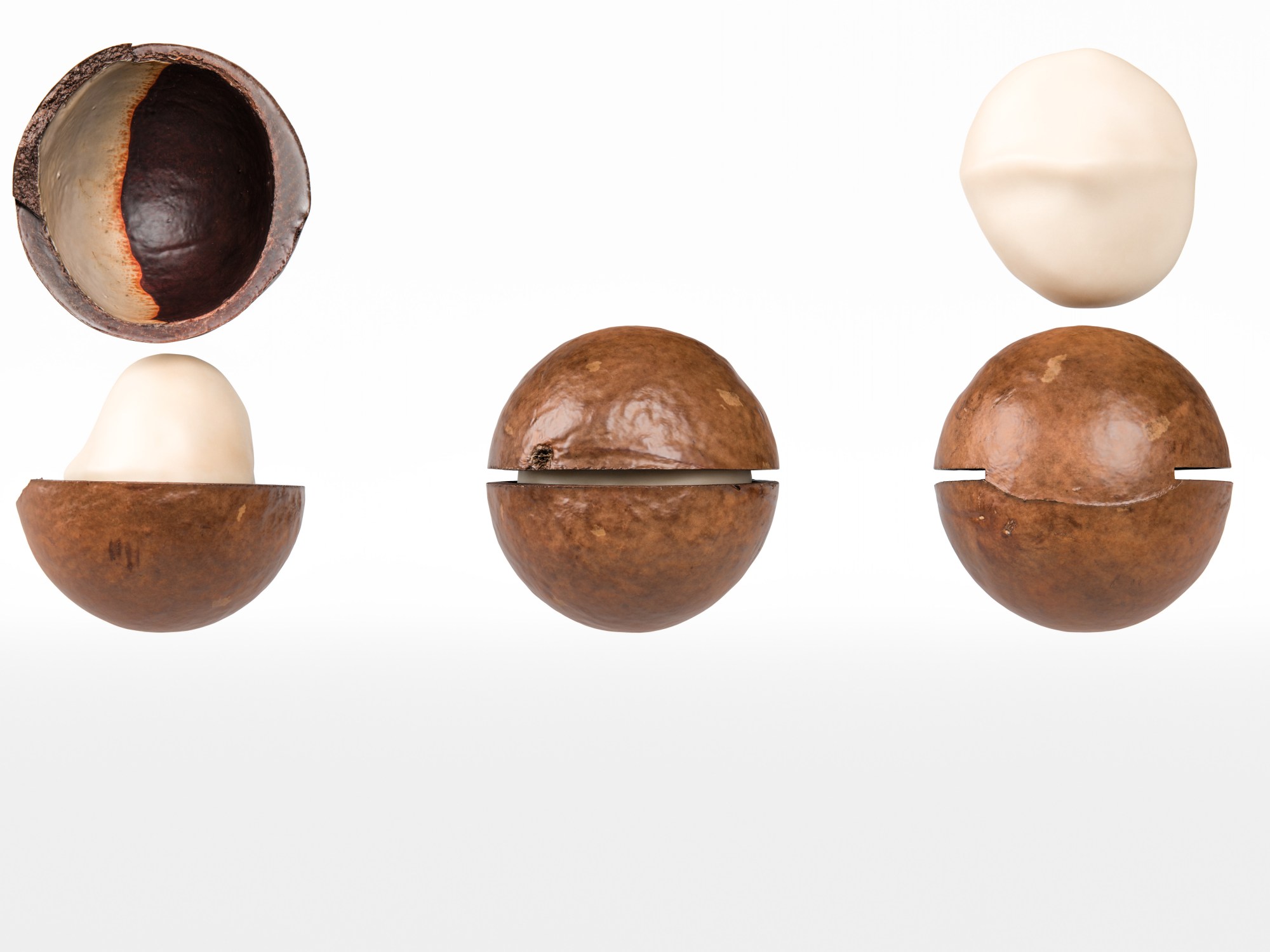This is a 3D model of a macadamia, 2 halves + nut. It was scanned and prepared for photorealistic renderings, close-ups, stills, and animation. The macadamia model is ready to be inserted into your scene out of the box.