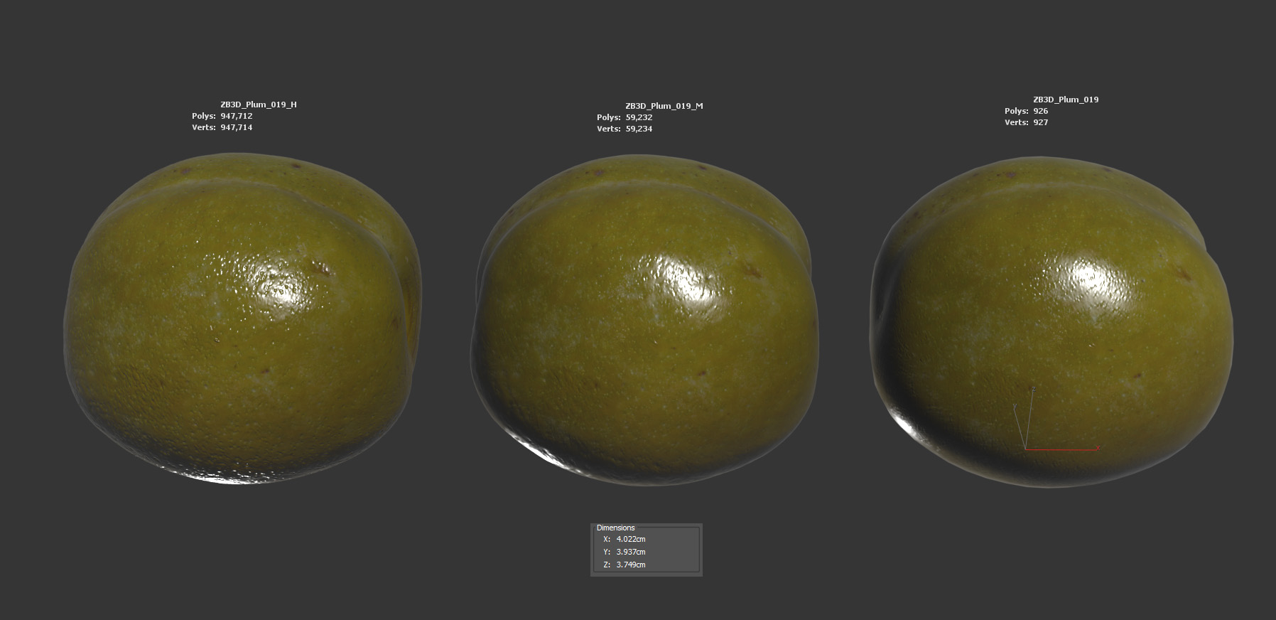 The greengage model is presented as a single mesh in 3 subdivision levels: low, mid, and high. Meshes are quad-based. The polycounts are 926, 59K, and 947K. The high-detail model is included in .max, .fbx, and .obj formats.