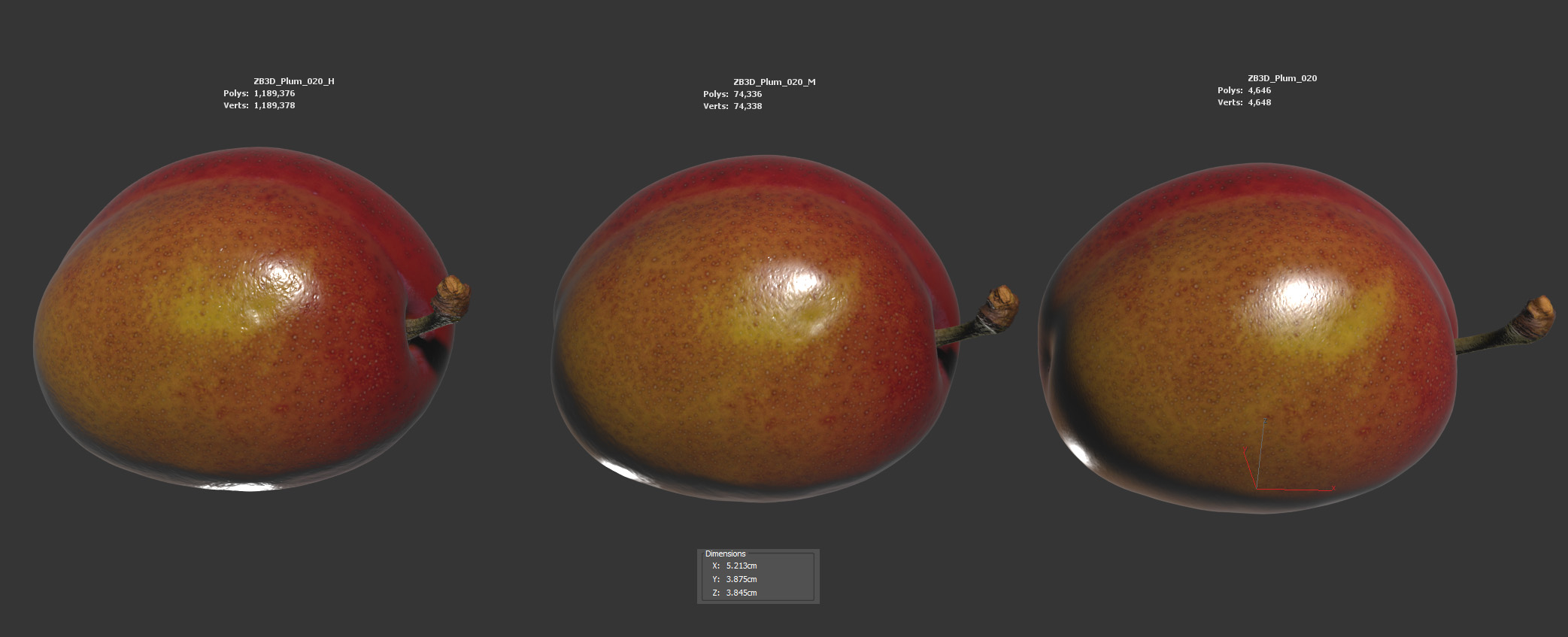 The plum model is presented as a single mesh in 3 subdivision levels: low, mid, and high. Meshes are quad-based. The polycounts are 4K, 74K, and 1189K. The high-detail model is included in .max, .fbx, and .obj formats.