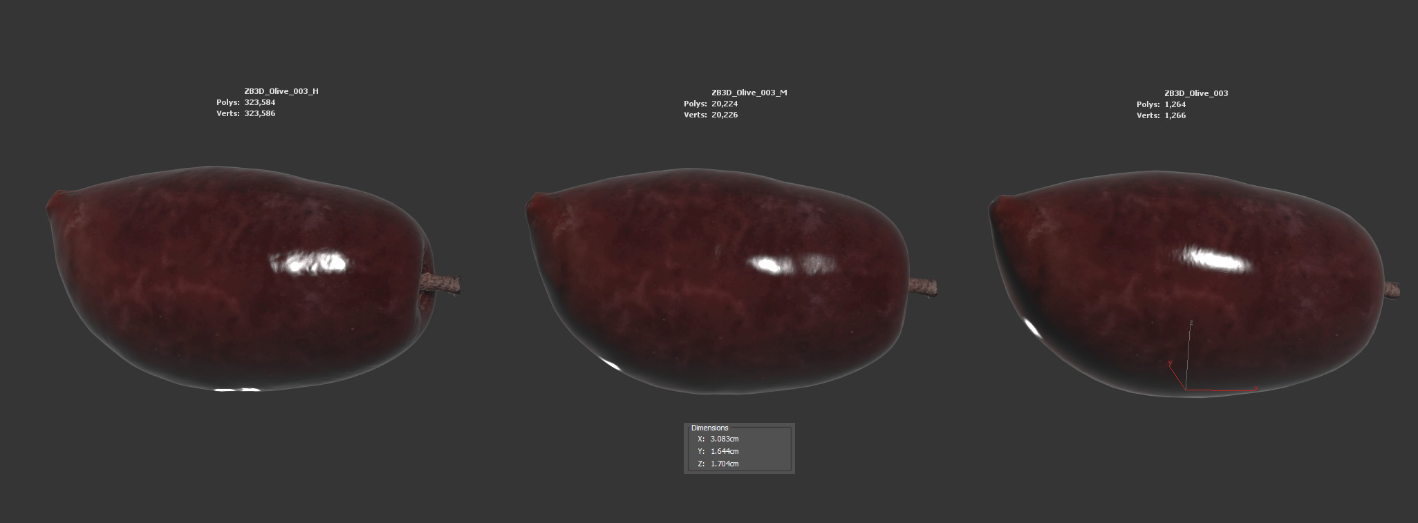 The olive model is presented as a single mesh in 3 subdivision levels: low, mid, and high. Meshes are quad-based. The polycounts are 1K, 20K, and 323K. The high-detail model is included in .max, .fbx, and .obj formats.
