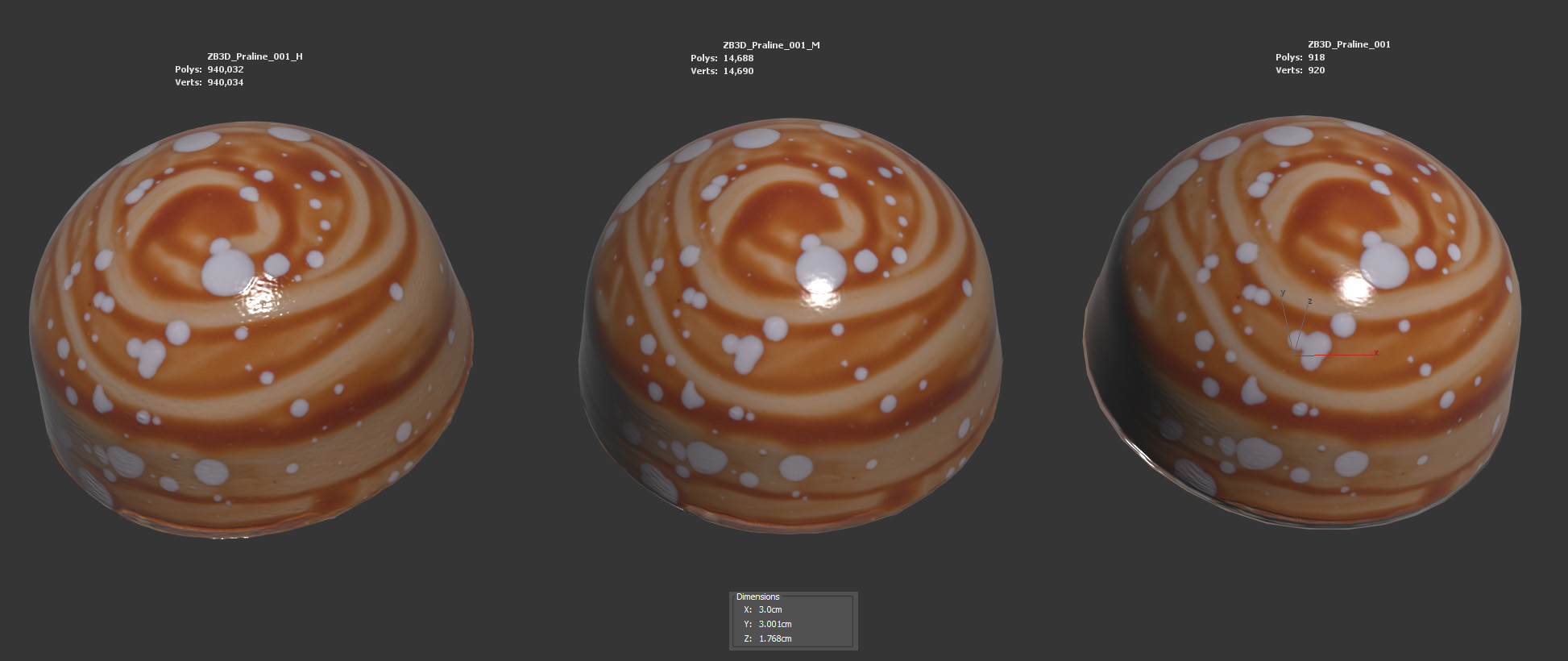 The praline model is presented as a single mesh in 3 subdivision levels: low, mid, and high. Meshes are quad-based. The polycounts are 918, 14K, and 940K. The high-detail model is included in .max, .fbx, and .obj formats.