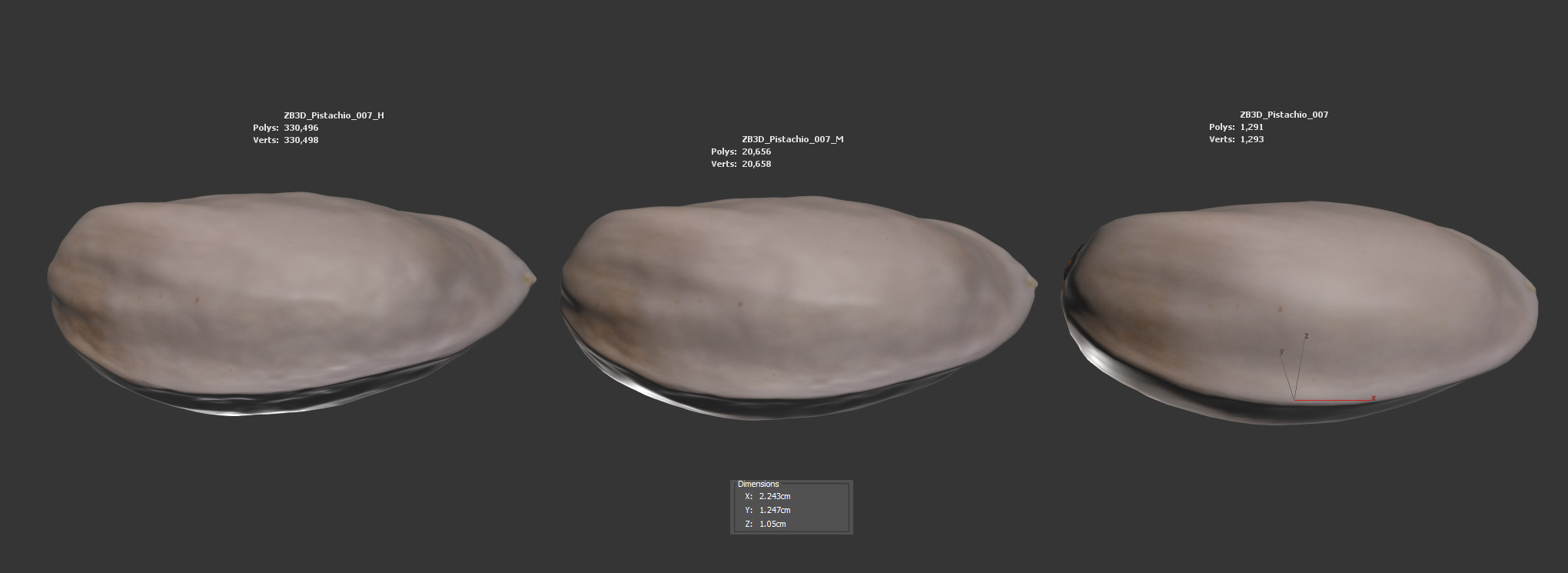 The pistachio model is presented as a single mesh in 3 subdivision levels: low, mid, and high. Meshes are quad-based. The polycounts are 1K, 20K, and 330K. The high-detail model is included in .max, .fbx, and .obj formats.