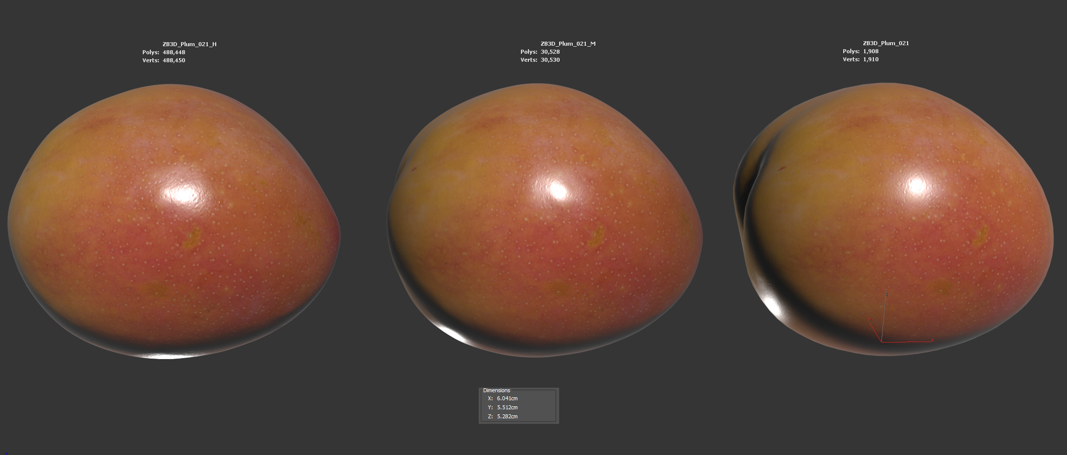 The plum model is presented as a single mesh in 3 subdivision levels: low, mid, and high. Meshes are quad-based. The polycounts are 1K, 30K, and 488K. The high-detail model is included in .max, .fbx, and .obj formats.