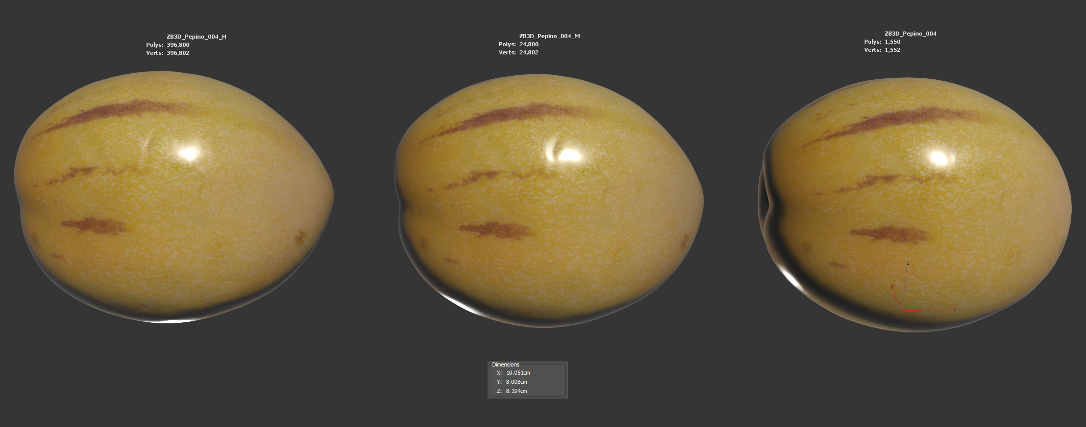 The pepino model is presented as a single mesh in 3 subdivision levels: low, mid, and high. Meshes are quad-based. The polycounts are 1K, 24K, and 396K. The high-detail model is included in .max, .fbx, and .obj formats.