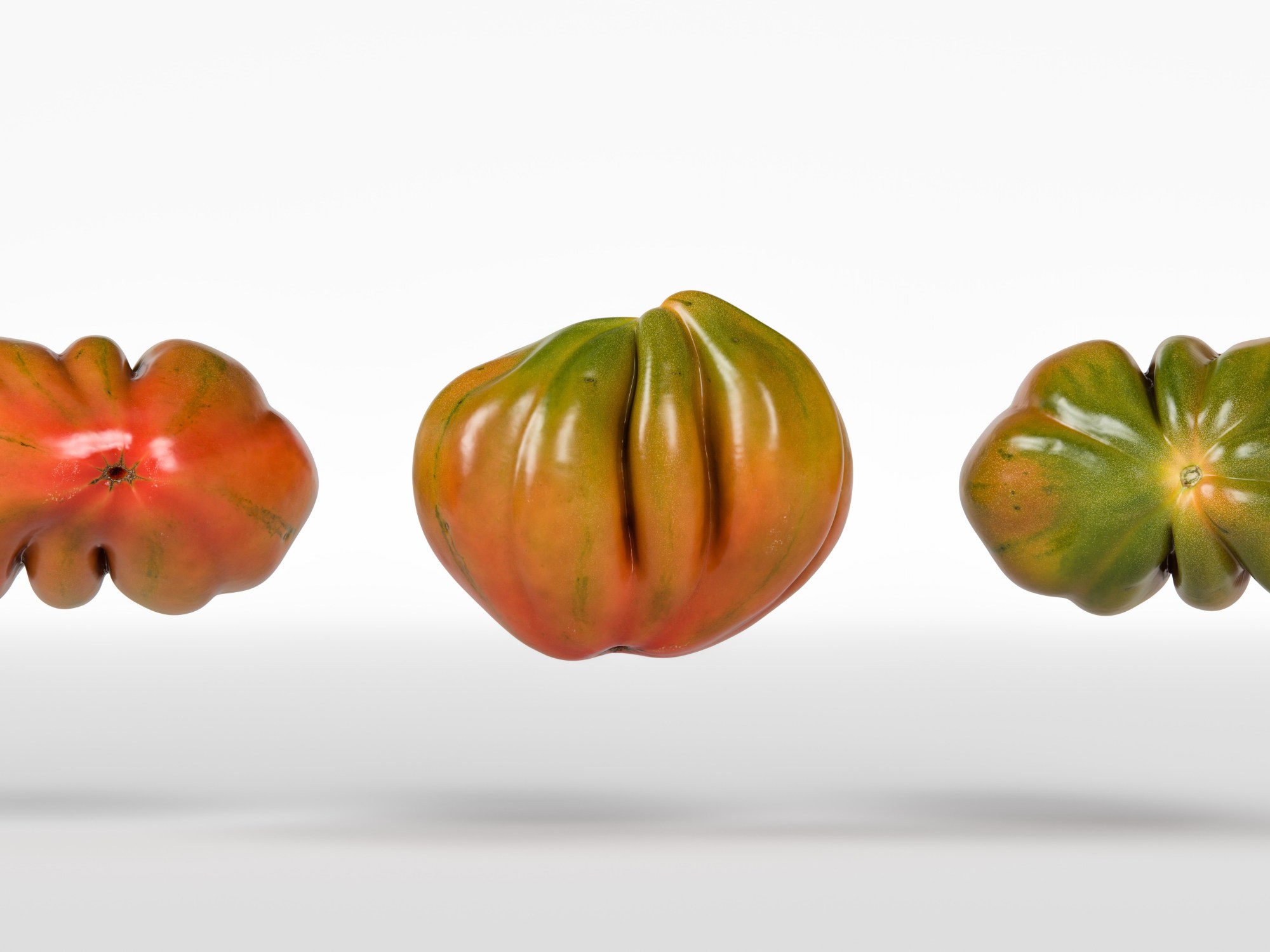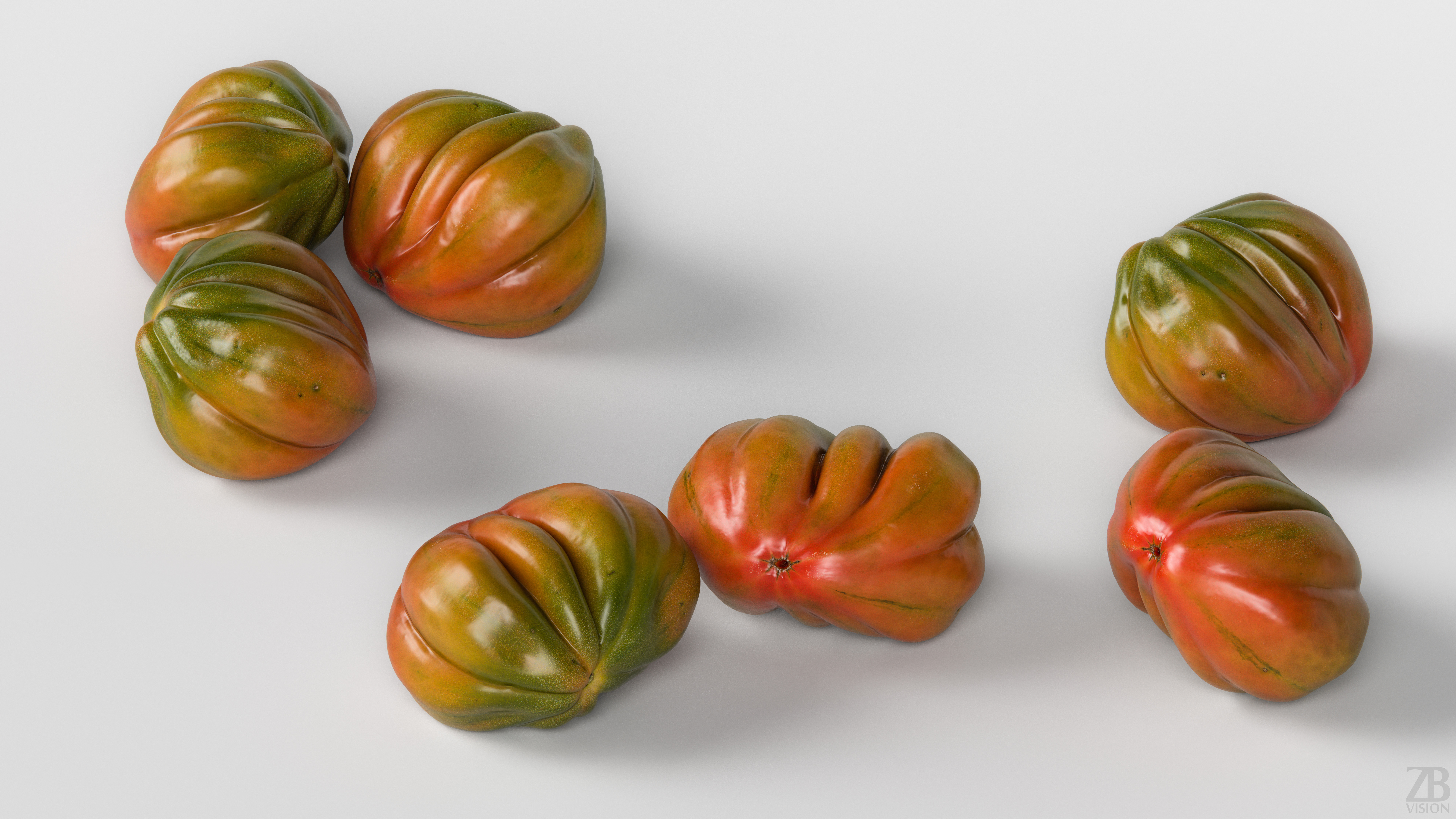 The tomato model is presented as a single mesh in 3 subdivision levels: low, mid, and high. Meshes are quad-based. The polycounts are 3K, 62K, and 1006K. The high-detail model is included in .max, .fbx, and .obj formats.