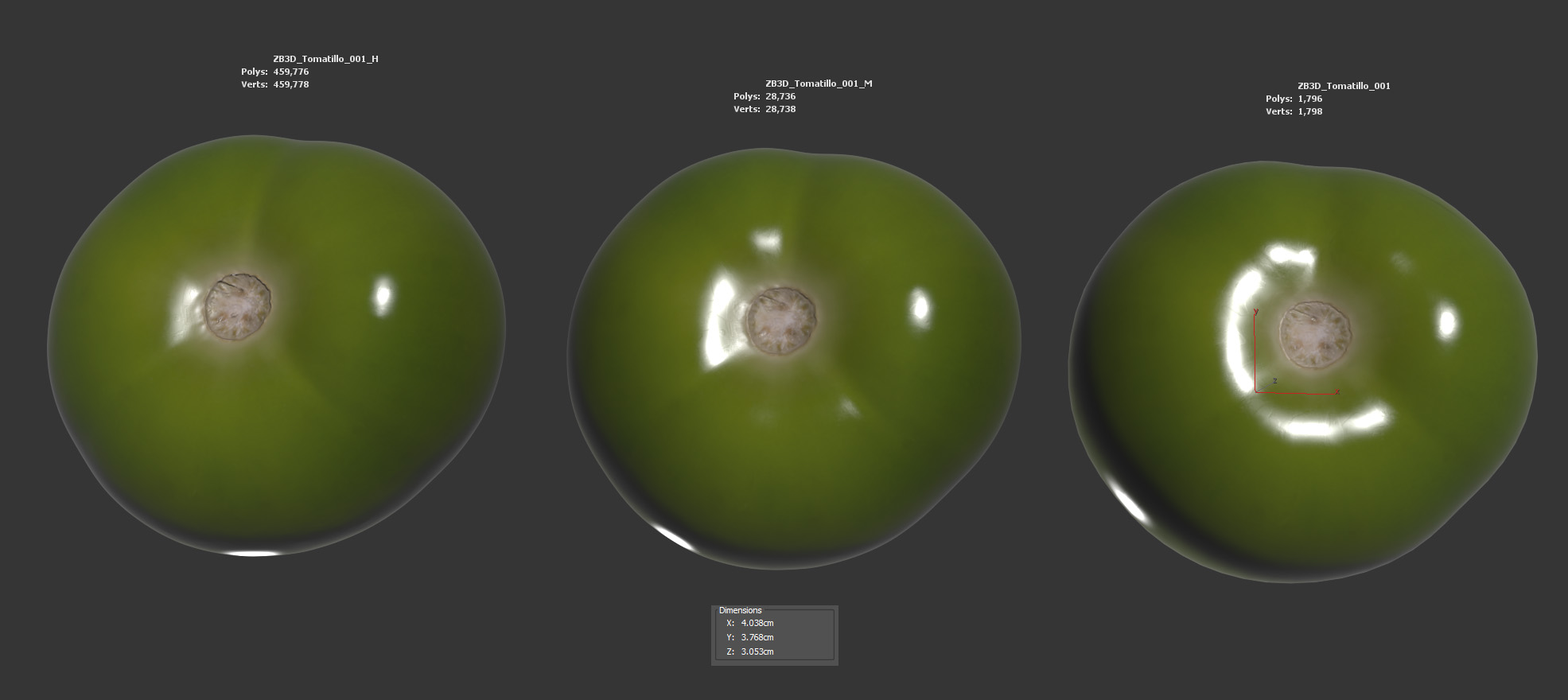 The tomatillo model is presented as a single mesh in 3 subdivision levels: low, mid, and high. Meshes are quad-based. The polycounts are 1K, 28K, and 459K. The high-detail model is included in .max, .fbx, and .obj formats.