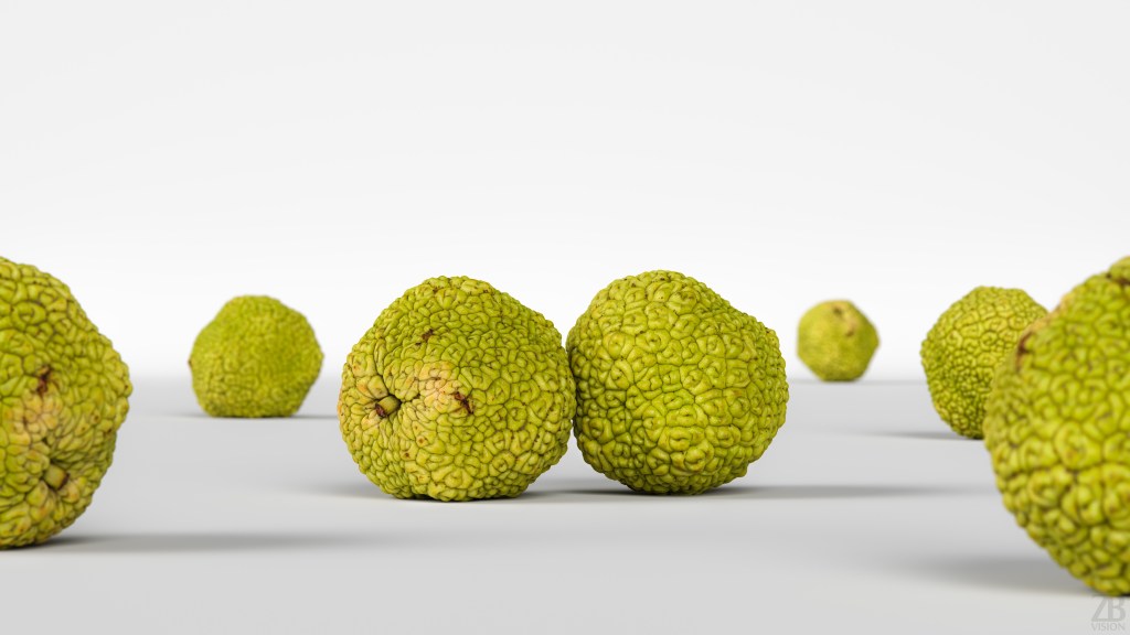 All preview images were rendered with Corona Renderer. You will get only the osage orange, not the scenes used for preview renders. Please also consider that the preview images are the result of the post-production and the look of the osage orange 3D model in your scene may differ due to the specific settings of your 3D setup. The product is ready to render out-of-the-box. Please note that the lights, cameras, and any background not described above objects are not included in the product. The model is clean and alone in the provided files, centered at the origin, and has a real-world scale.