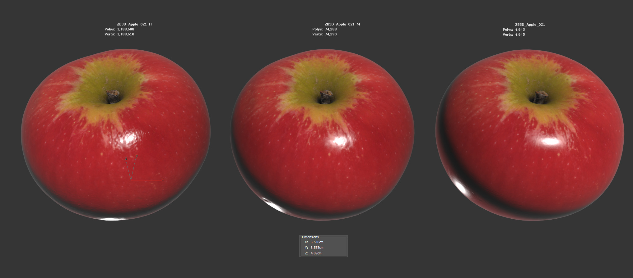 The apple model is presented as a single mesh in 3 subdivision levels: low, mid, and high. Meshes are quad-based. The polycounts are 4K, 74K, and 1188K. The high-detail model is included in .max, .fbx, and .obj formats.