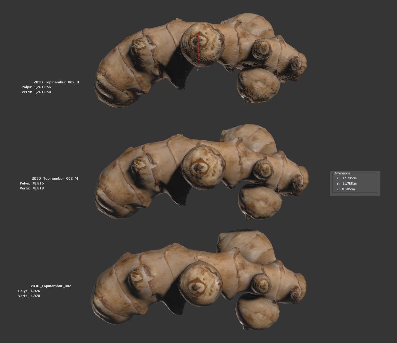 The topinambur model is presented as a single mesh in 3 subdivision levels: low, mid, and high. Meshes aare quad-based. The polycounts are 4K, 78K, and 1261K. The high-detail model is included in .max, .fbx, and .obj formats.