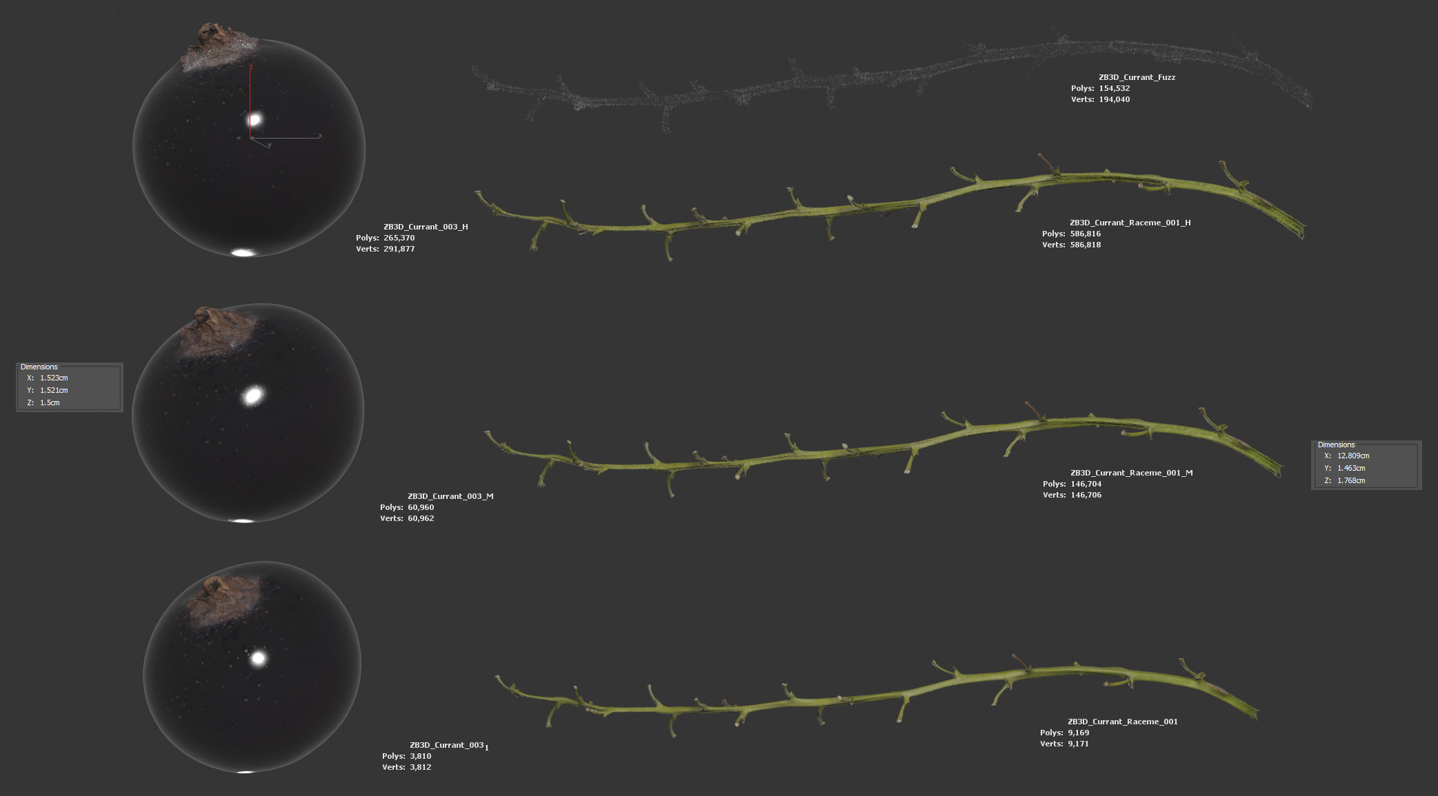 The black currant model is presented as a single mesh in 3 subdivision levels: low, mid, and high. Meshes are quad-based. The polycounts are 89K, 1757K, and 6246K. The high-detail model is included in .max, .fbx, and .obj formats.