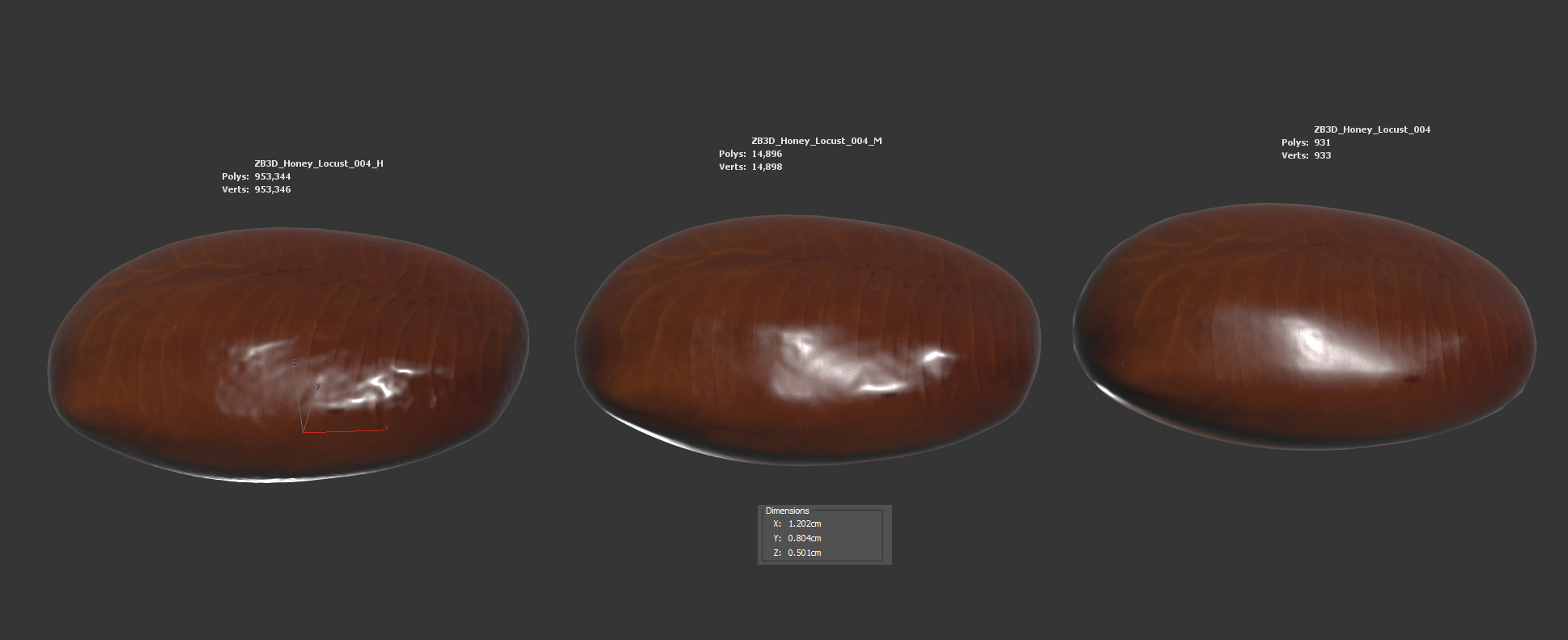 The honey locust model is presented as a single mesh in 3 subdivision levels: low, mid, and high. Meshes are quad-based. The polycounts are 931, 14K, and 953K. The high-detail model is included in .max, .fbx, and .obj formats.