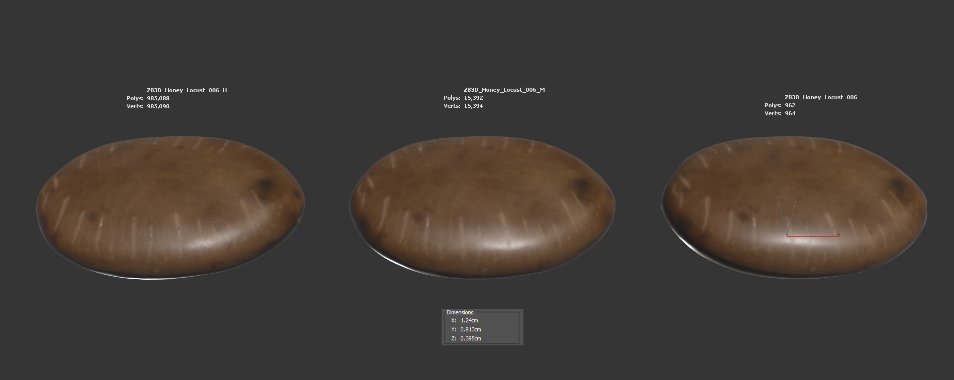The honey locust model is presented as a single mesh in 3 subdivision levels: low, mid, and high. Meshes are quad-based. The polycounts are 962, 15K, and 985K. The high-detail model is included in .max, .fbx, and .obj formats.