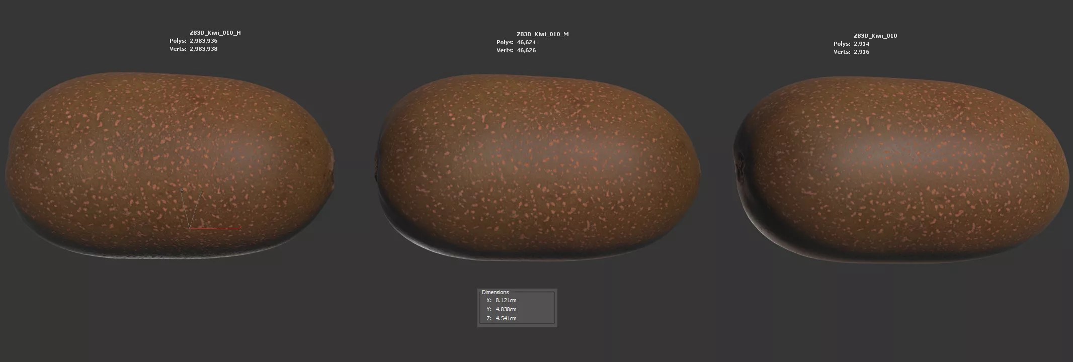 The kiwi model is presented as a single mesh in 3 subdivision levels: low, mid, and high. Meshes are quad-based. The polycounts are 2K, 46K, and 2983K. The high-detail model is included in .max, .fbx, and .obj formats.