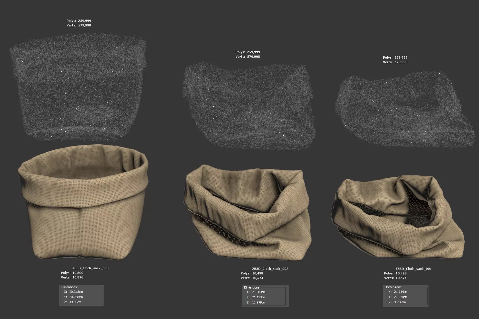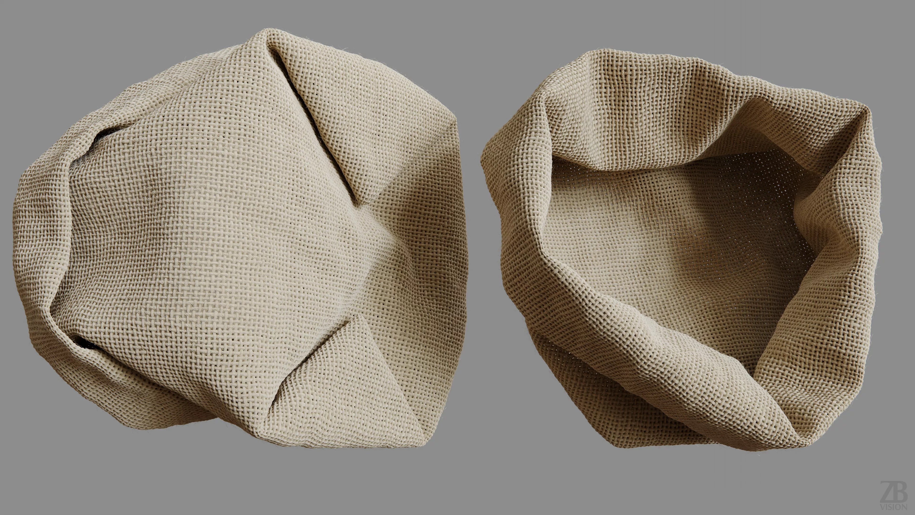 The burlap bag models are presented as single meshes in 3 versions. Meshes are quad-based. The polycounts are roughly the same for all 3 ~10K quads. Each of the bags is provided with fuzz/fibers mesh to enhance the visuals – the fibers all have the same polycount of 259K. The bag models are included in .max, .fbx, and .obj formats. The original mesh is a one-sided type of geometry, but .fbx and .obj are provided both as one-sided and with shell/thickness variations. .max format has a non-collapsed modifier stack with Shell and TurboSmooth for your convenience.