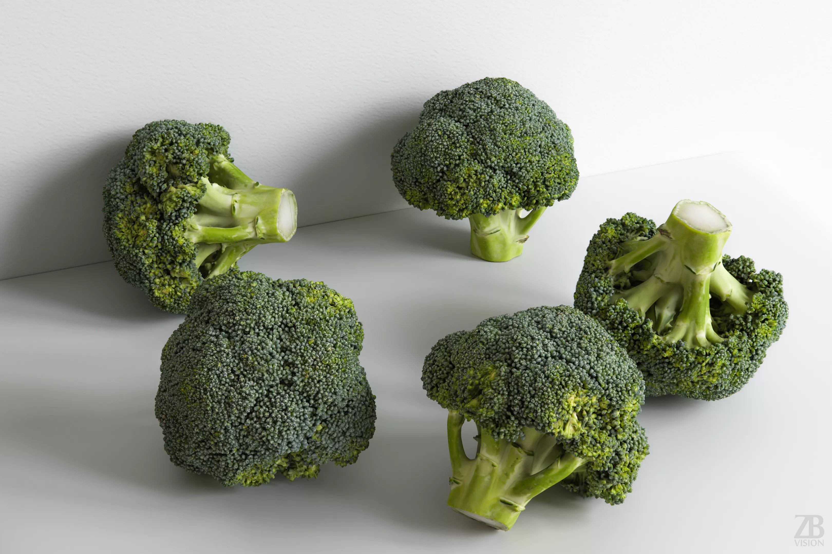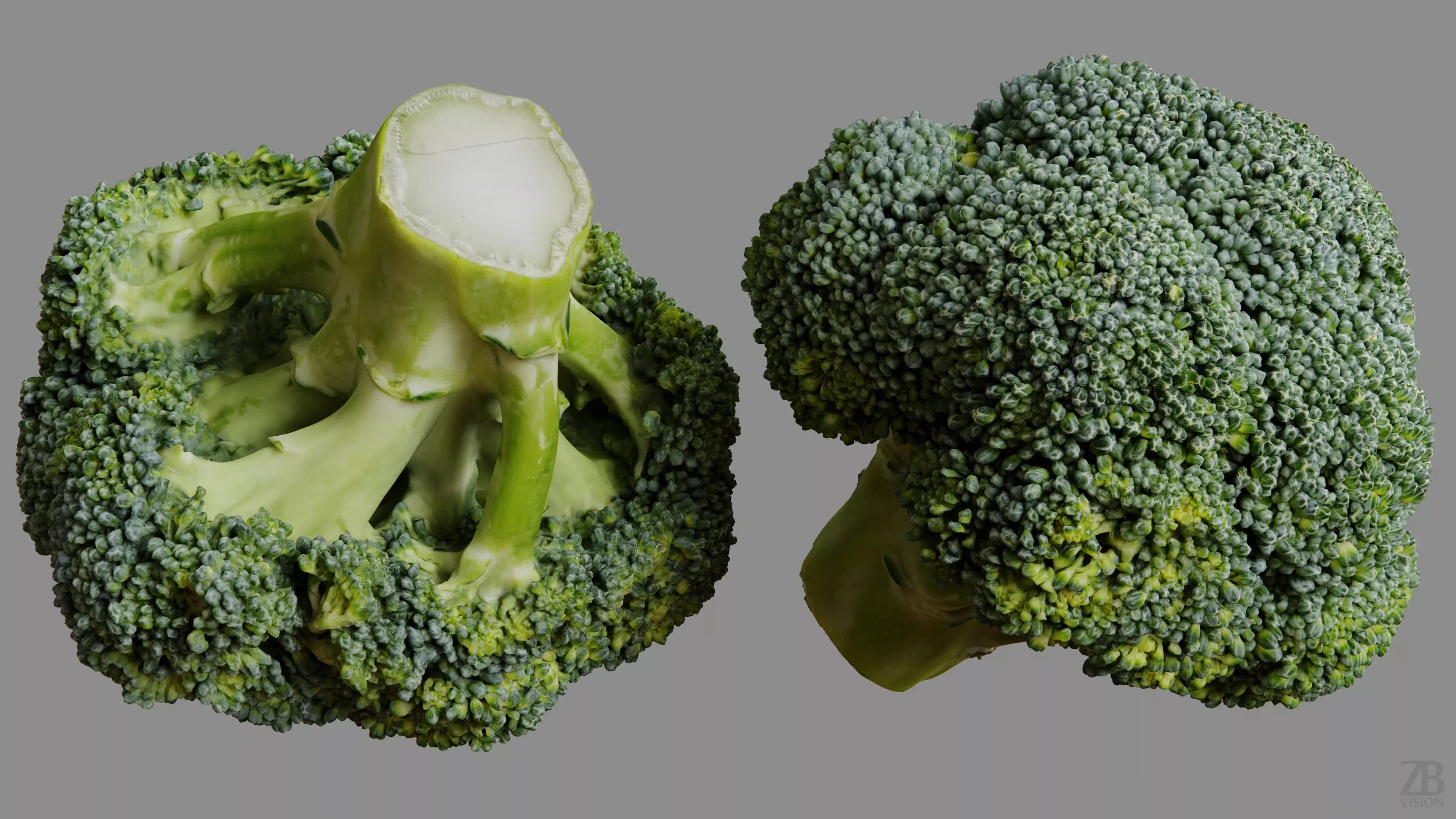 The broccoli model is presented as a single mesh in 3 subdivision levels: low, mid, and high. Meshes are quad-based. The polycounts are 7K, 112K, and 1796K. The high-detail model is included in .max, .fbx, and .obj formats. RAW scan is included in .obj format.
